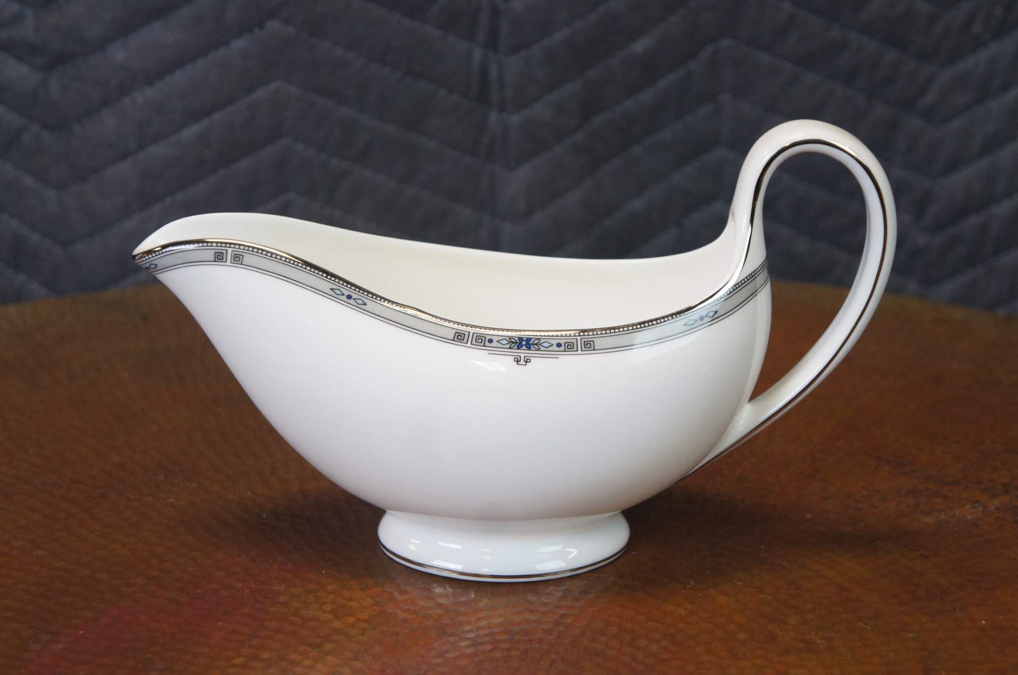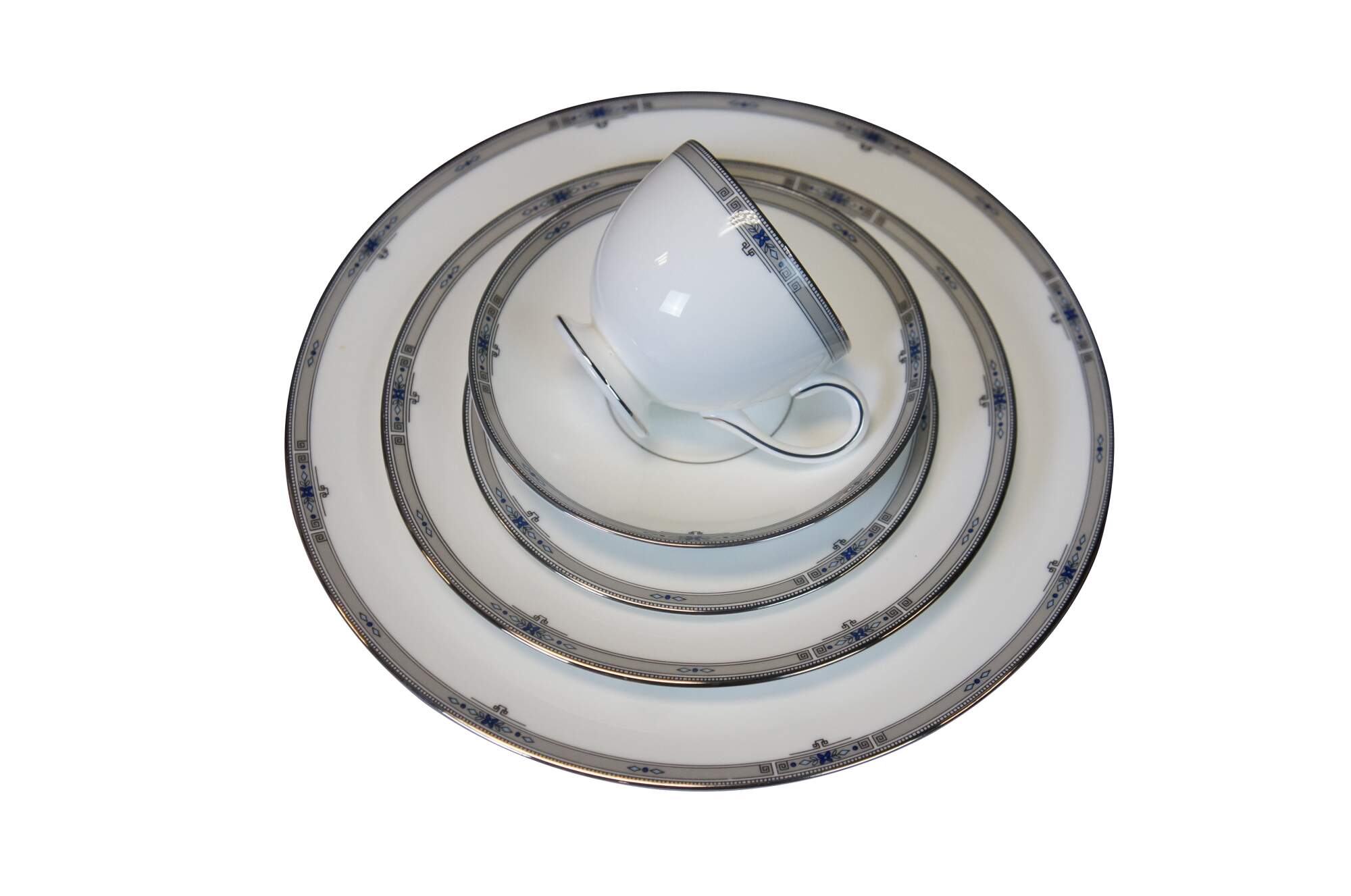 Late 20th century 23 piece lot of Wedgwood china in the platinum trimmed Amherst pattern. Set includes: Coffee Pot with Lid, Sugar Bowl with Lid, Creamer, 4 Teacups, 4 Saucers, 3 Bread Plates, 3 Dinner Plates, 3 Salad Plates, Gravy Boat.