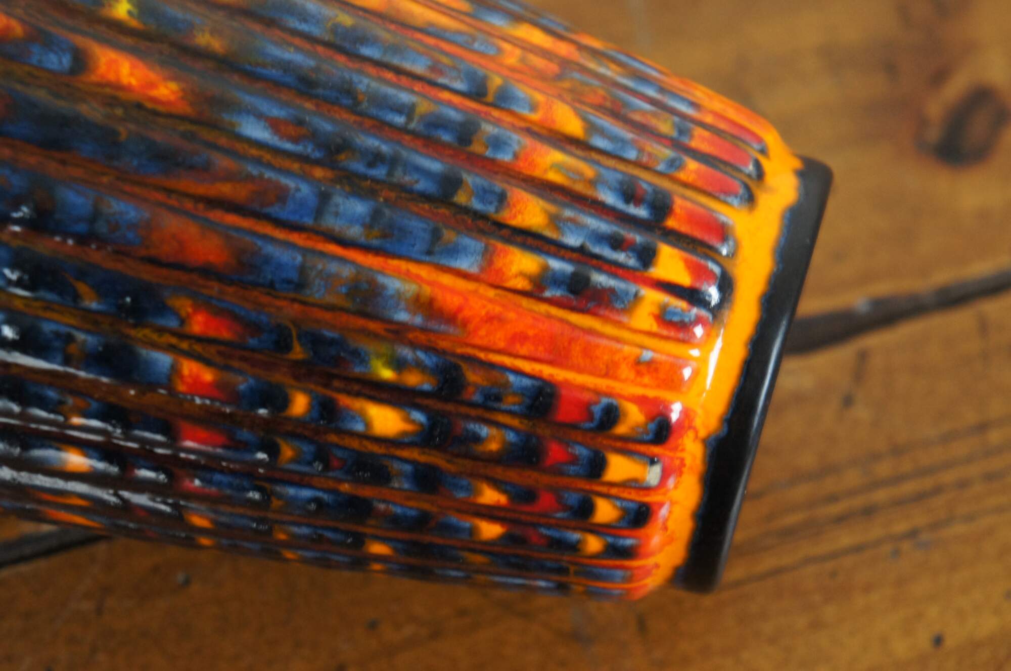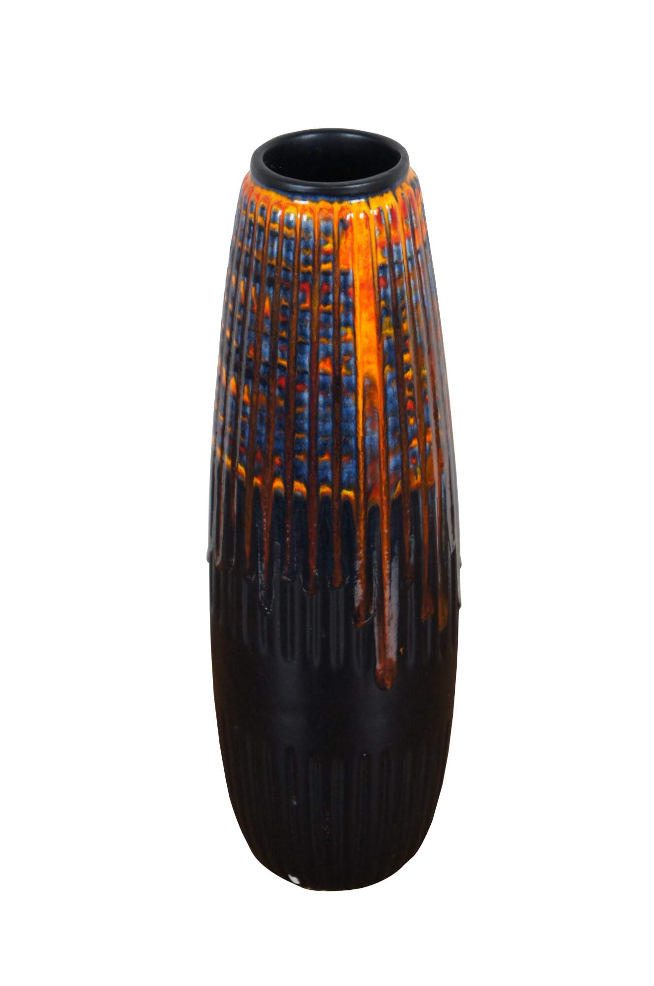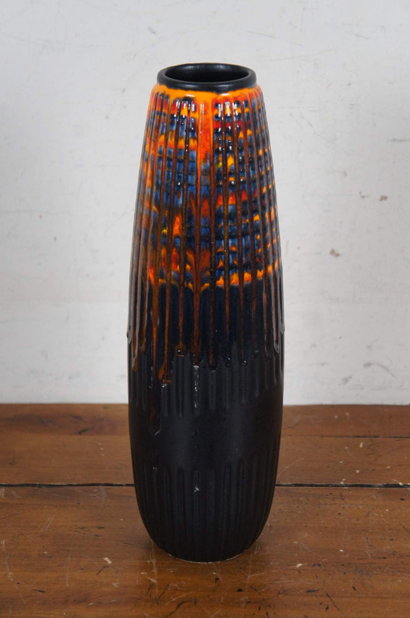 Mid 20th century flower vase by Haeger Potteries. Tall ovoid form in matte black with a grooved / fluted surface and a drip glaze in orange, blue, and red. The Peacock Glaze was created by Royal Hickman and introduced by Haeger in 1966. Numbered 25H.