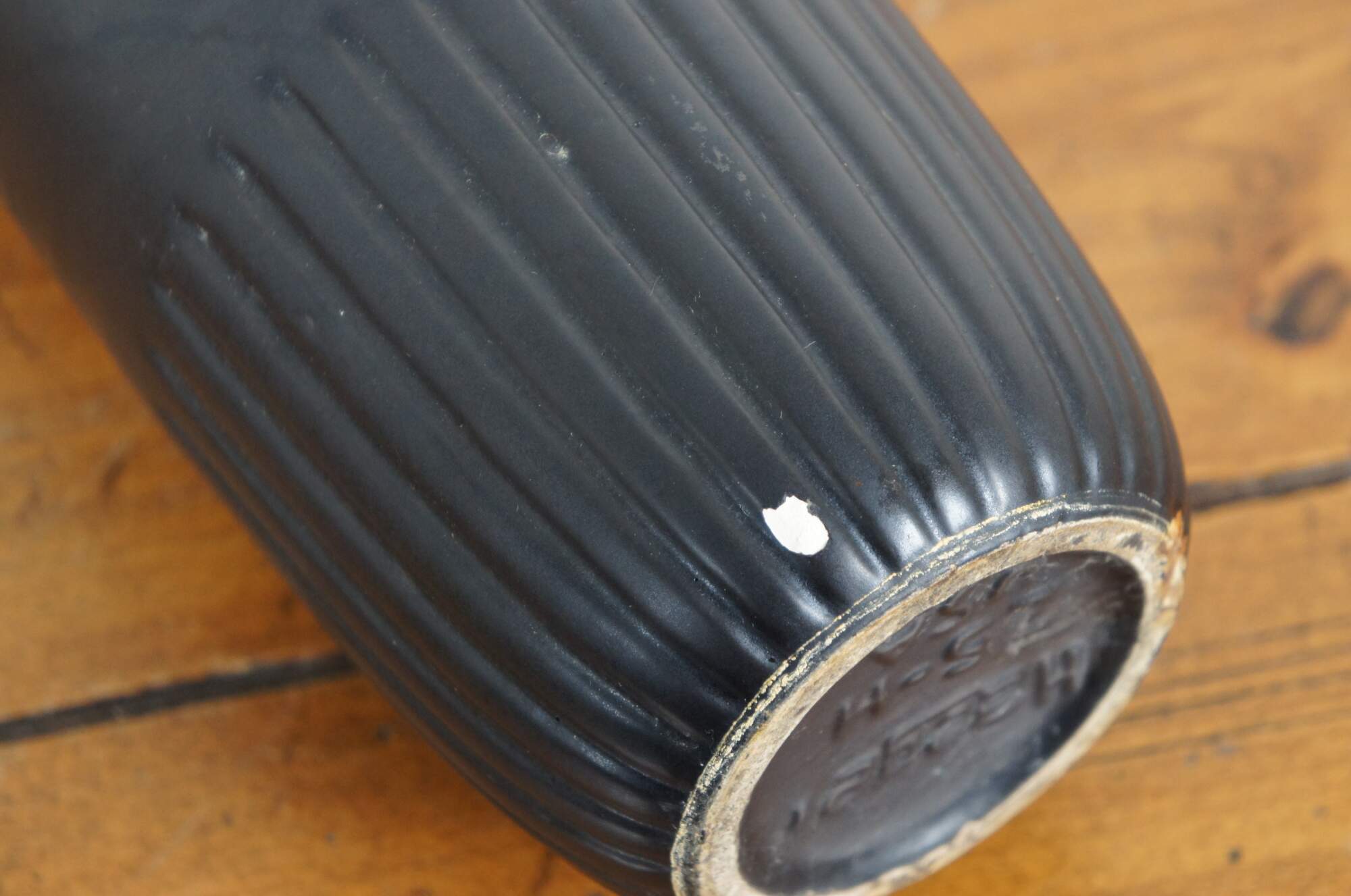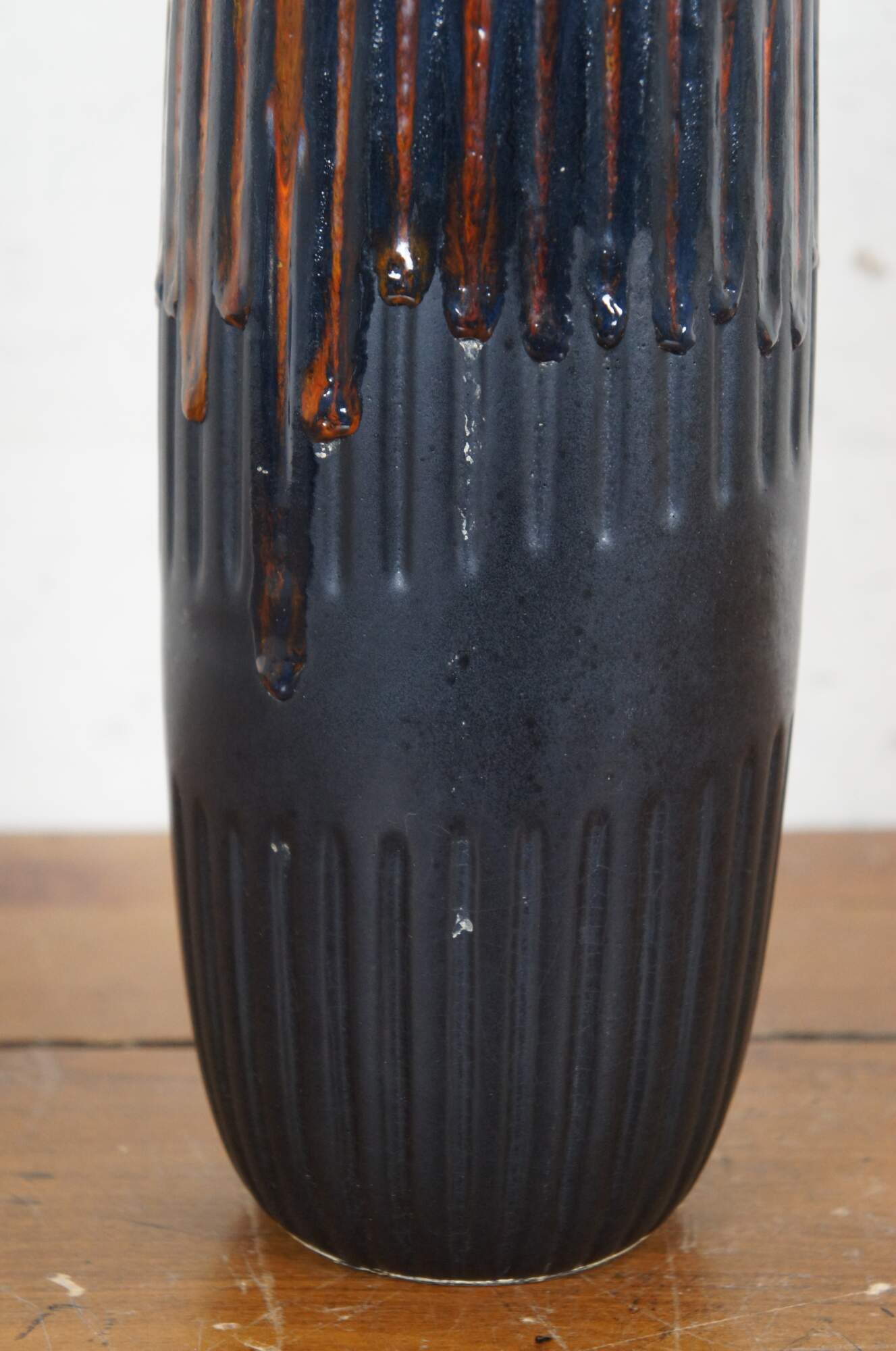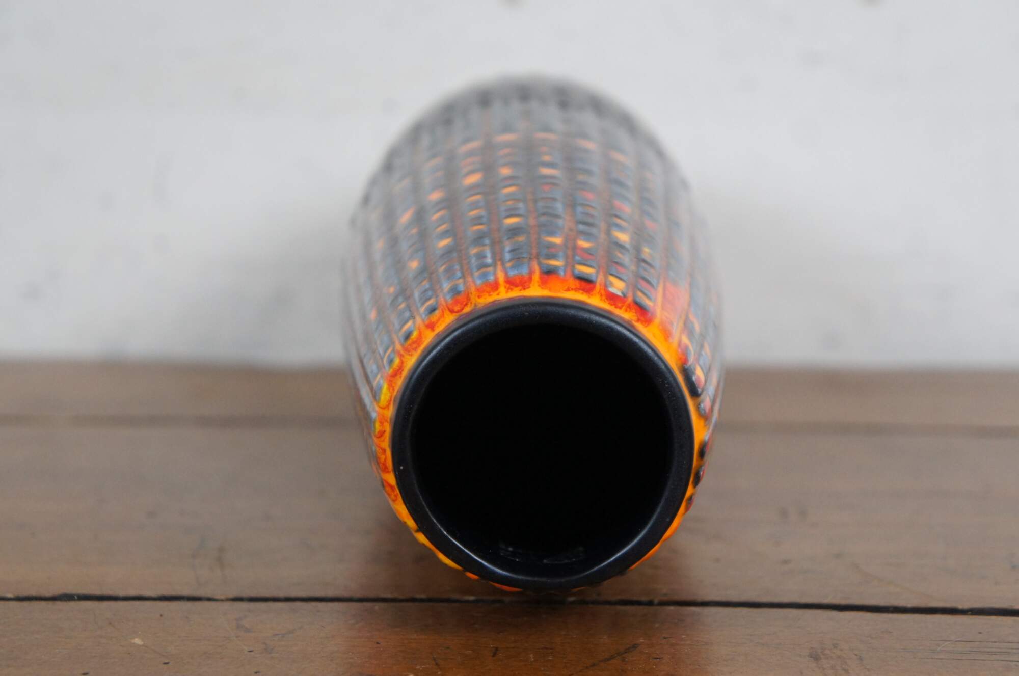 Mid 20th century flower vase by Haeger Potteries. Tall ovoid form in matte black with a grooved / fluted surface and a drip glaze in orange, blue, and red. The Peacock Glaze was created by Royal Hickman and introduced by Haeger in 1966. Numbered 25H.