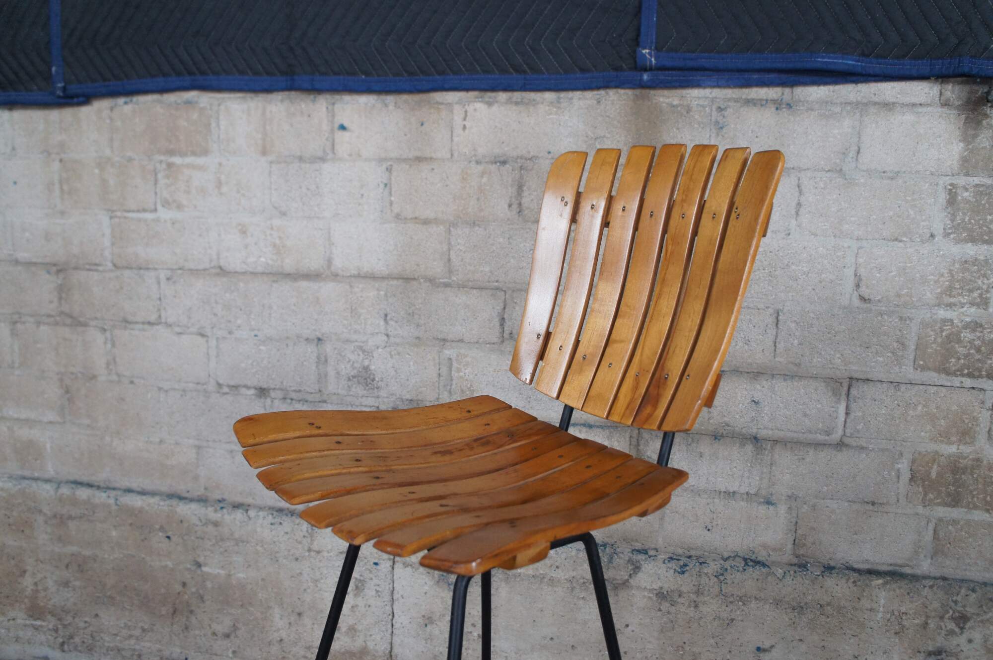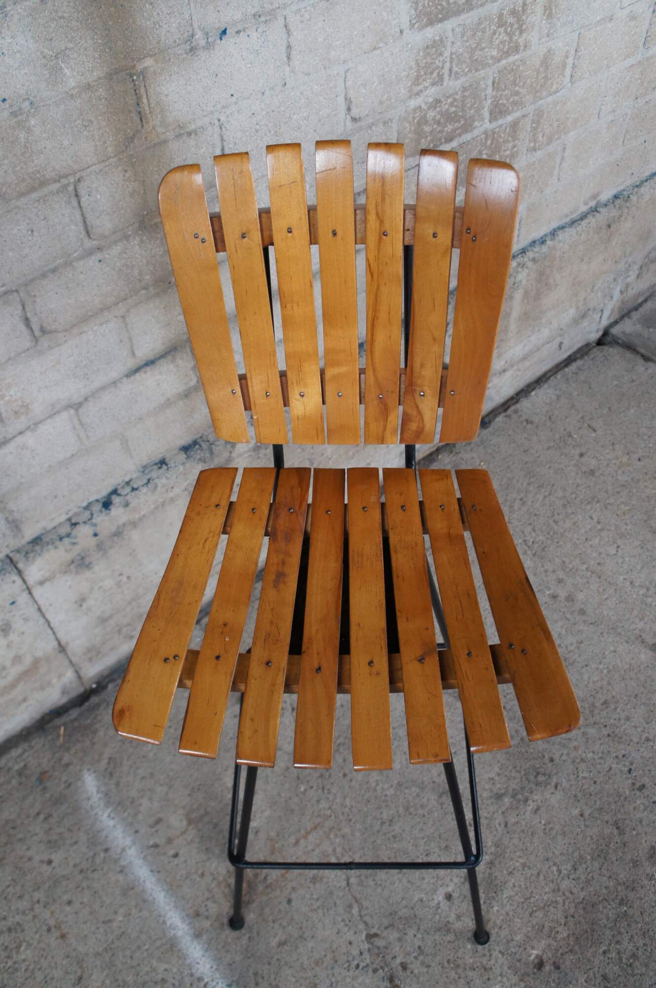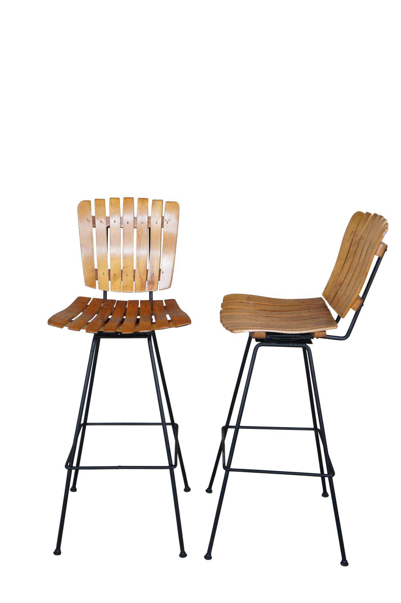 A beautiful set of four slatted wood and iron bar stools. Attributed to Arthur Umanoff, circa 1970s. Feature a swivel seat.