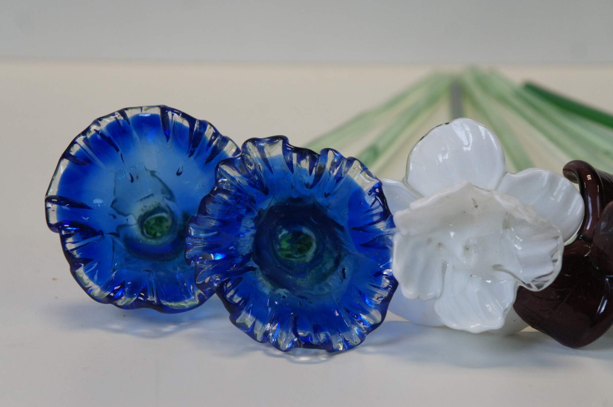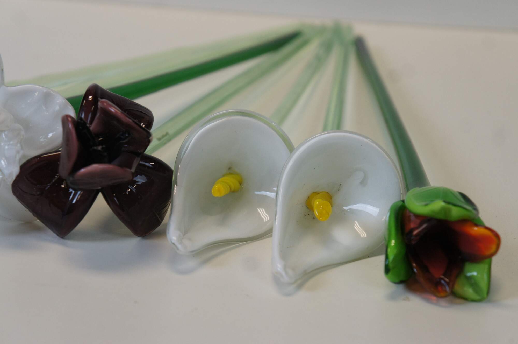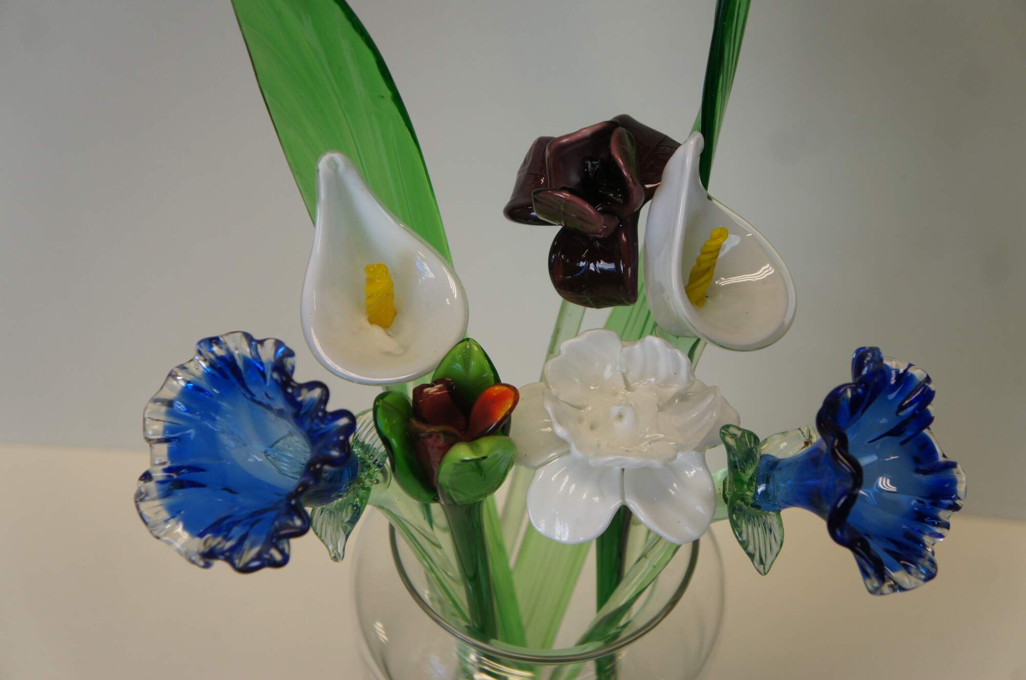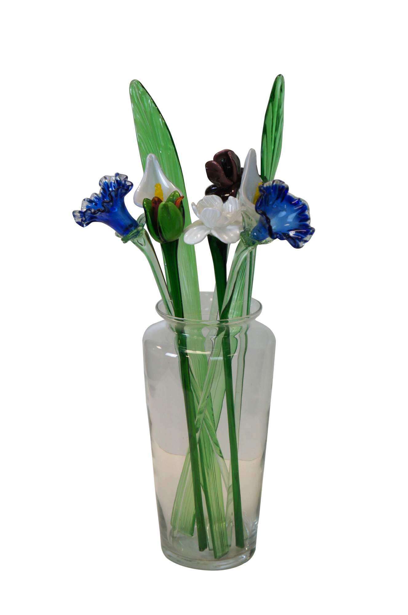Assorted selection of hand blown, long stem, Murano art glass flowers (7) and pair of leaves (2), displayed in a simple clear vase (1). Blossoms include, tulip, daffodil, calla lily and iris. Made in Italy.