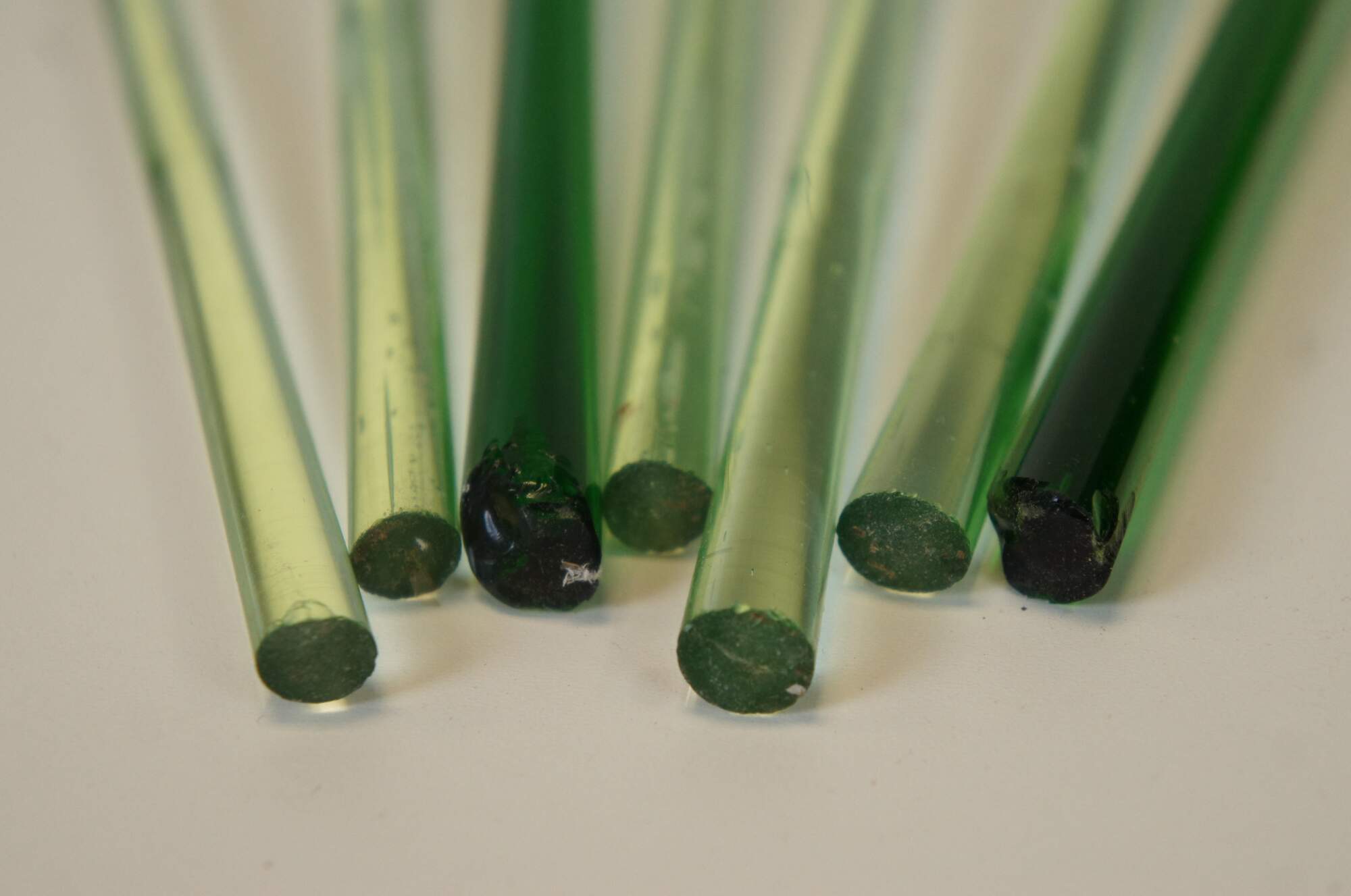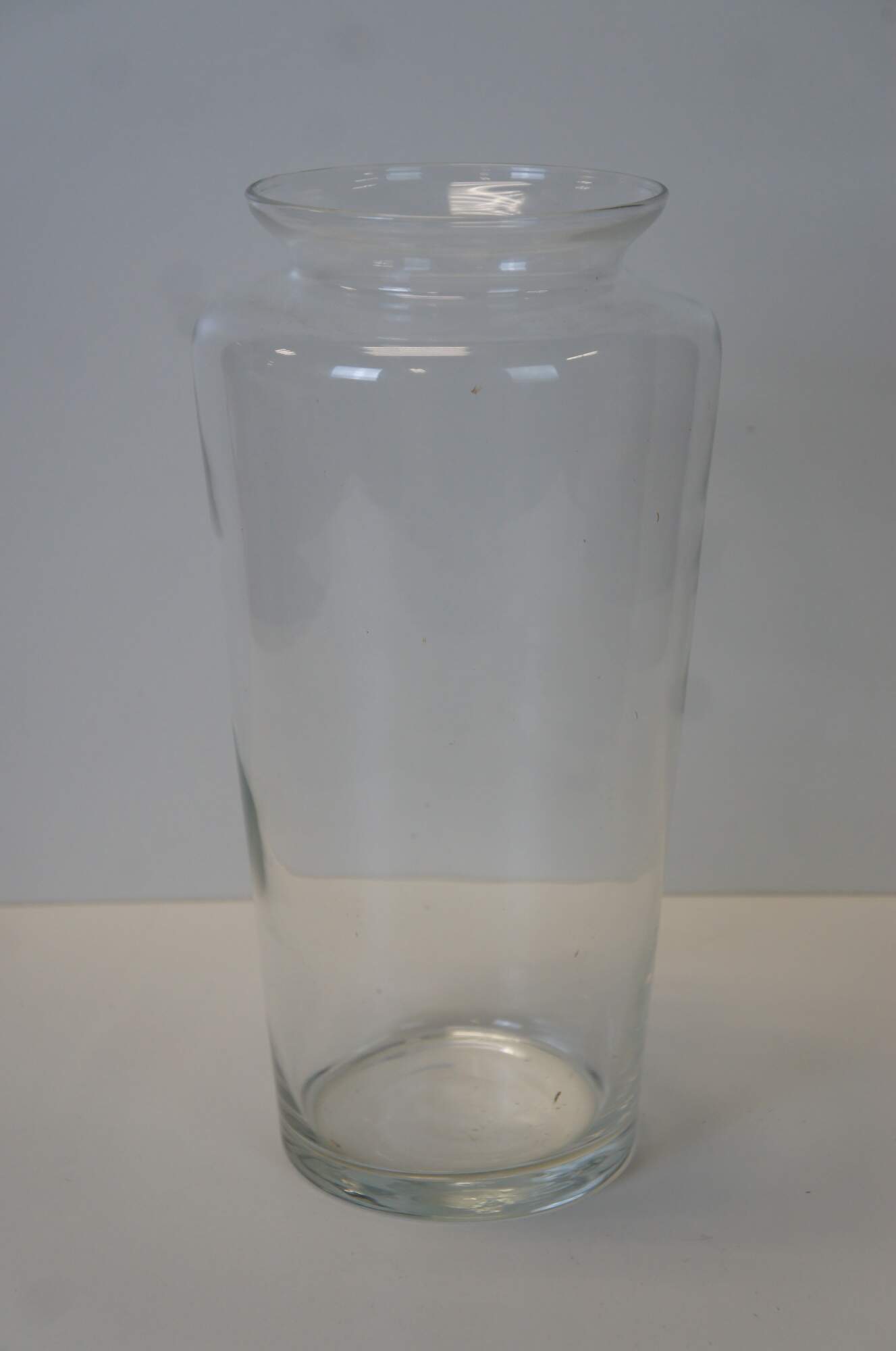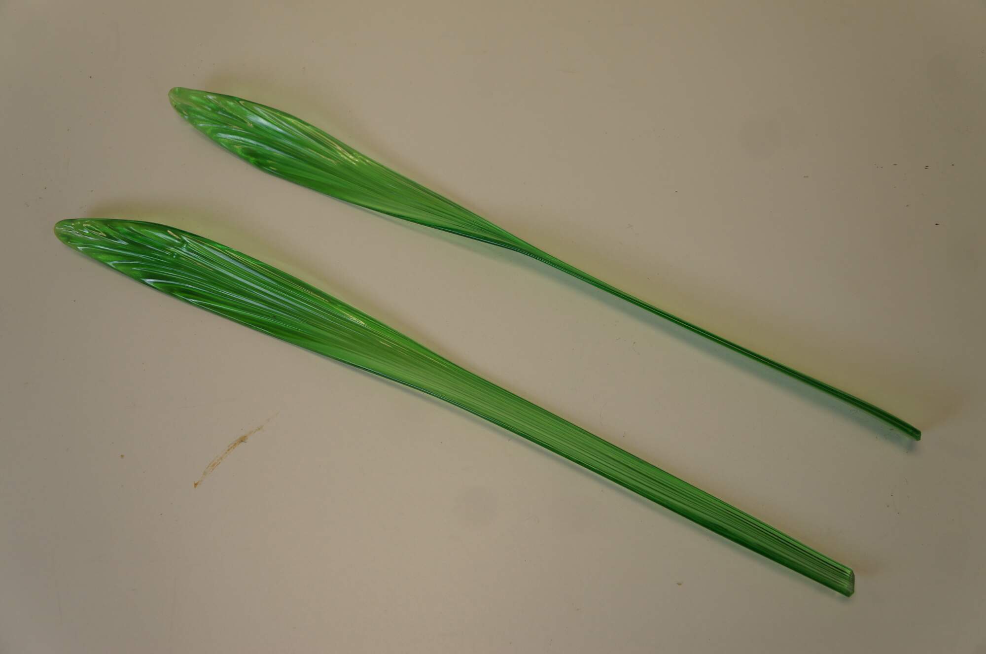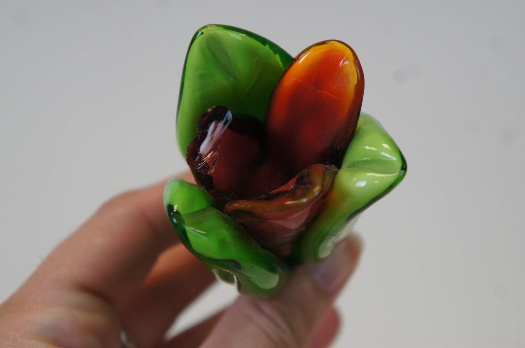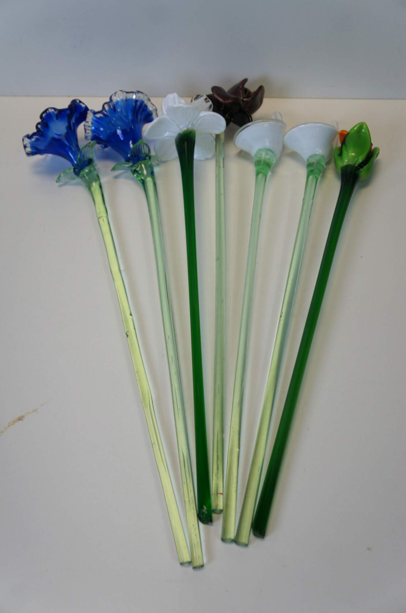 Assorted selection of hand blown, long stem, Murano art glass flowers (7) and pair of leaves (2), displayed in a simple clear vase (1). Blossoms include, tulip, daffodil, calla lily and iris. Made in Italy.
