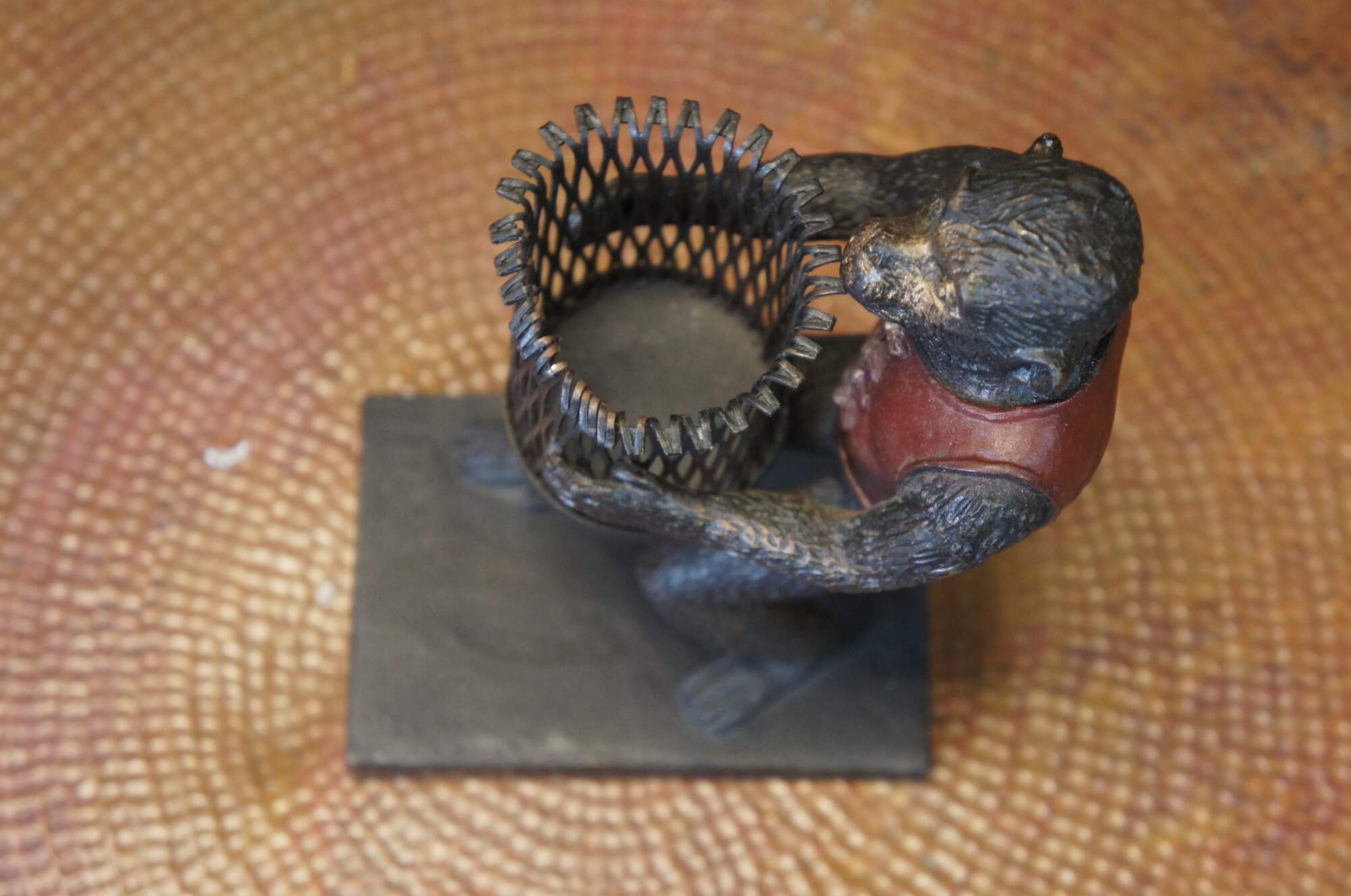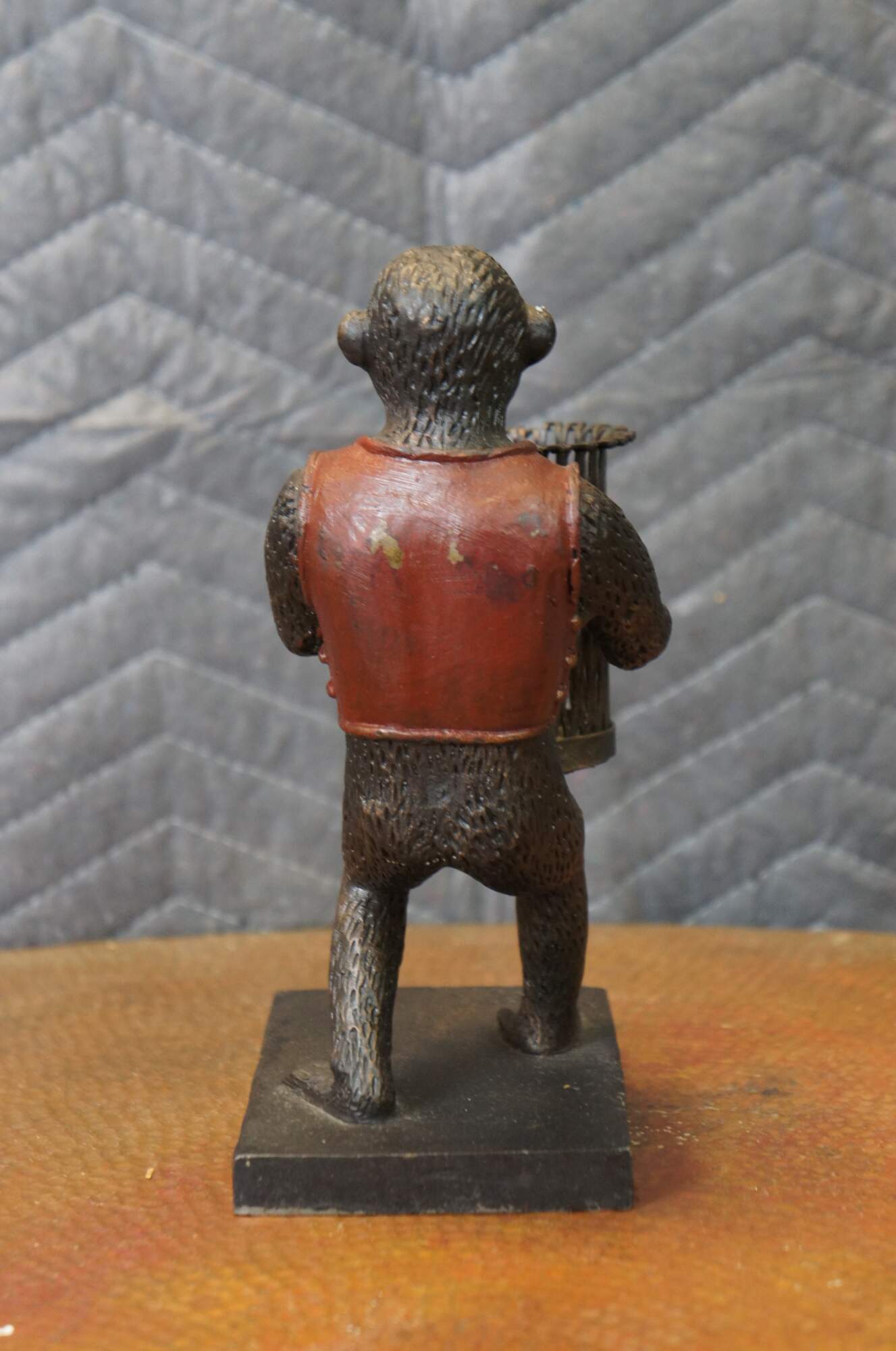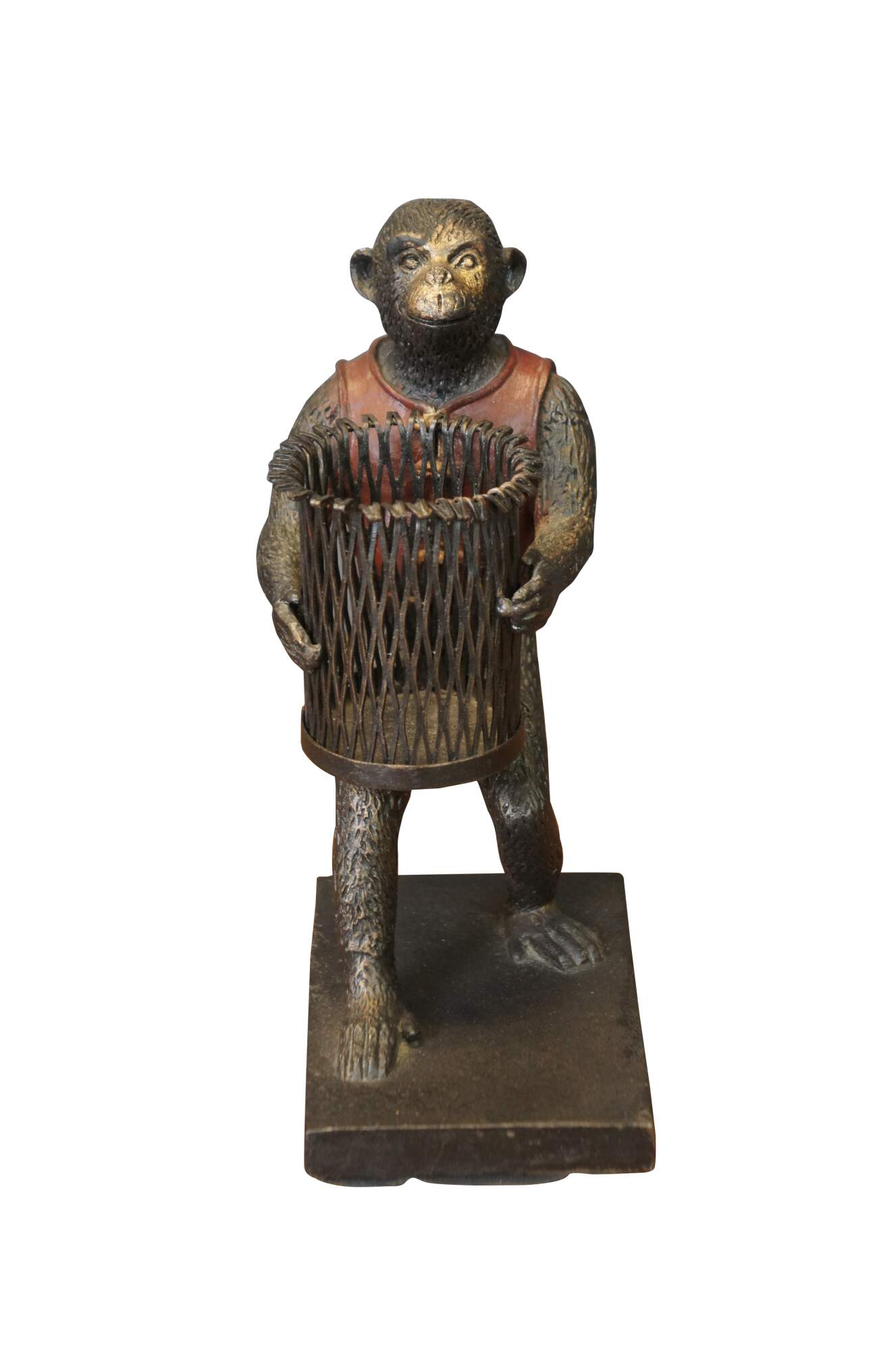 Late 20th century bronze figurine / votive candholder / toothpick / pen holder / library bookend in the shape of a monkey / chimpanzee wearing a red vest, carrying a cylindrical basket, standing on a rectangular base. Attibuted to Maitland Smith.