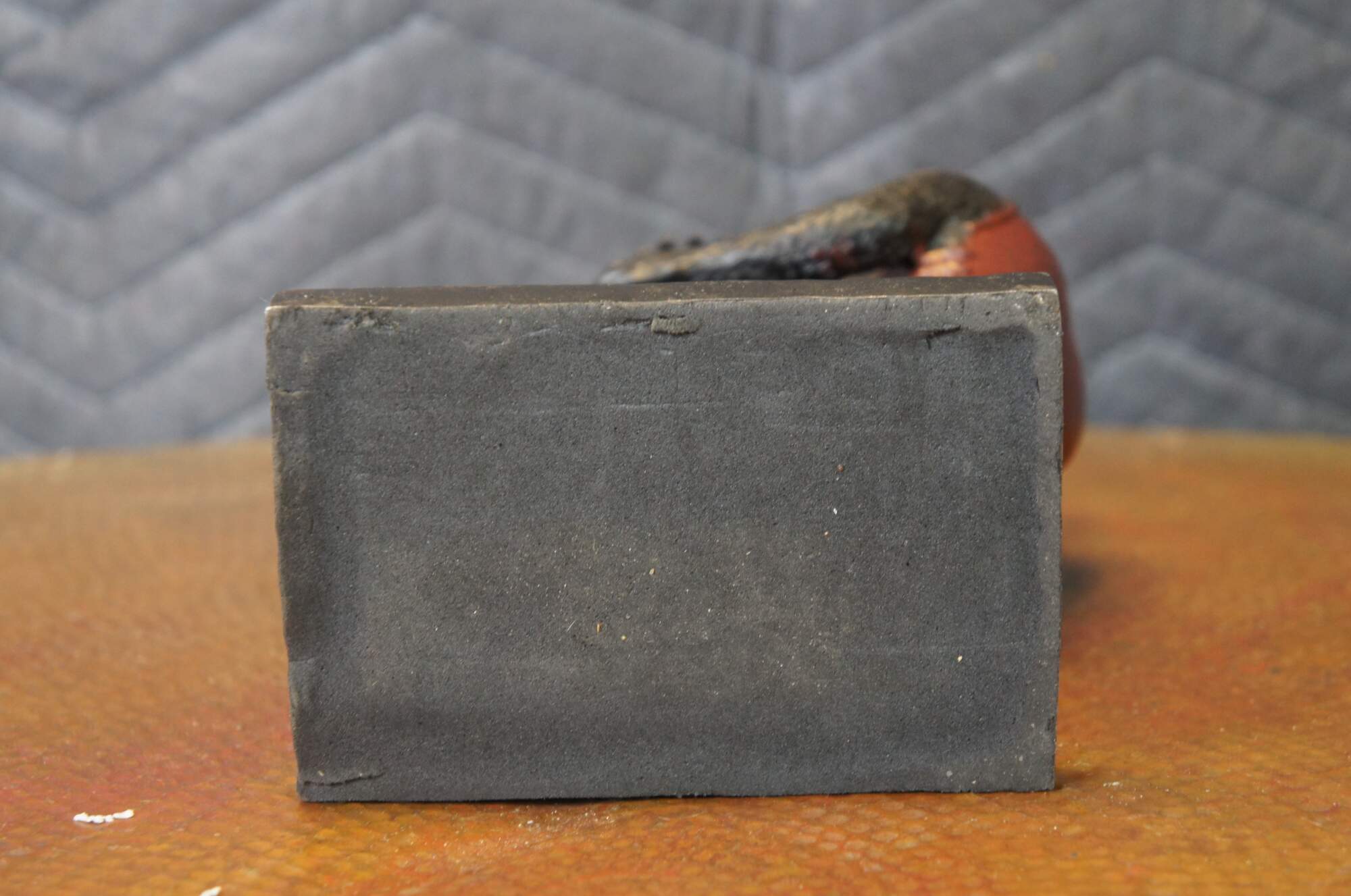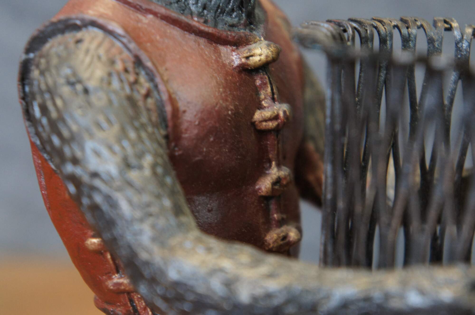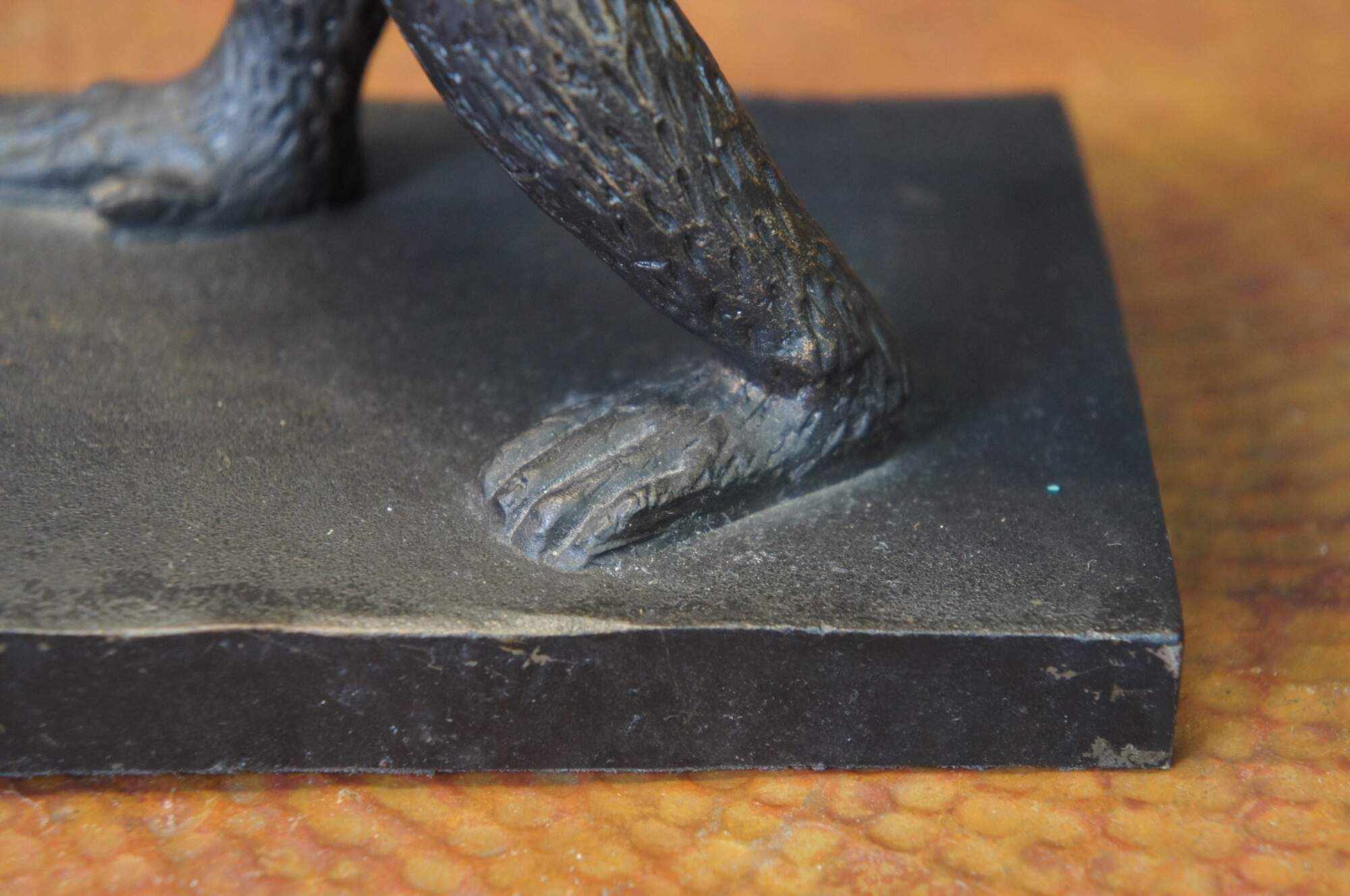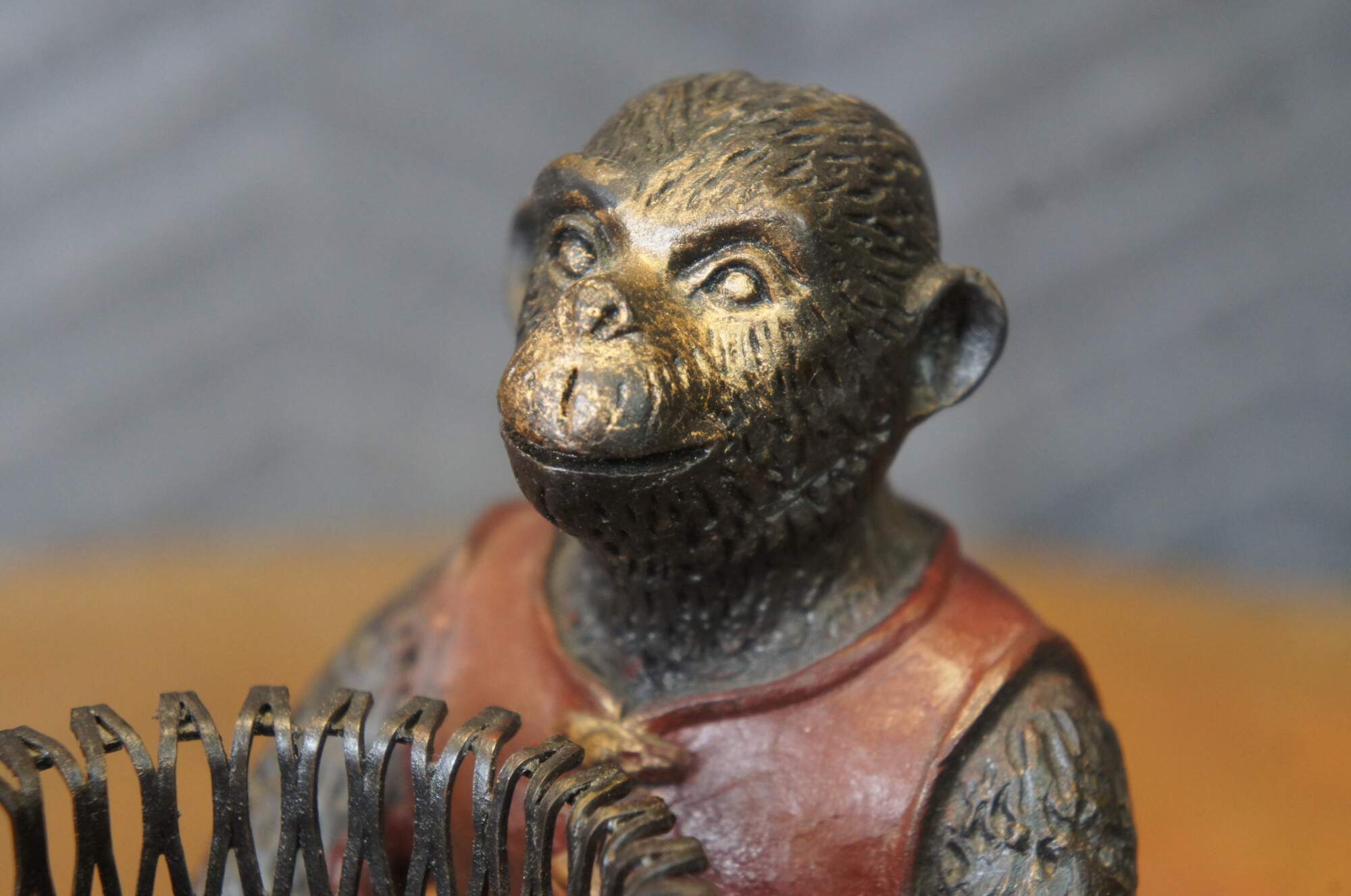Late 20th century bronze figurine / votive candholder / toothpick / pen holder / library bookend in the shape of a monkey / chimpanzee wearing a red vest, carrying a cylindrical basket, standing on a rectangular base. Attibuted to Maitland Smith.