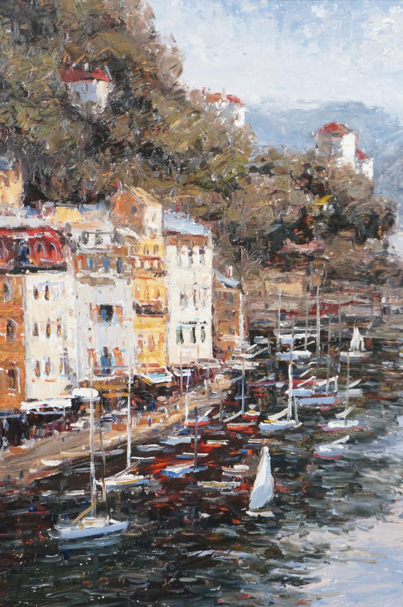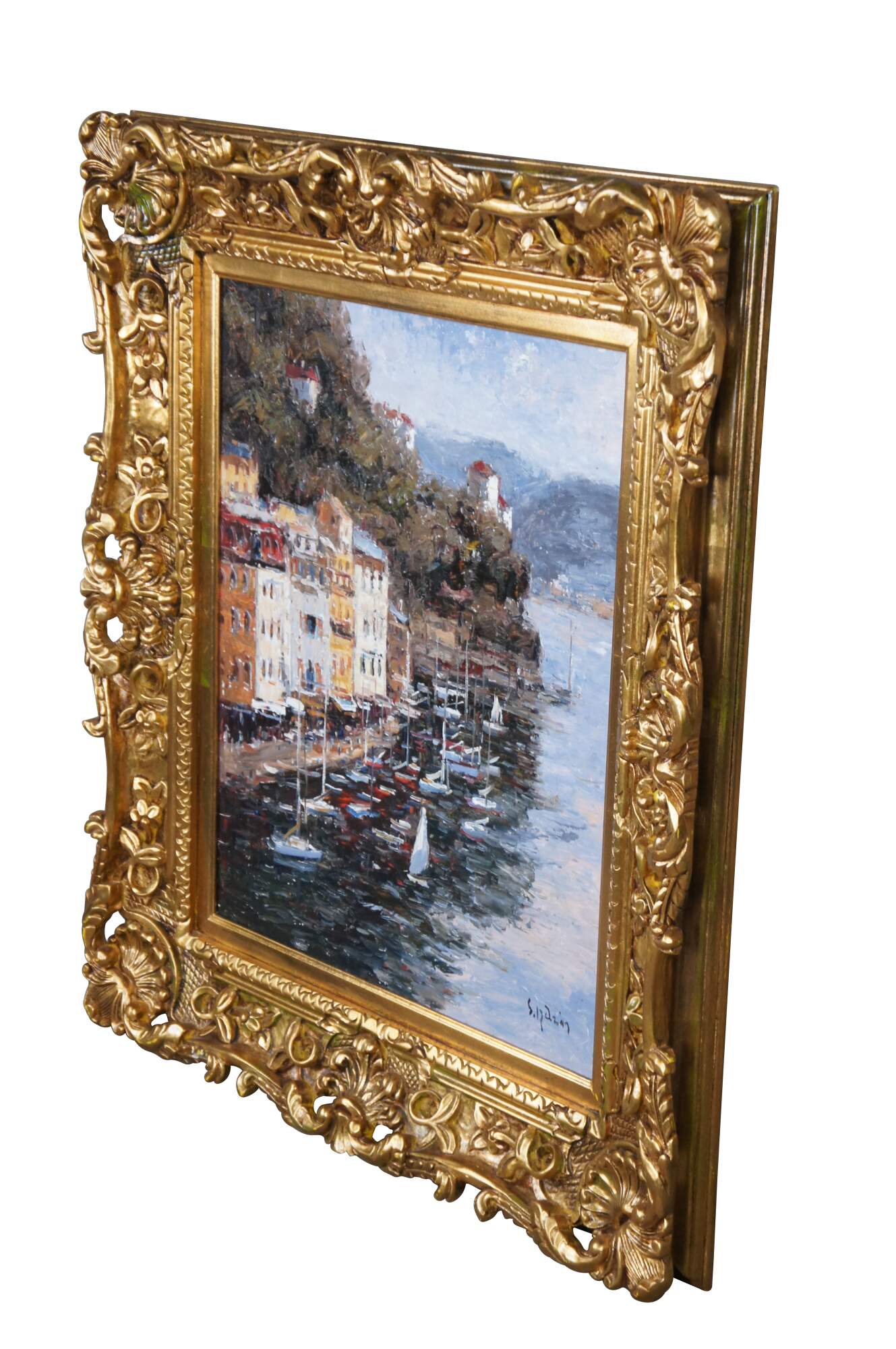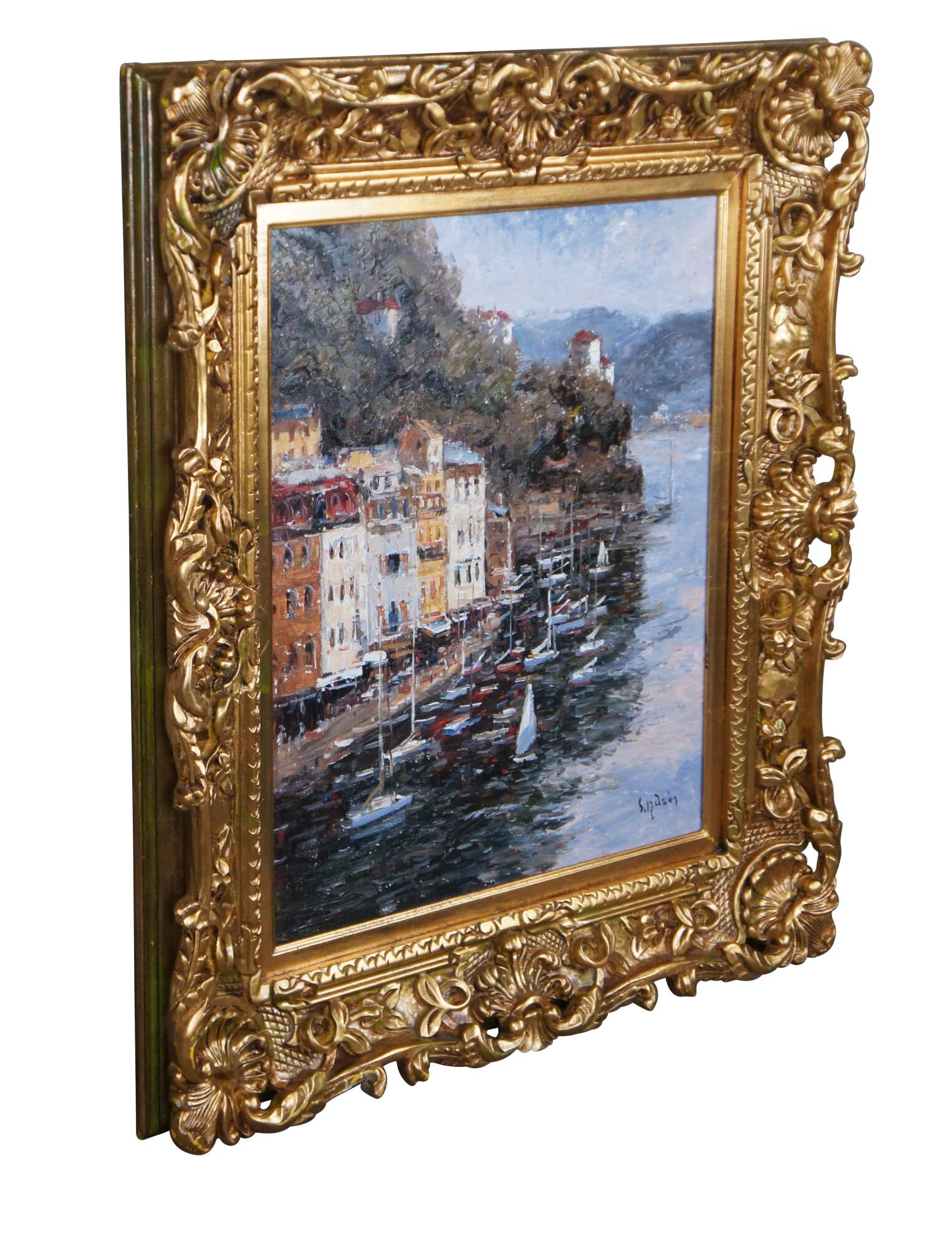 An impressionist seascape, signed lower right. The painting is on canvas and features a coastal town showing parts of the cityscape with sailboats at the port. Signed lower right. Famred in gold with acanthus and scalloped detail.