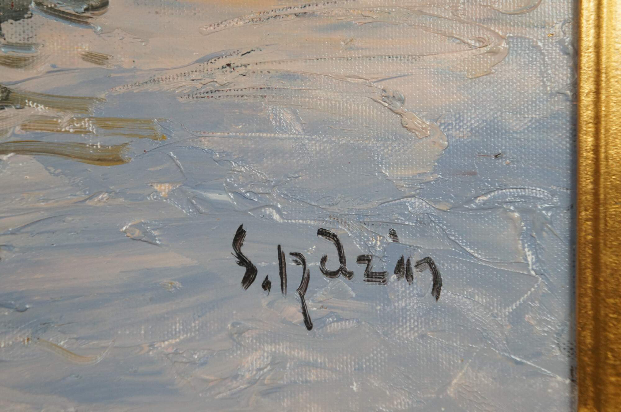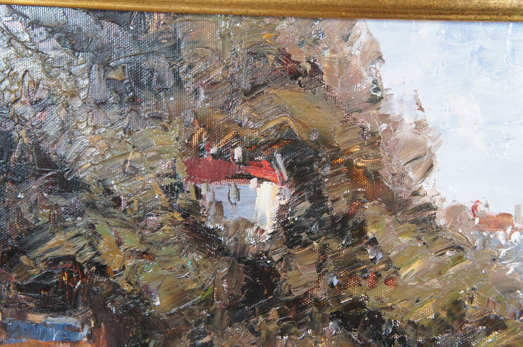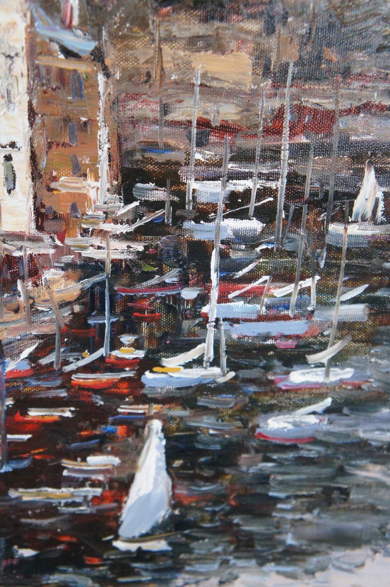 An impressionist seascape, signed lower right. The painting is on canvas and features a coastal town showing parts of the cityscape with sailboats at the port. Signed lower right. Famred in gold with acanthus and scalloped detail.