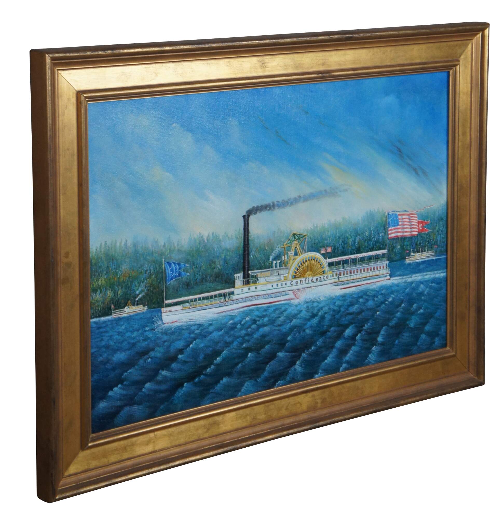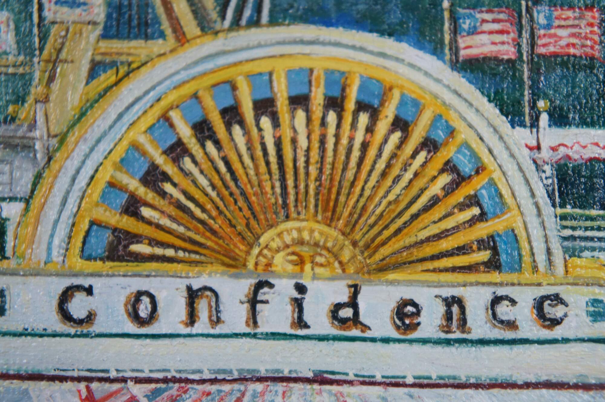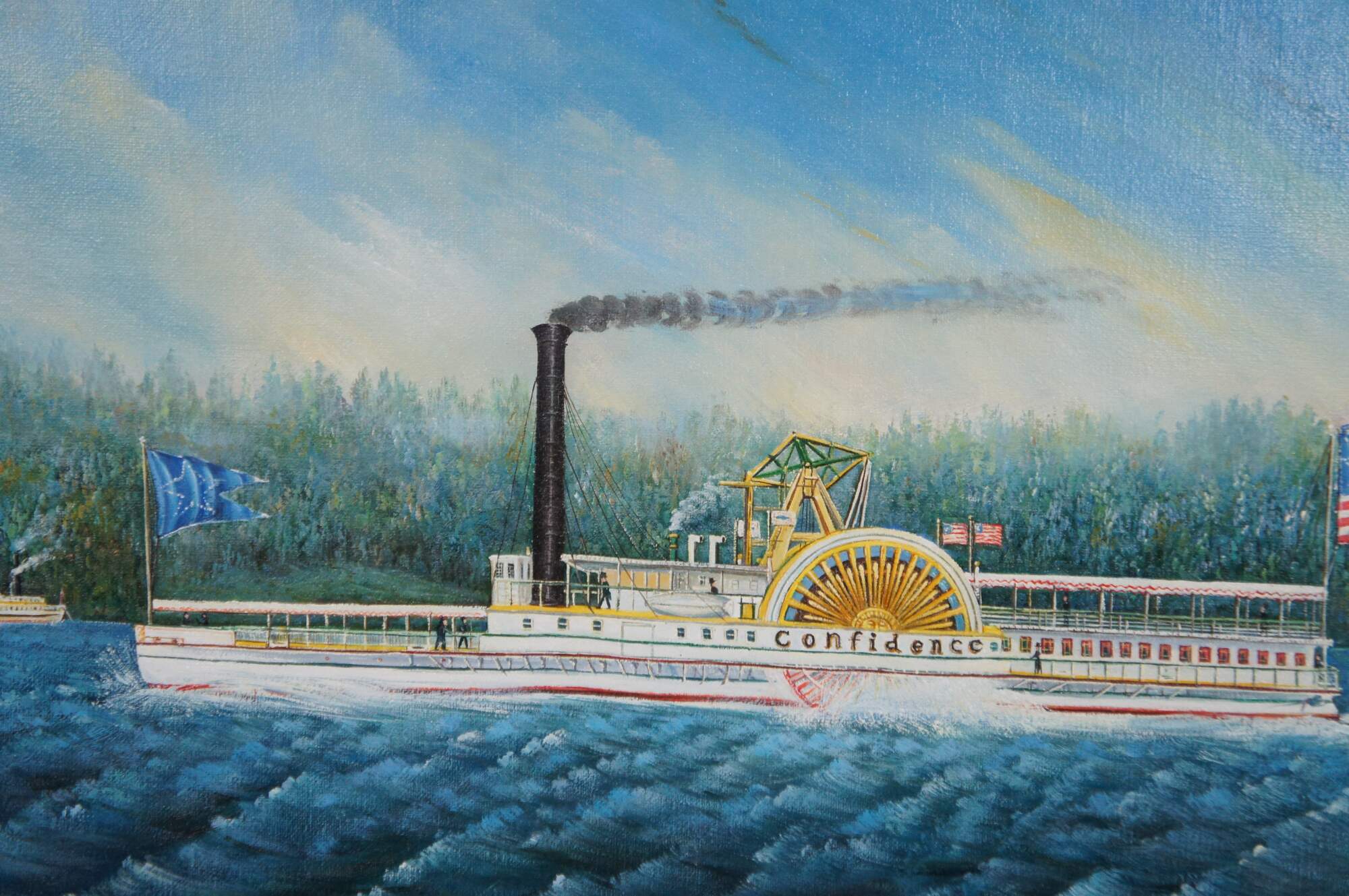 20th Century Portrait Painting of "Confidence" After James Bard. Features a Hudson River Side Wheel moving down water in New York. The oil painting is on canvas and unsigned. Framed in wood with gold finish.
