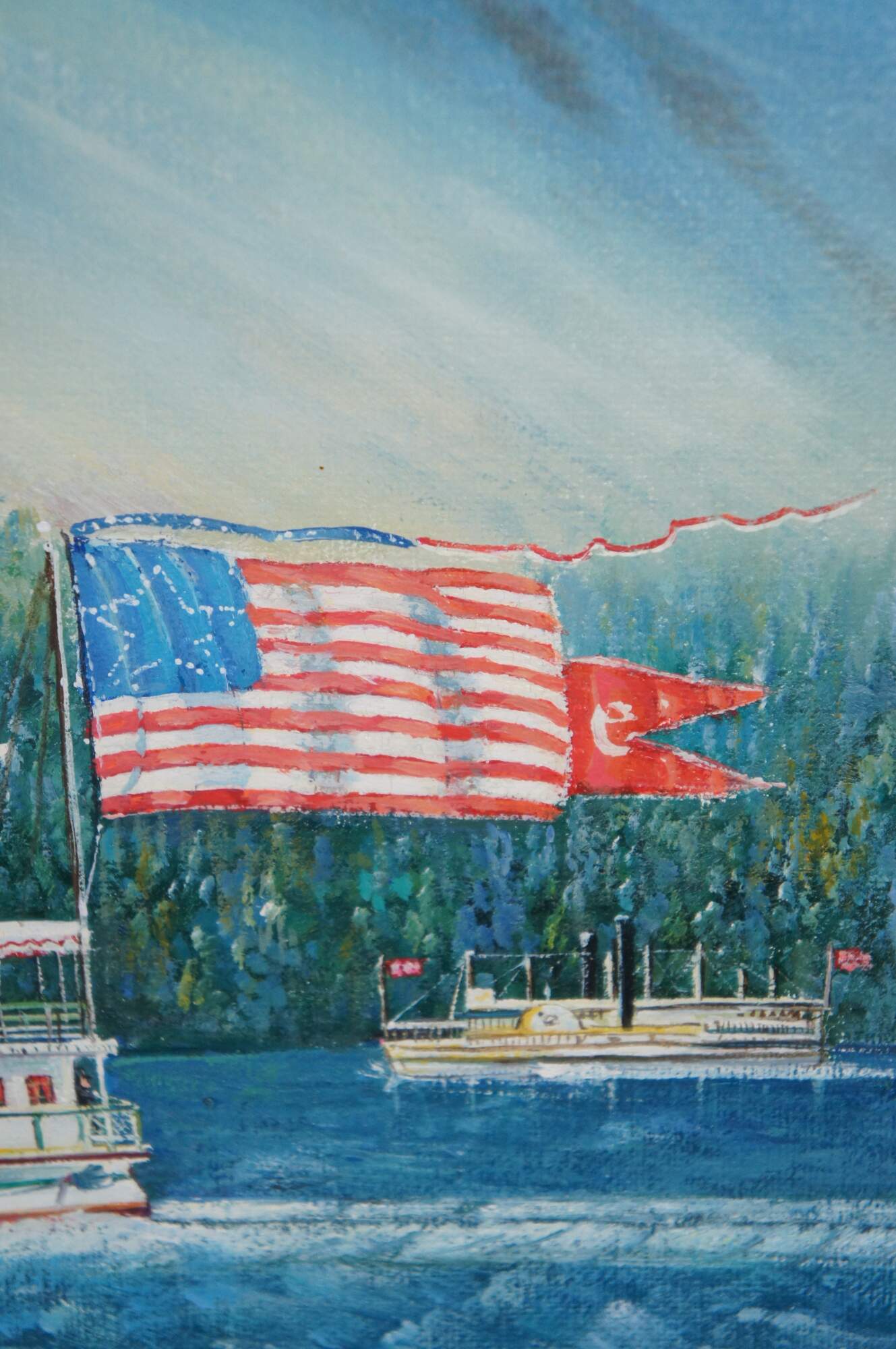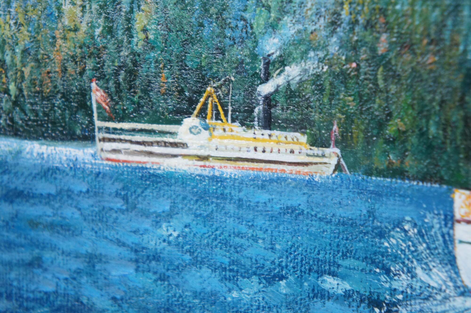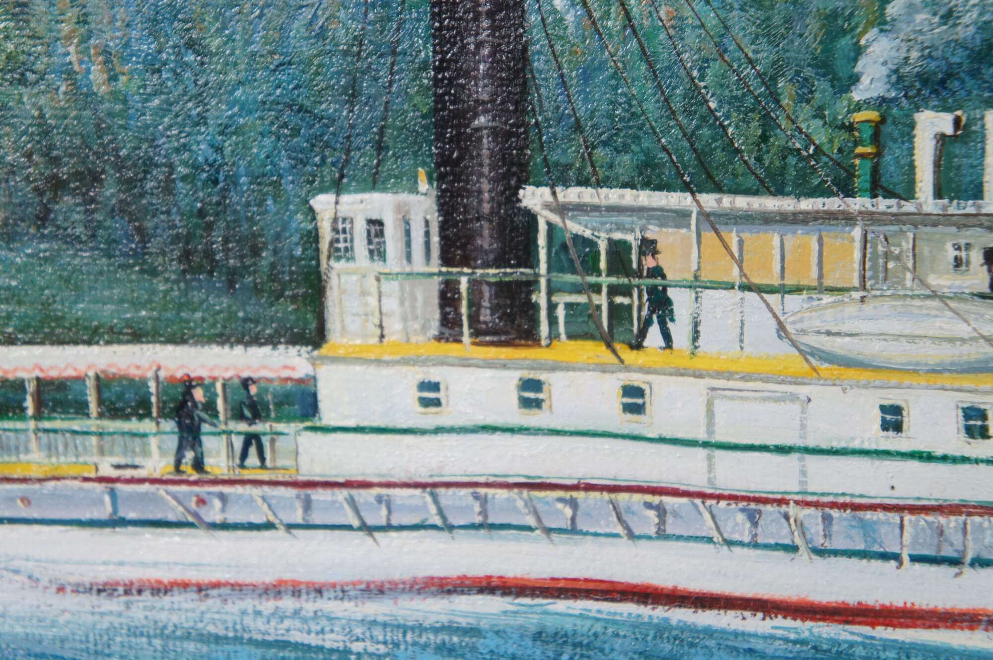 20th Century Portrait Painting of "Confidence" After James Bard. Features a Hudson River Side Wheel moving down water in New York. The oil painting is on canvas and unsigned. Framed in wood with gold finish.