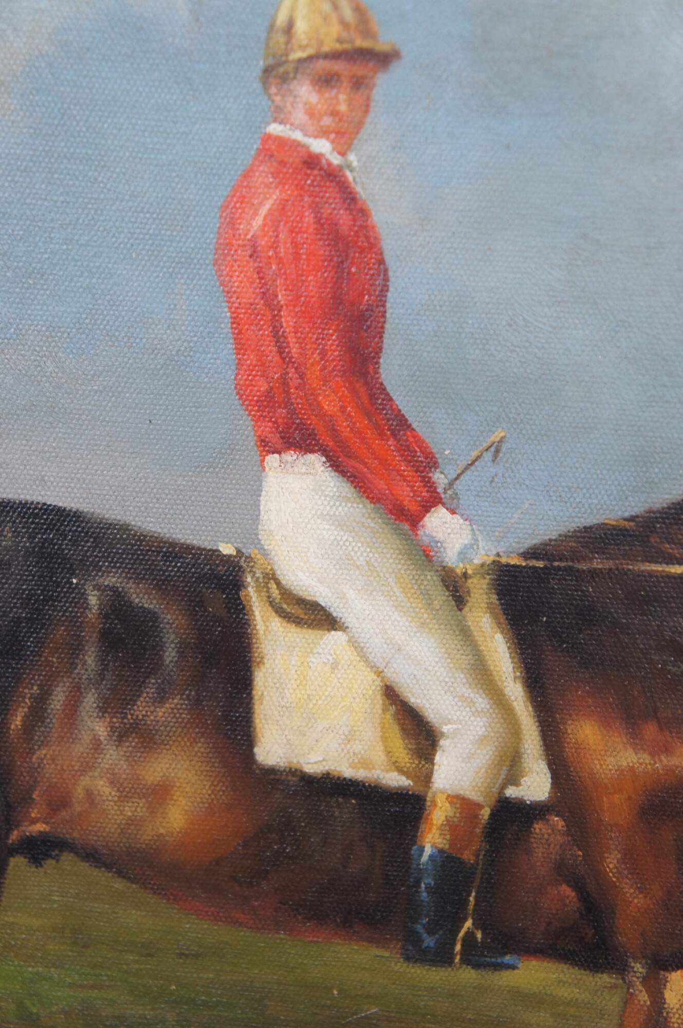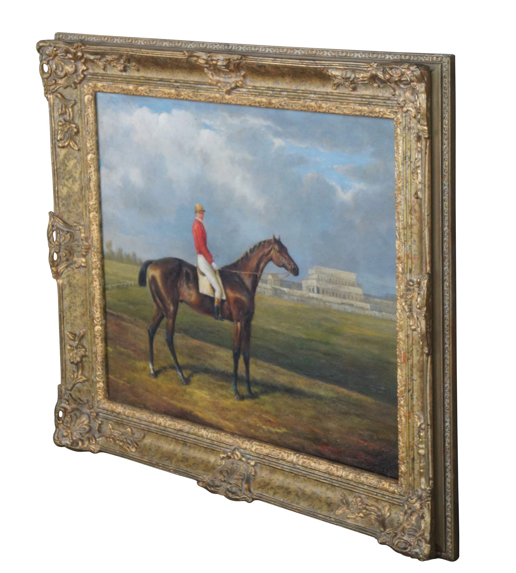 20th Century painting after Benjamin Cam Norton's Rowley Mile. Unsigned. Features a Jockey in red posing on his race horse. The painting is framed in gold.