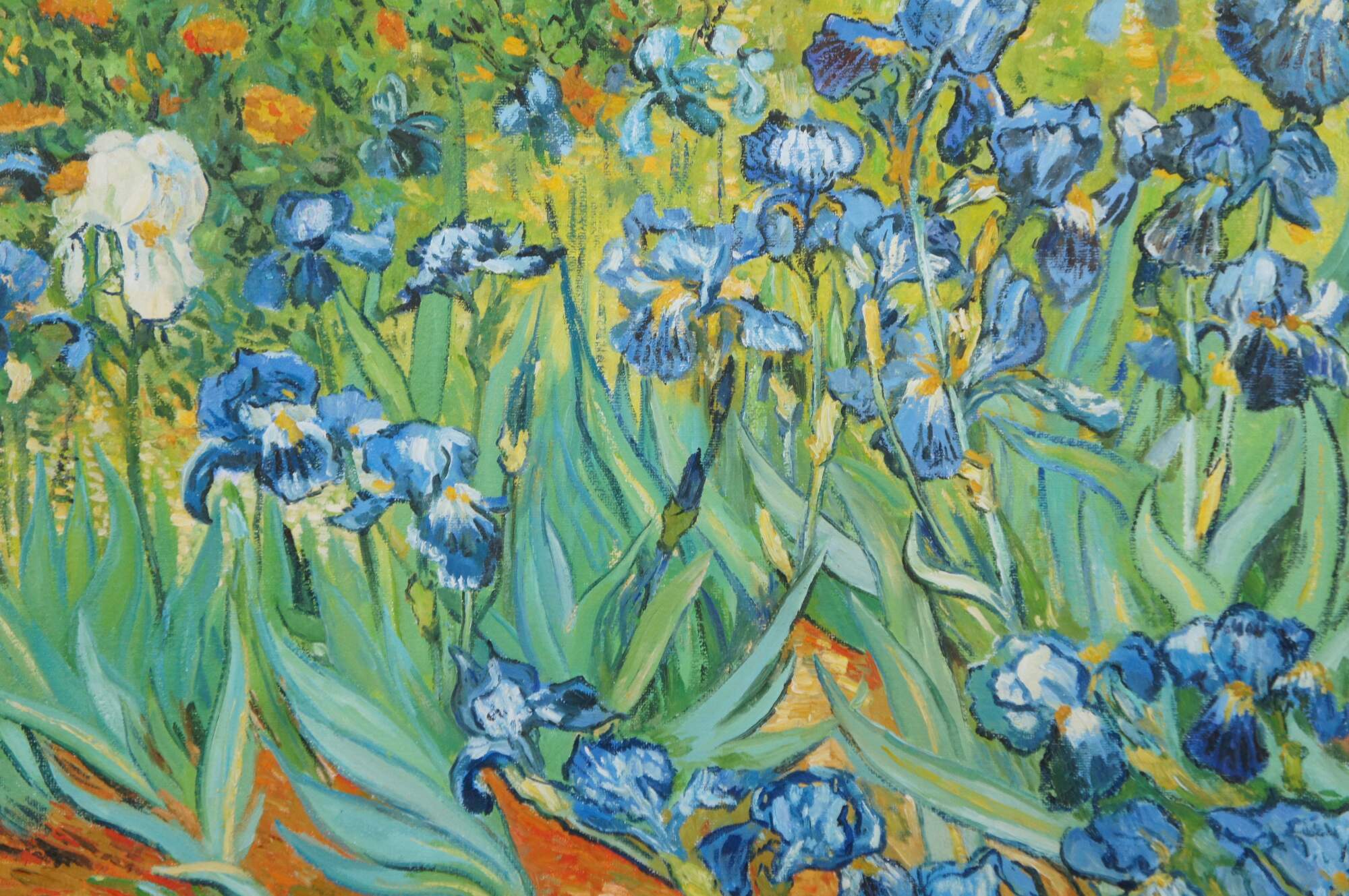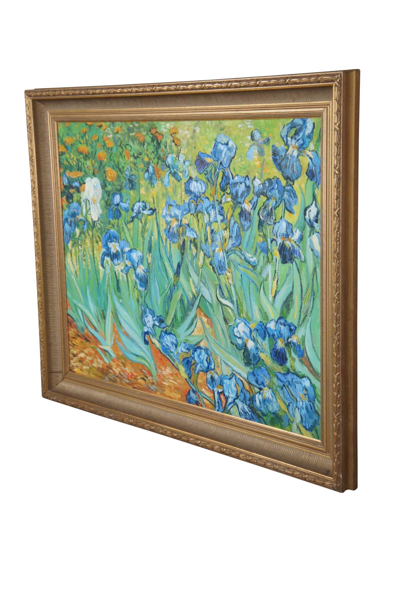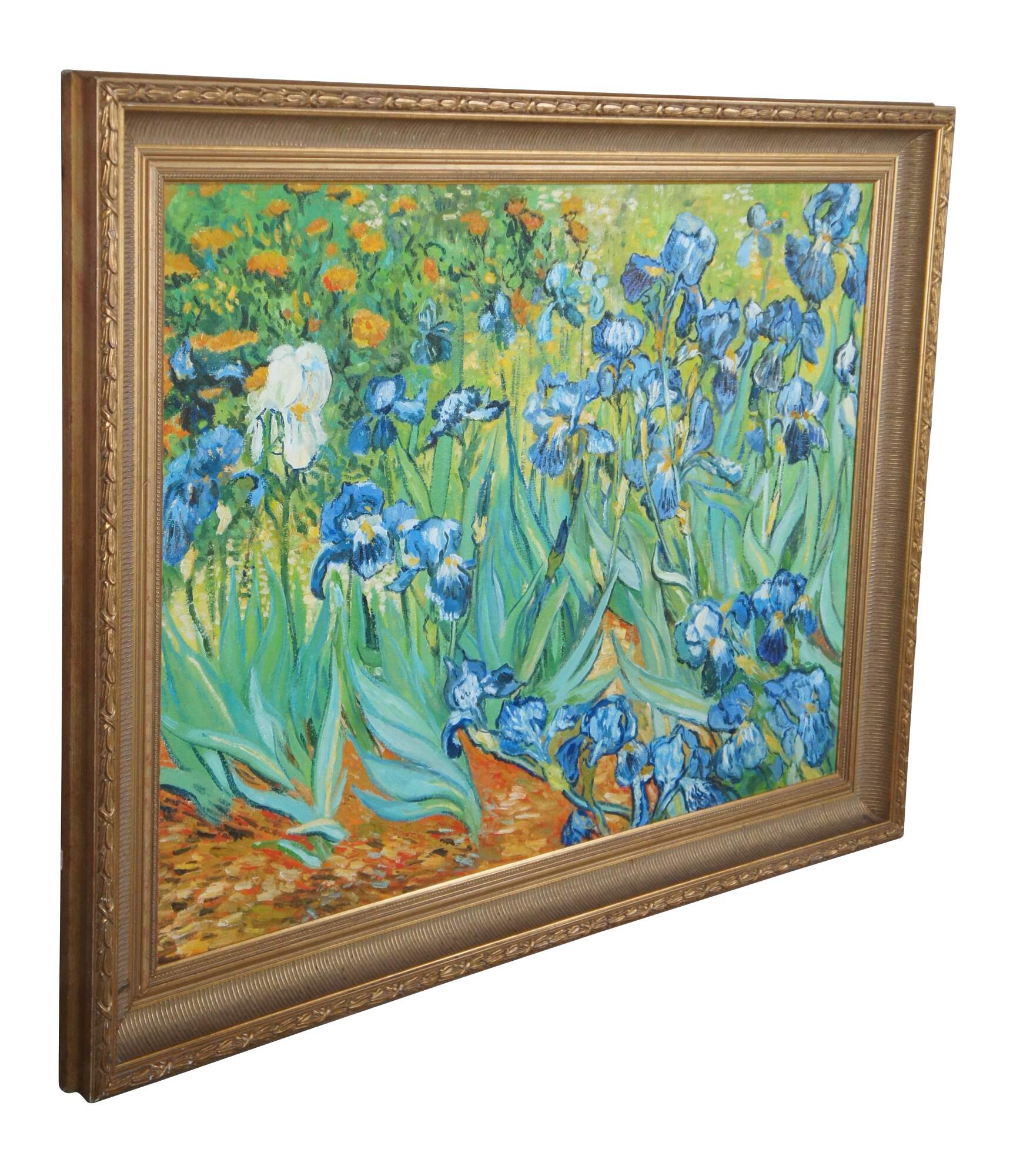 Irises" Contemporary School oil painting after Vincent Van Gogh. An oil on canvas framed in wood with gold finished neoclassical style framed. Unsigned