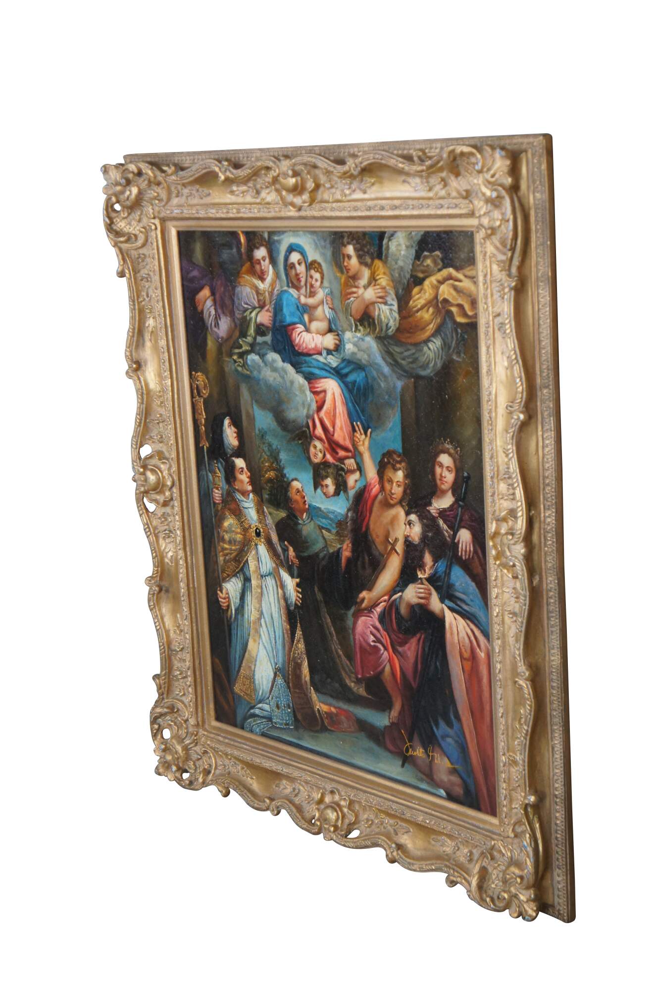 Madonna in Glory with Saints" a Contemporary School oil painting after Anibale Carracci. The oil painting is on canvas with craquelure giving off the appearance of age. Signed lower right and framed in Baroque manner with gold finish. The original was painted during the 16th century and is in the ePinacoteca Nazionale di Bologna collection in Italy.