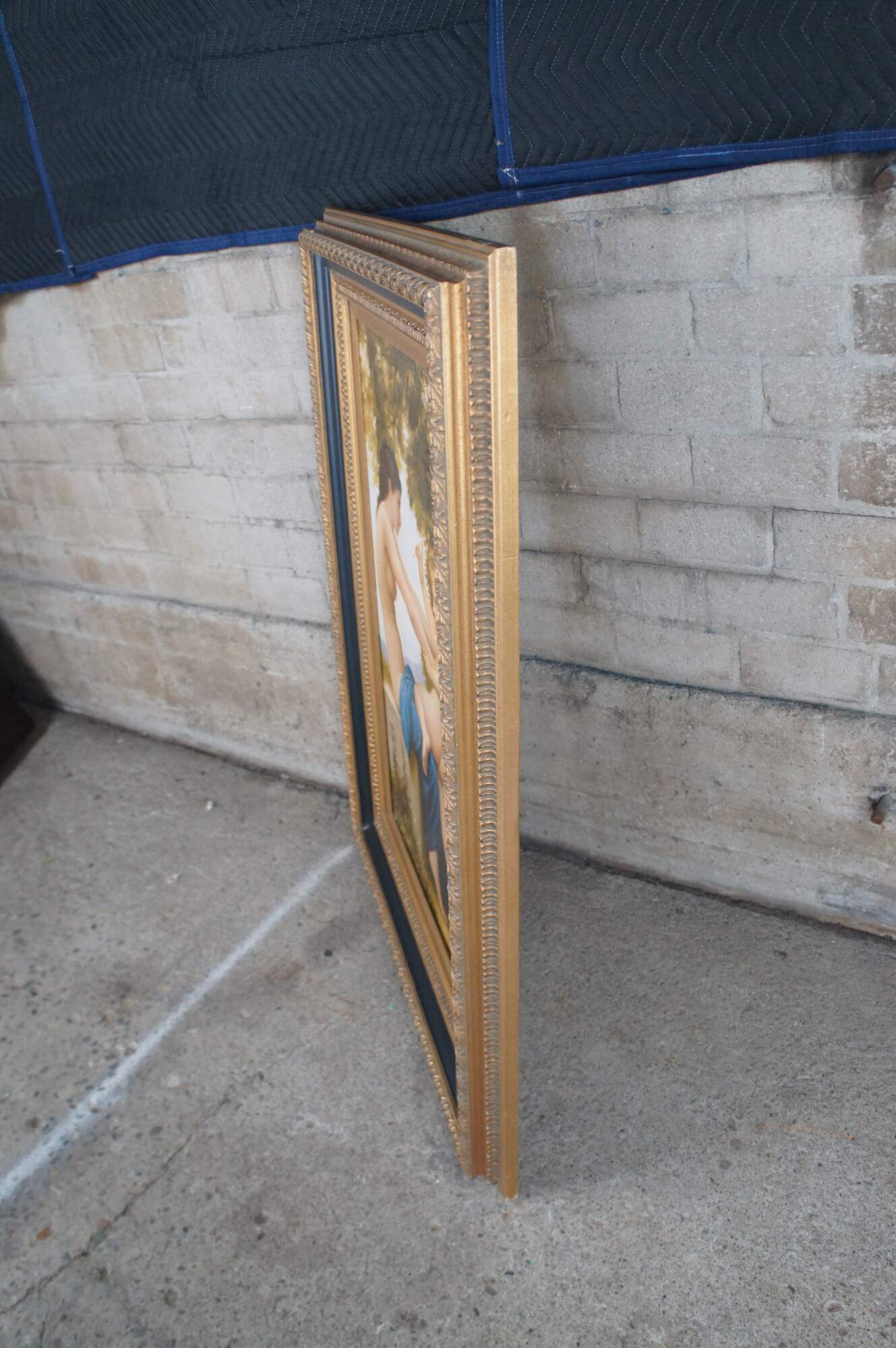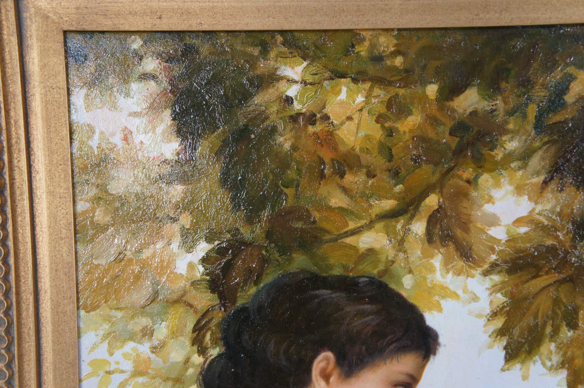 Contemporary School oil painting of "A Young Girl Defending Herself Against Eros" After William Bouguereau. The painting showcases Venus with a winged Cupid and is set within a beautiful black and gold frame. Circa last quarter 20th century.