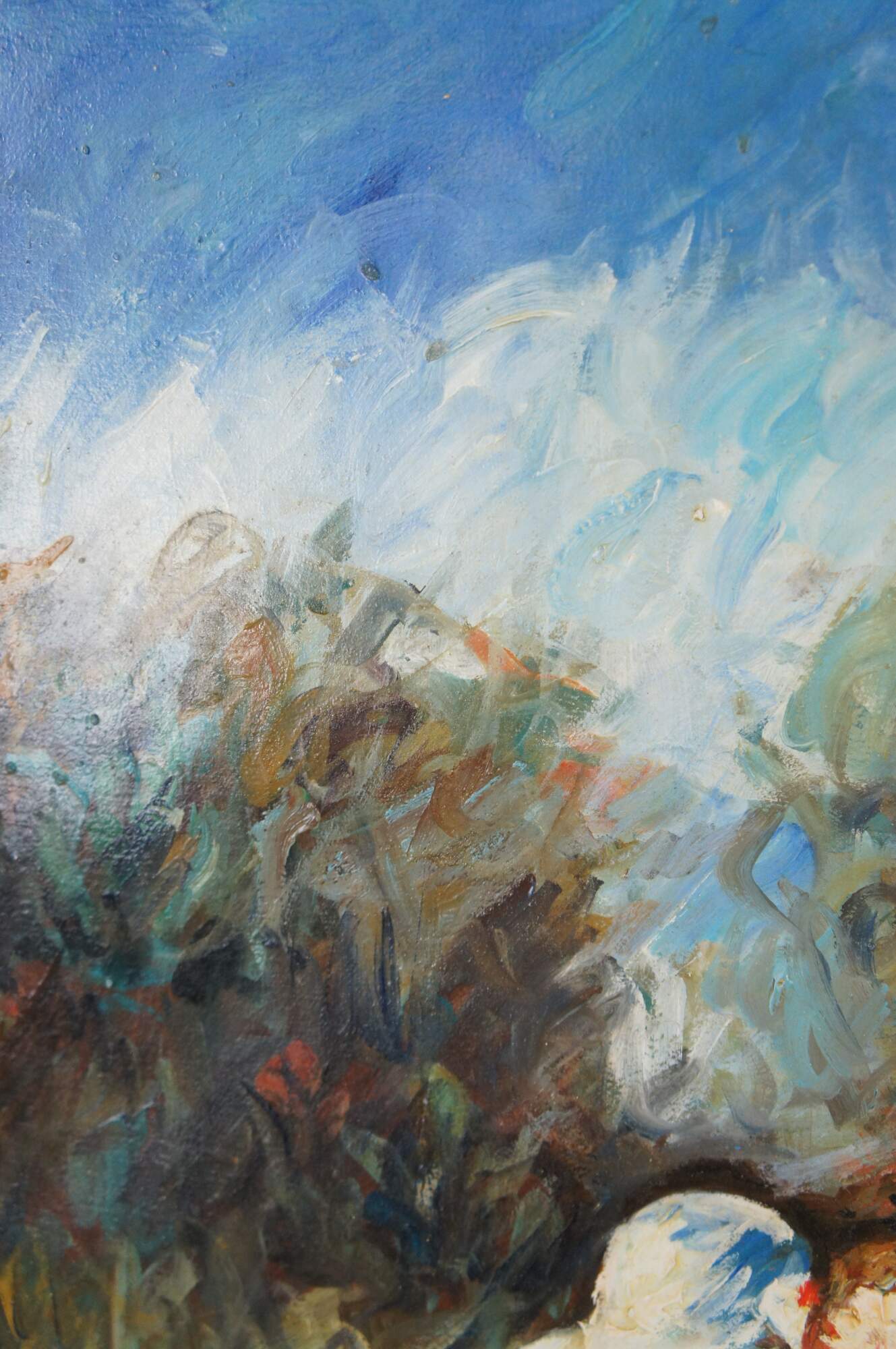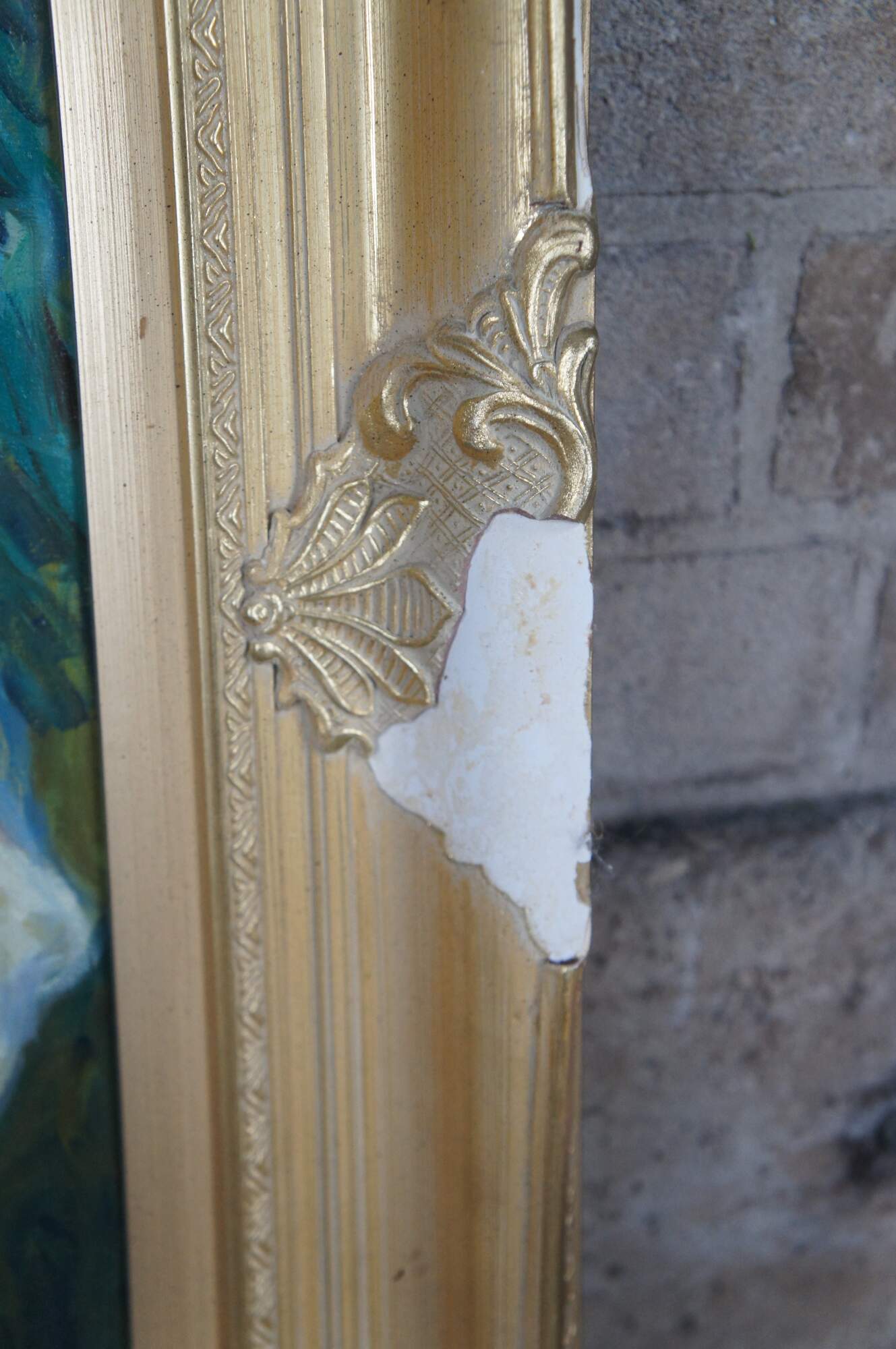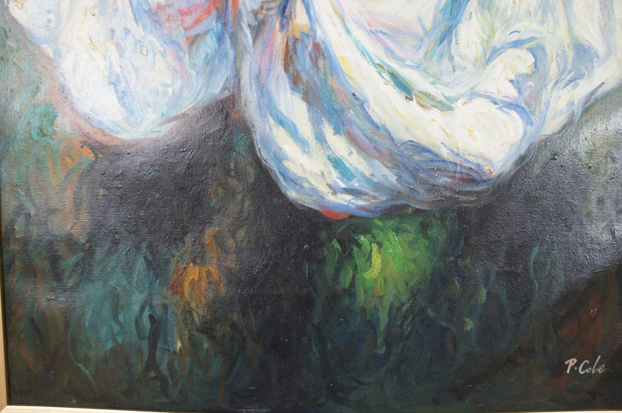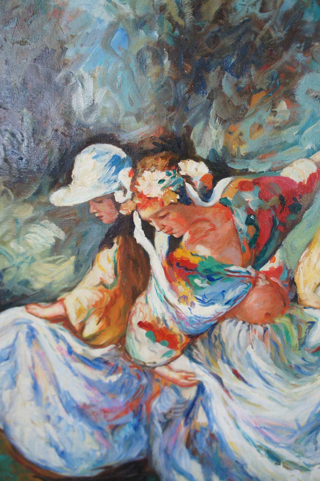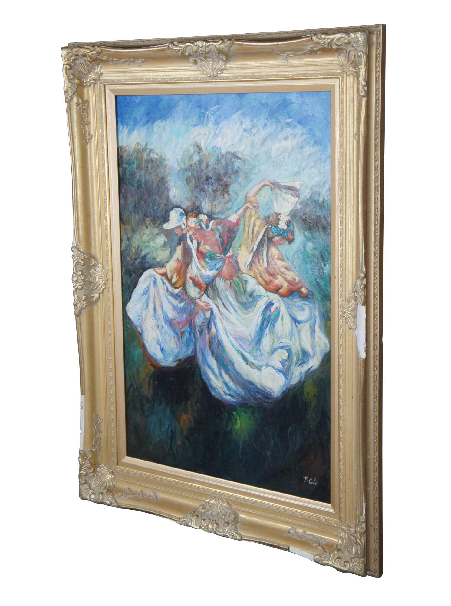 Alegoria De La Danza by P. Cole After Jose Royo (Spanish, B. 1941). The oil painting depicts three women in impressionist style dancing in flowing dresses surrounded by foliage. Signed lower right, canvas framed in French manner with gold finish.