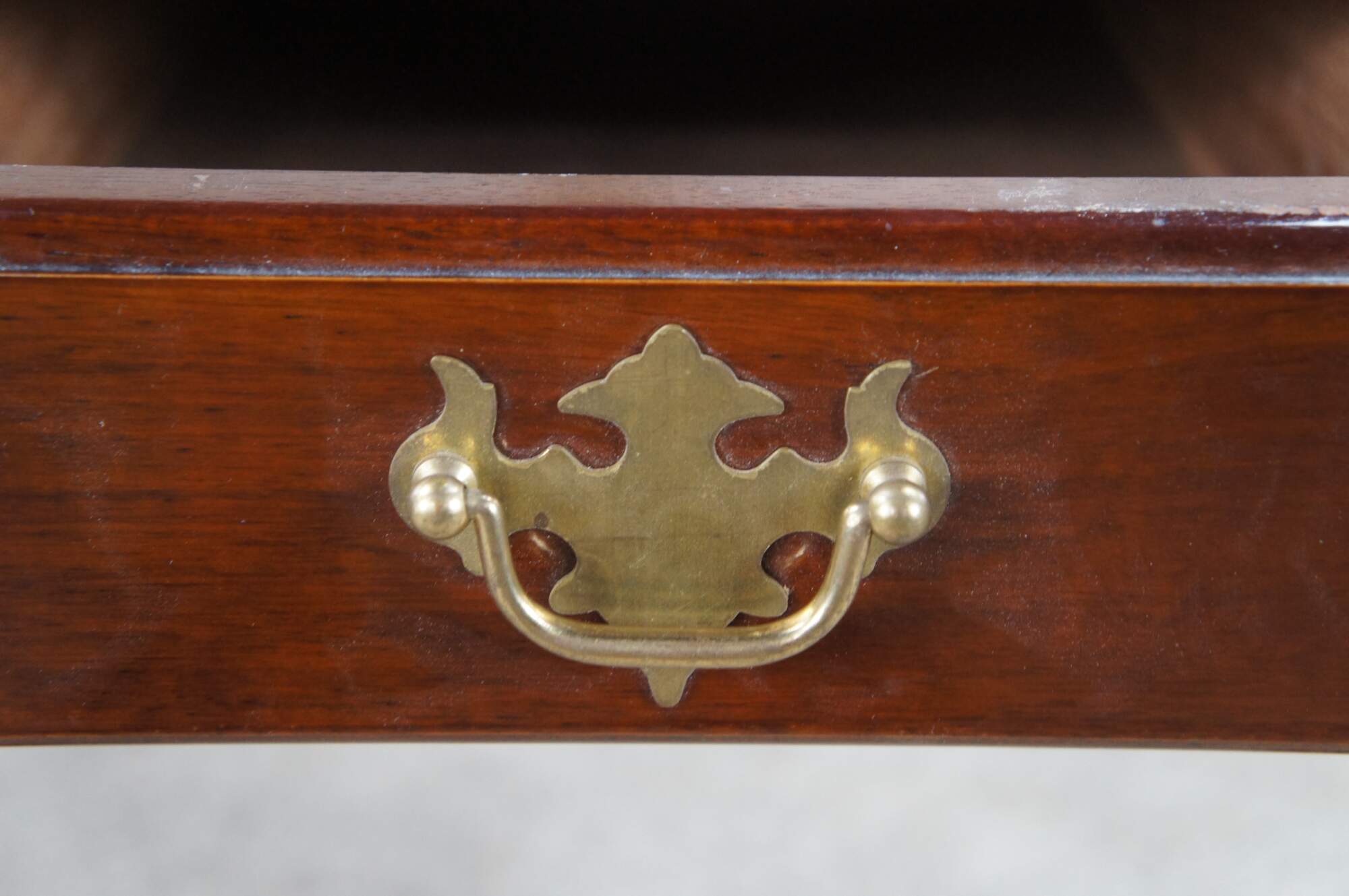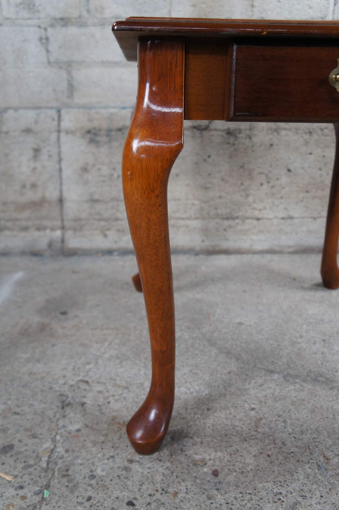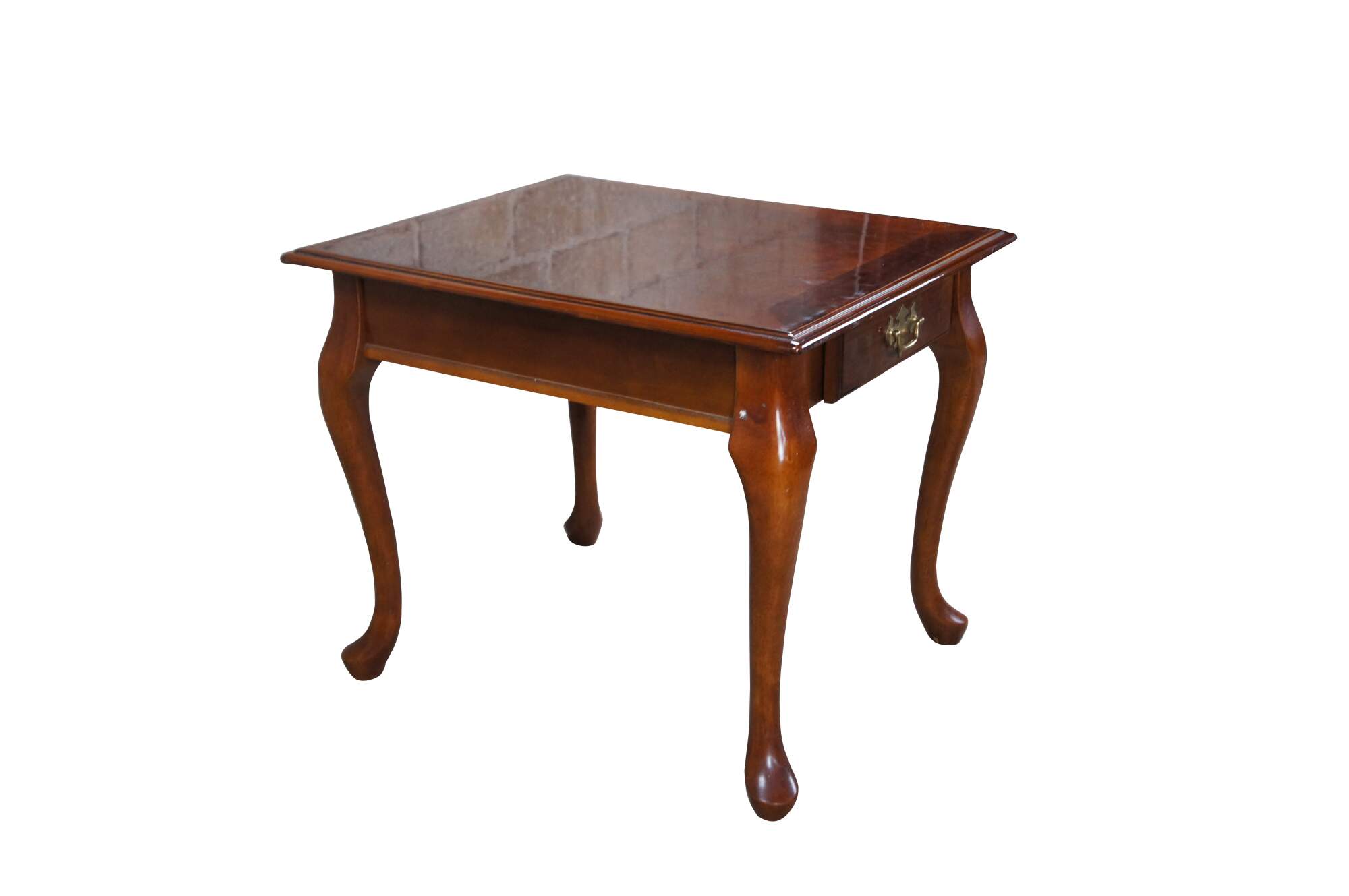 Vintage Queen Anne style side tables featuring rectangular form with serpentine legs, pad feet and one drawer with federal / colonial brass hardware.