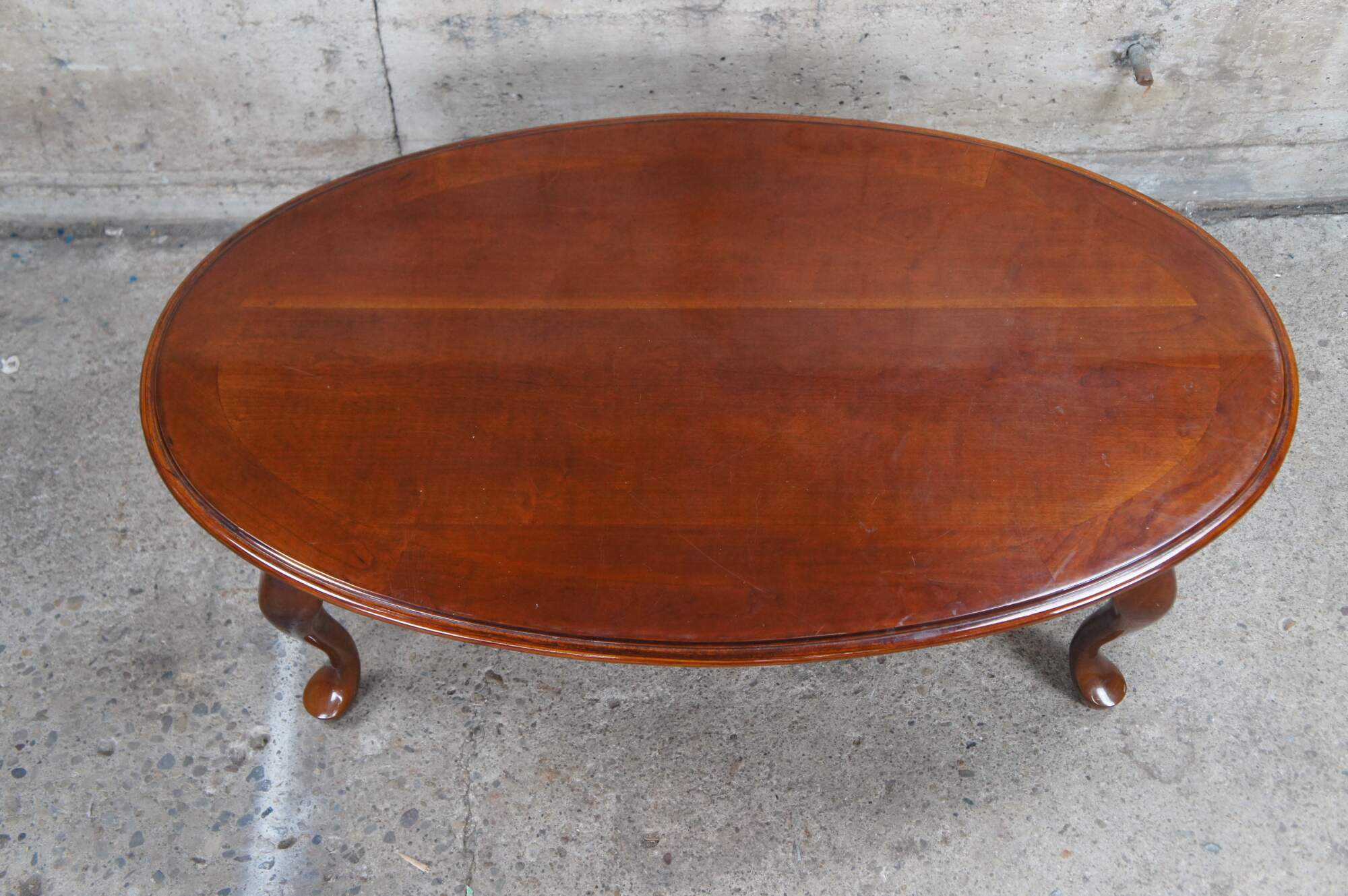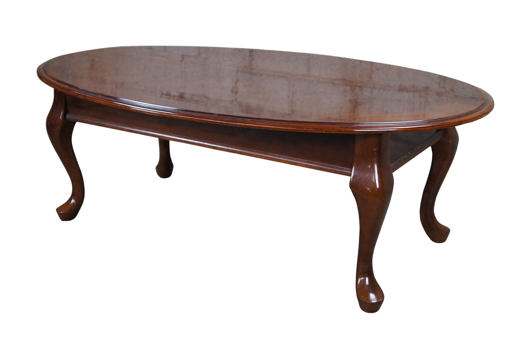 Vintage Queen Anne style coffee or cocktail table featuring oval form with serpentine legs and pad feet. 2 Available