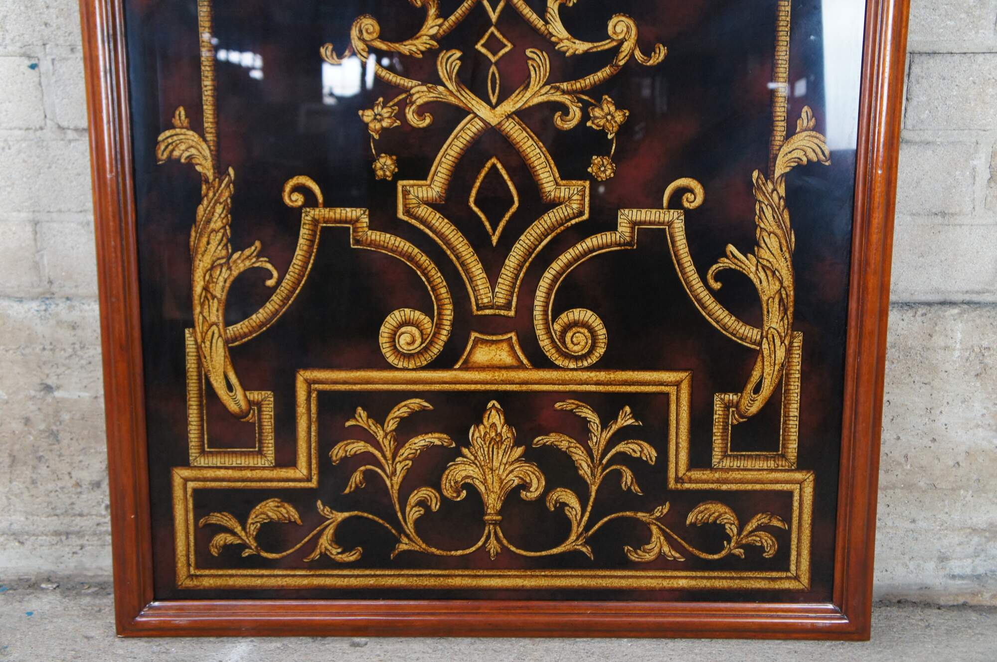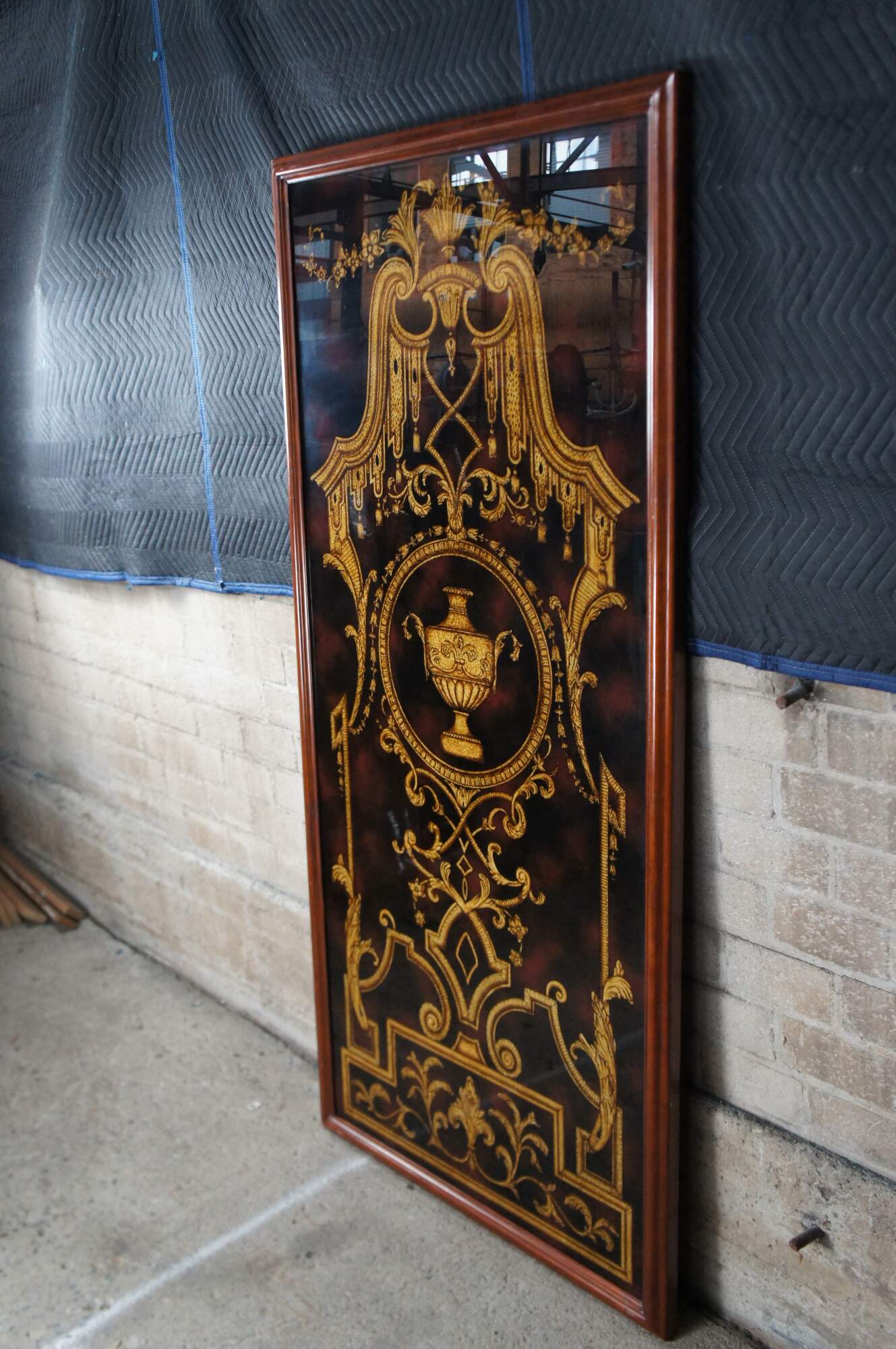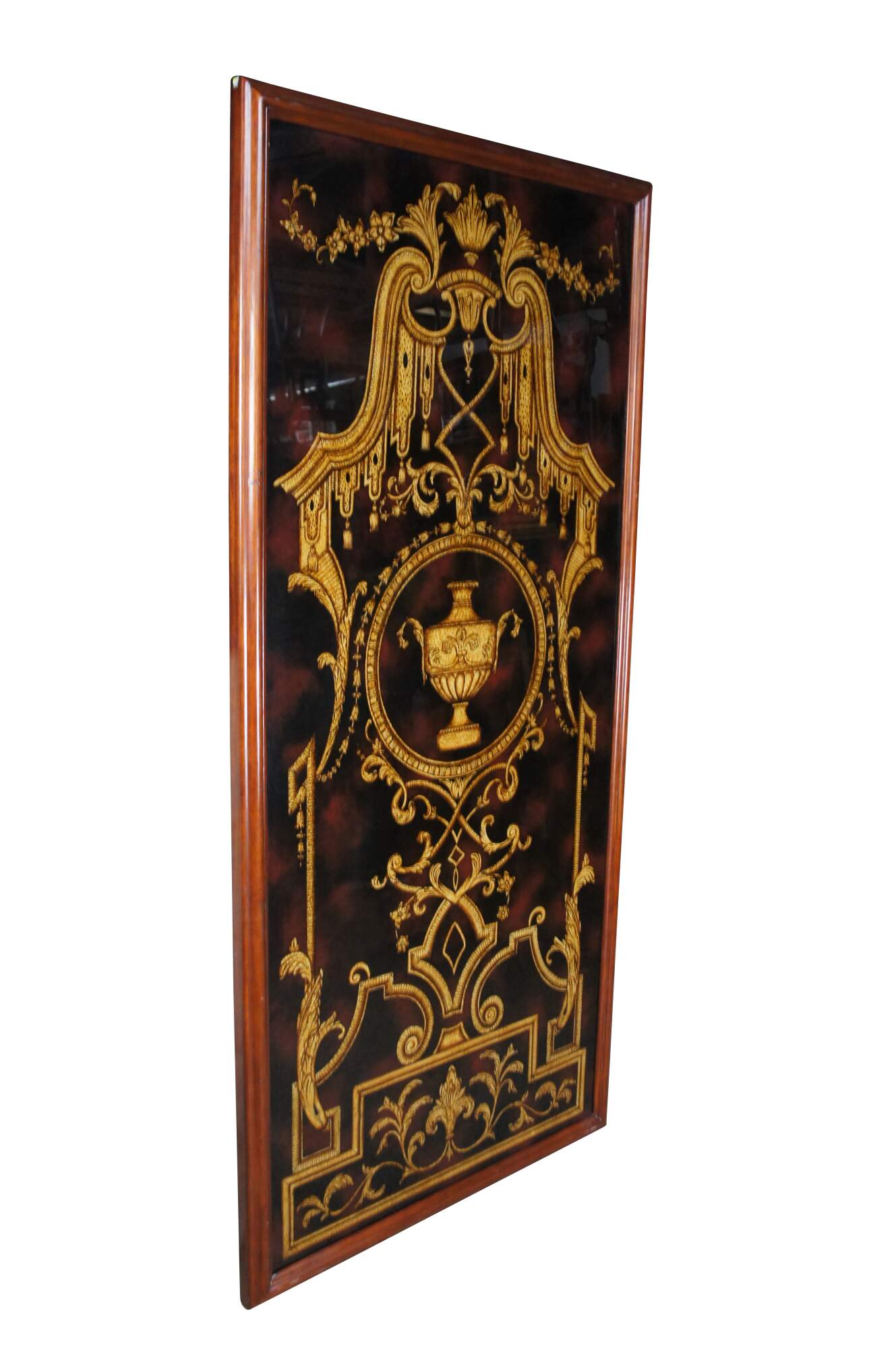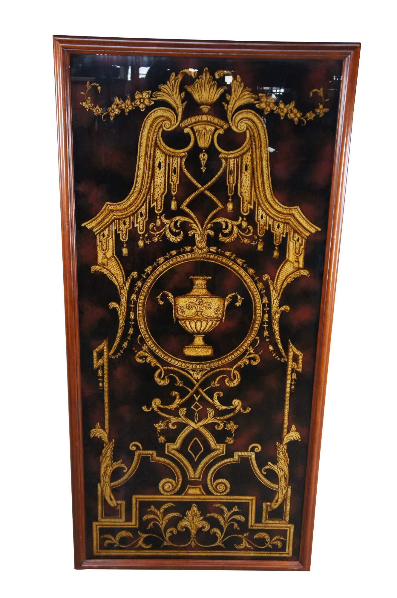 A very large and impressive vintage pair of Maitland Smith hand painted art panels featuring a French Neoclassical / Renaissance eglomise style motif with central trophy urns surrounded by floral acanthus and tassel design. Set in large rectangular mahogany frame with glass. Very heavy.
