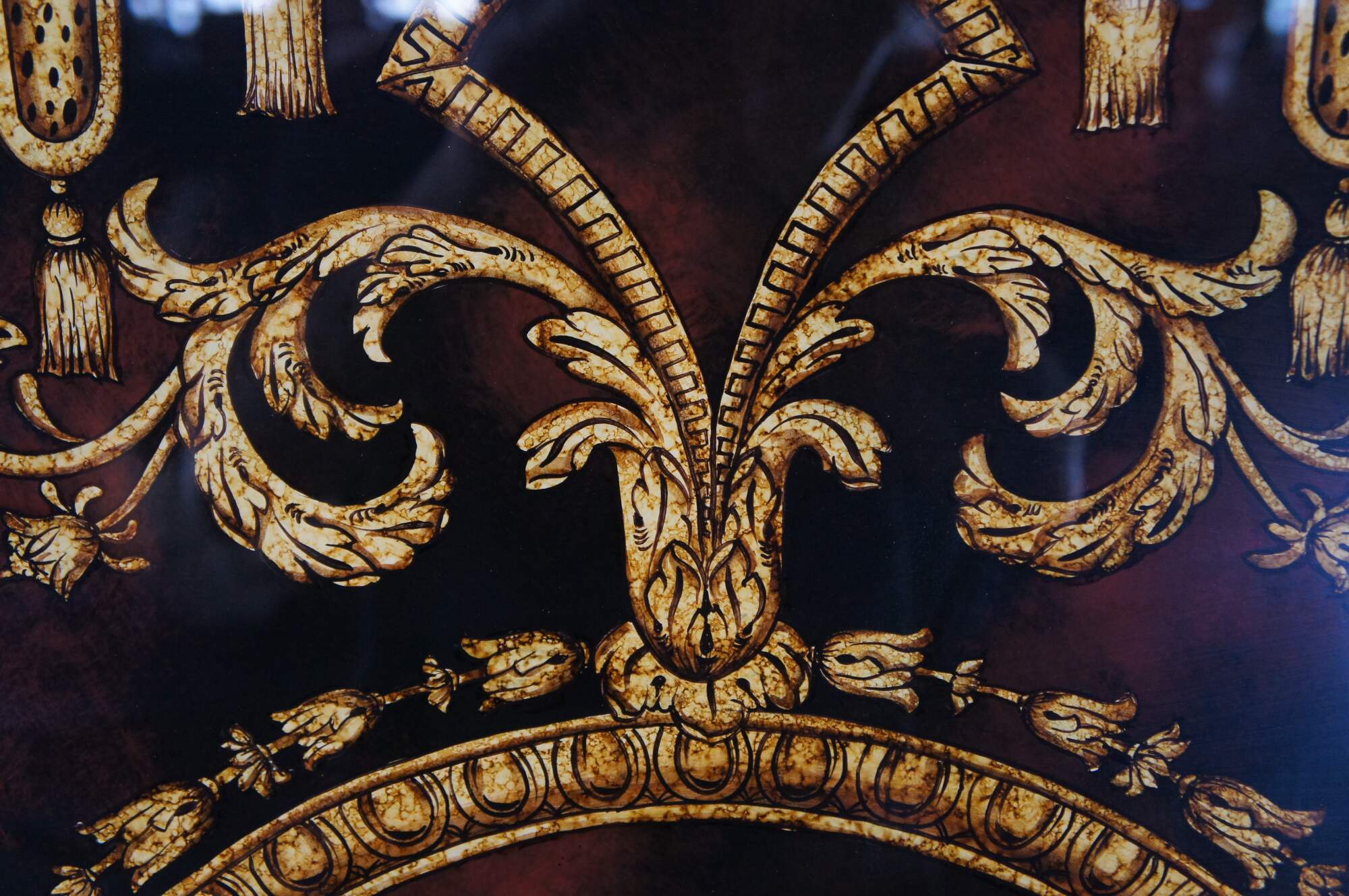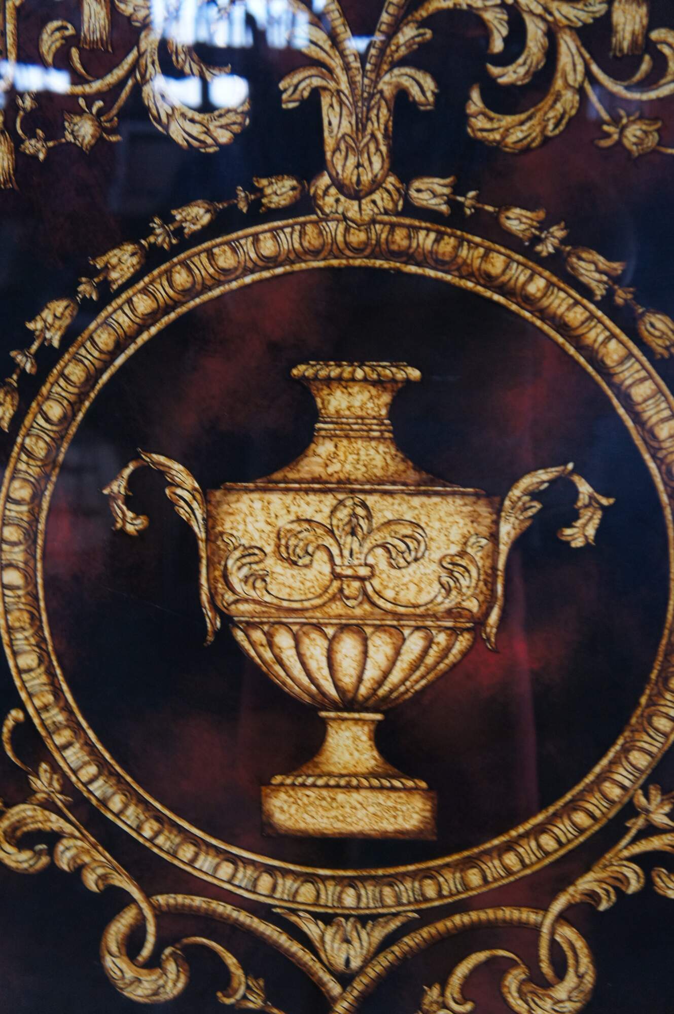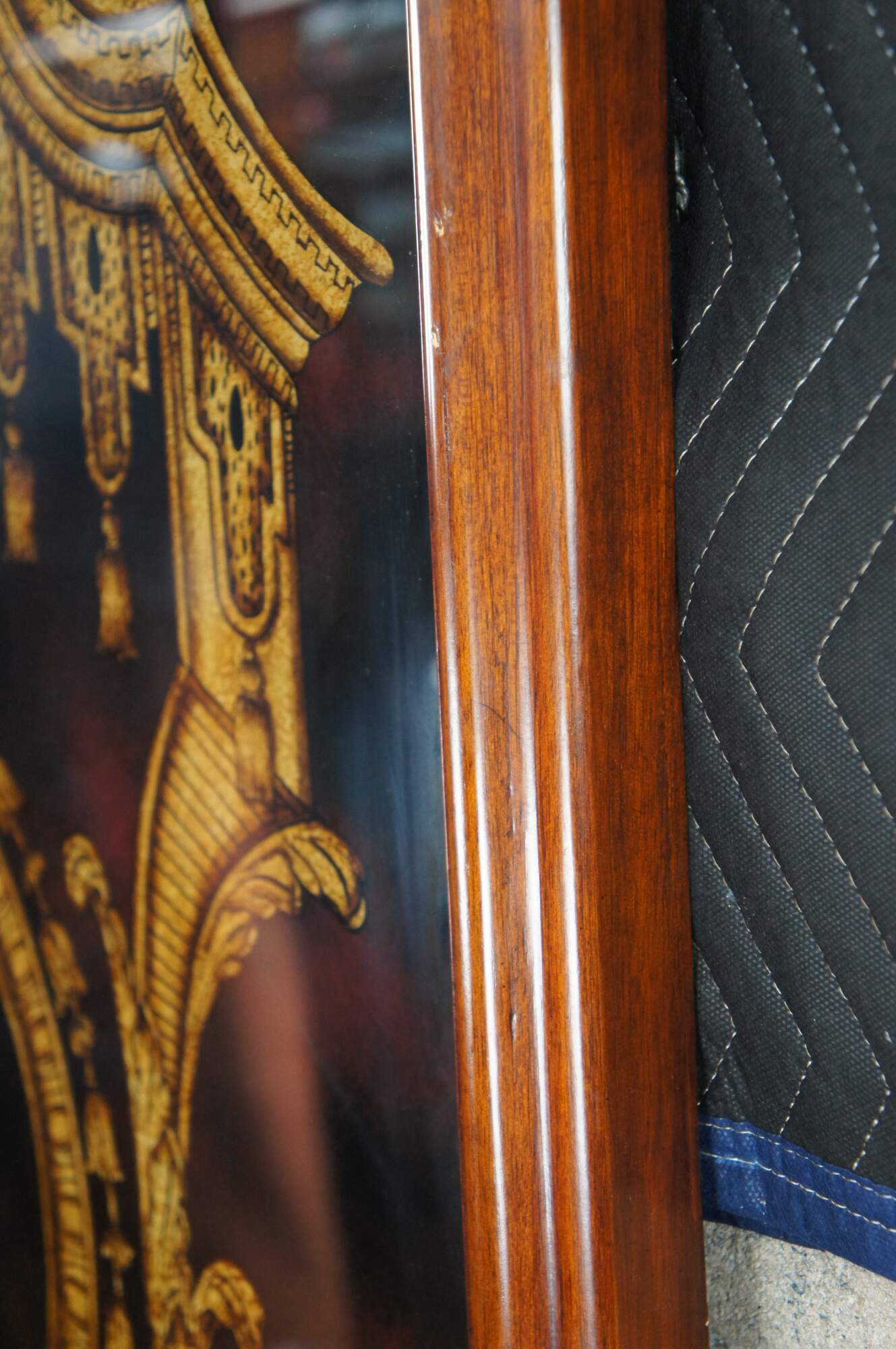 A very large and impressive vintage pair of Maitland Smith hand painted art panels featuring a French Neoclassical / Renaissance eglomise style motif with central trophy urns surrounded by floral acanthus and tassel design. Set in large rectangular mahogany frame with glass. Very heavy.