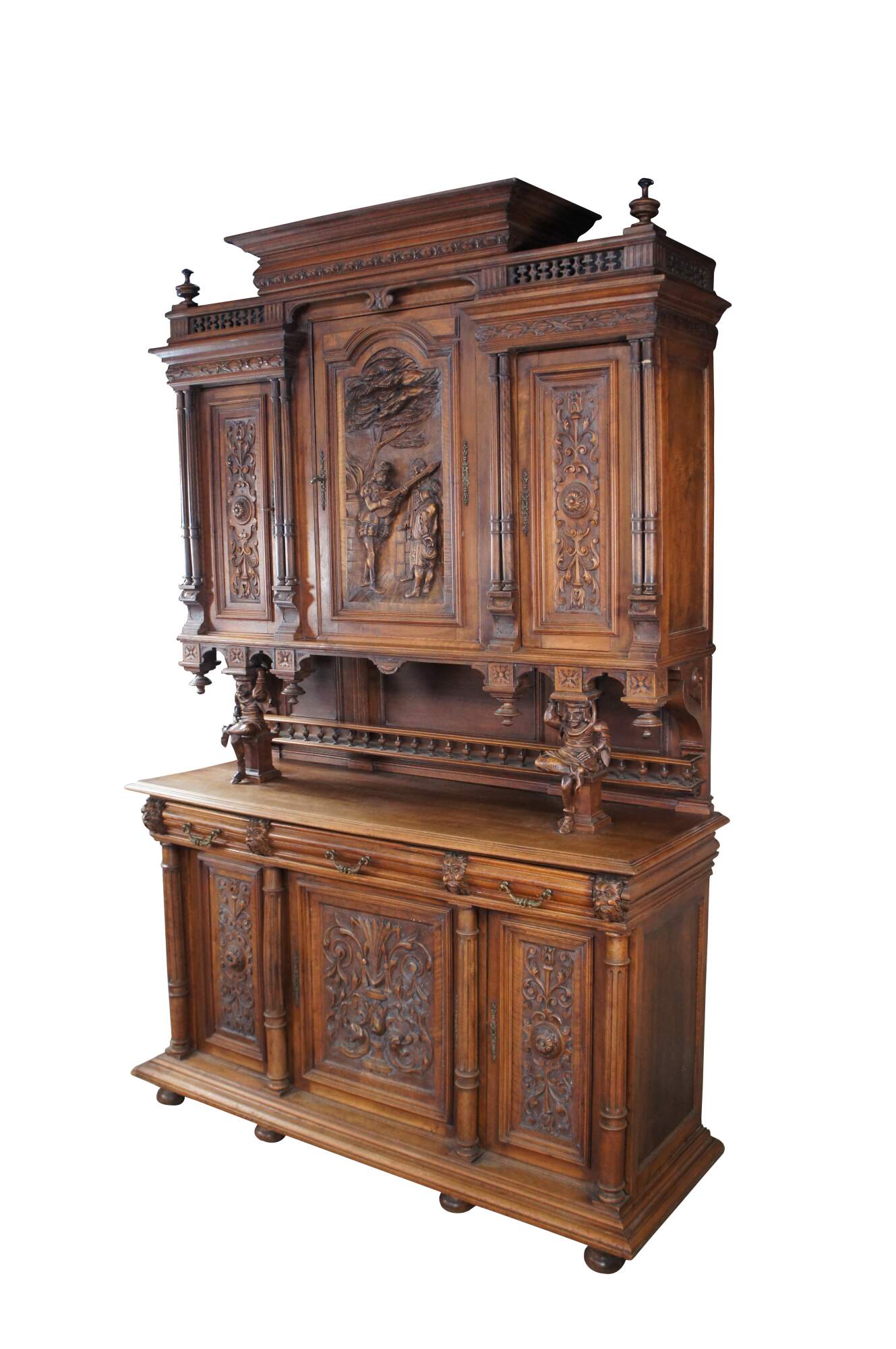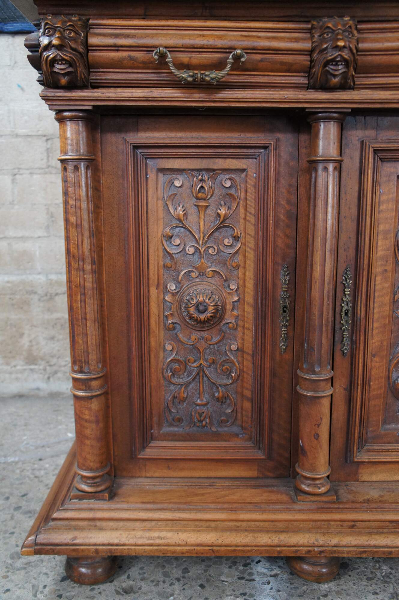 Antique French Renaissance walnut buffet a deux corps / vaisselier / cupboard / cabinet / hutch featuring Henry II styling with carved figural and floral theme. The top of the cabinet features a cabochon crest flanked by dolphins and reticulated gallery over a pierced gallery with finials. The upper cabinet has a central paneled door carved with a figural scene of a musician in the garden, which is flanked by floral and acanthus designs, and pairs of fluted columns. The cabinet is supported by two carved friars who sit in between drop finials right in front of the spice rail / rack / shelf. The lower cabinet features three drawers with brass hardware surrounded by Northwind faces, above carved panel doors and bun feet.