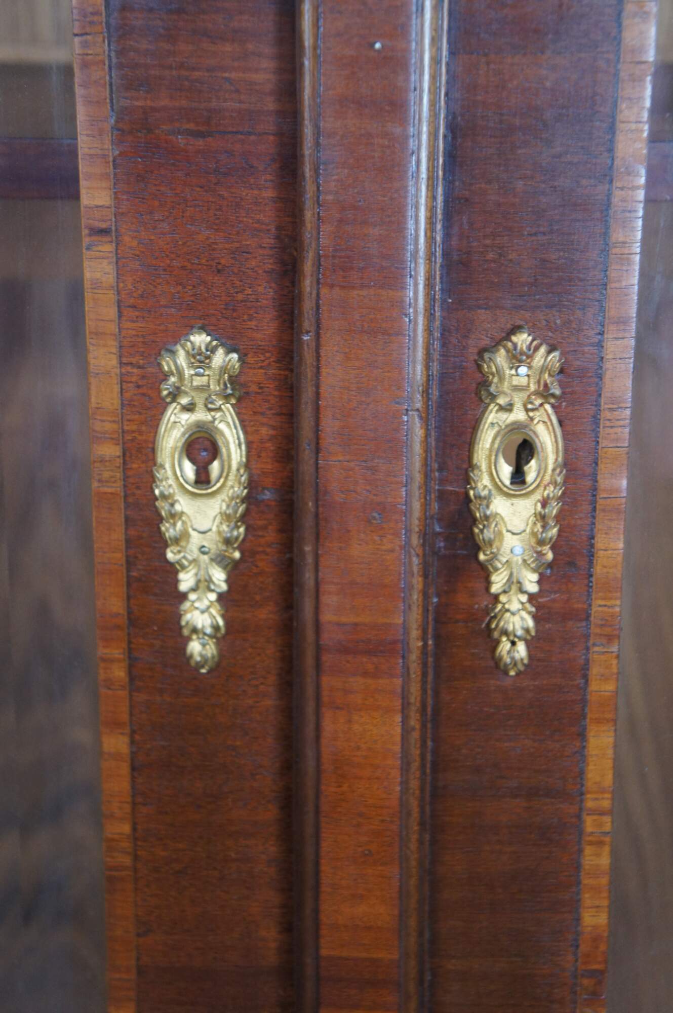 A very large and impressive antique French Renaissance Revival knockdown bookcase / showcase / curio display cabinet / or linen press. Made of flame mahogany featuring gilt ormalu mounts, inlaid cross banding, large beveled glass doors and tapered feet.