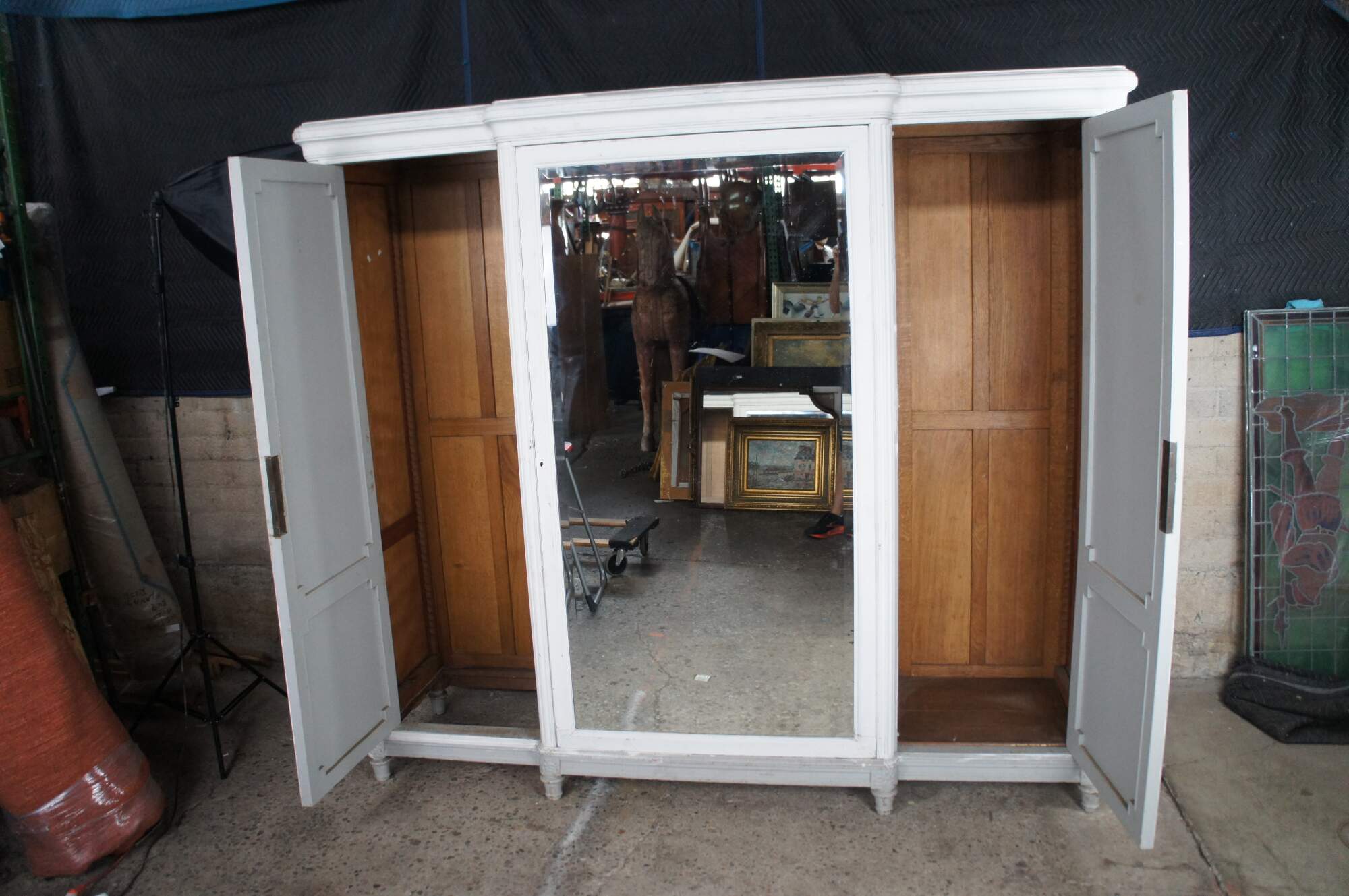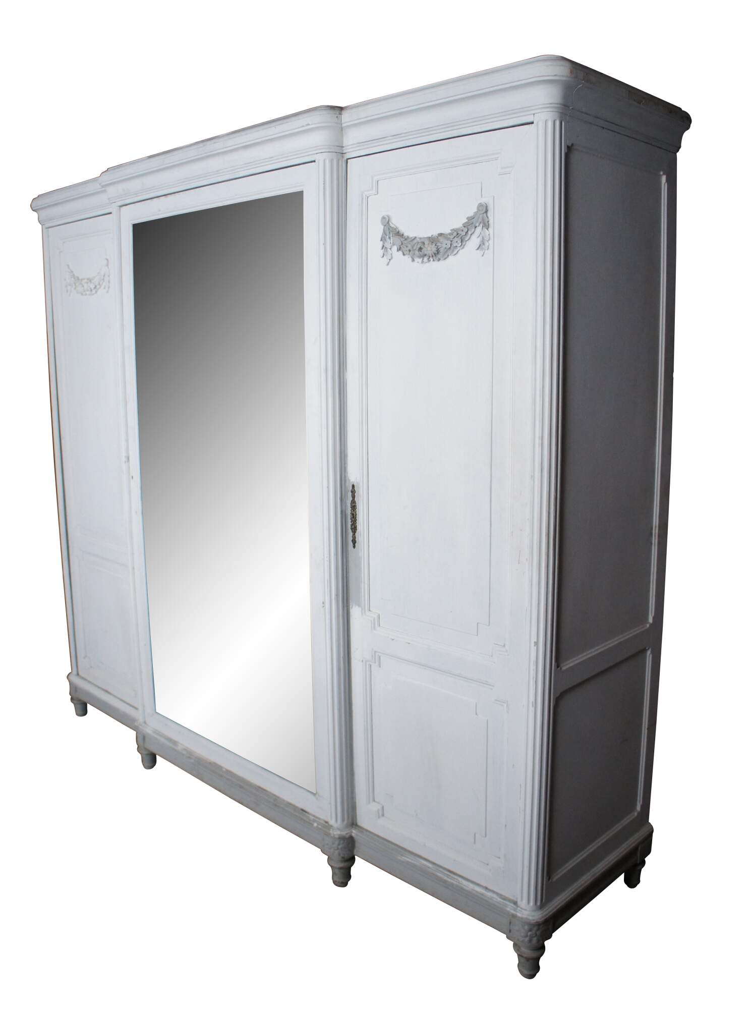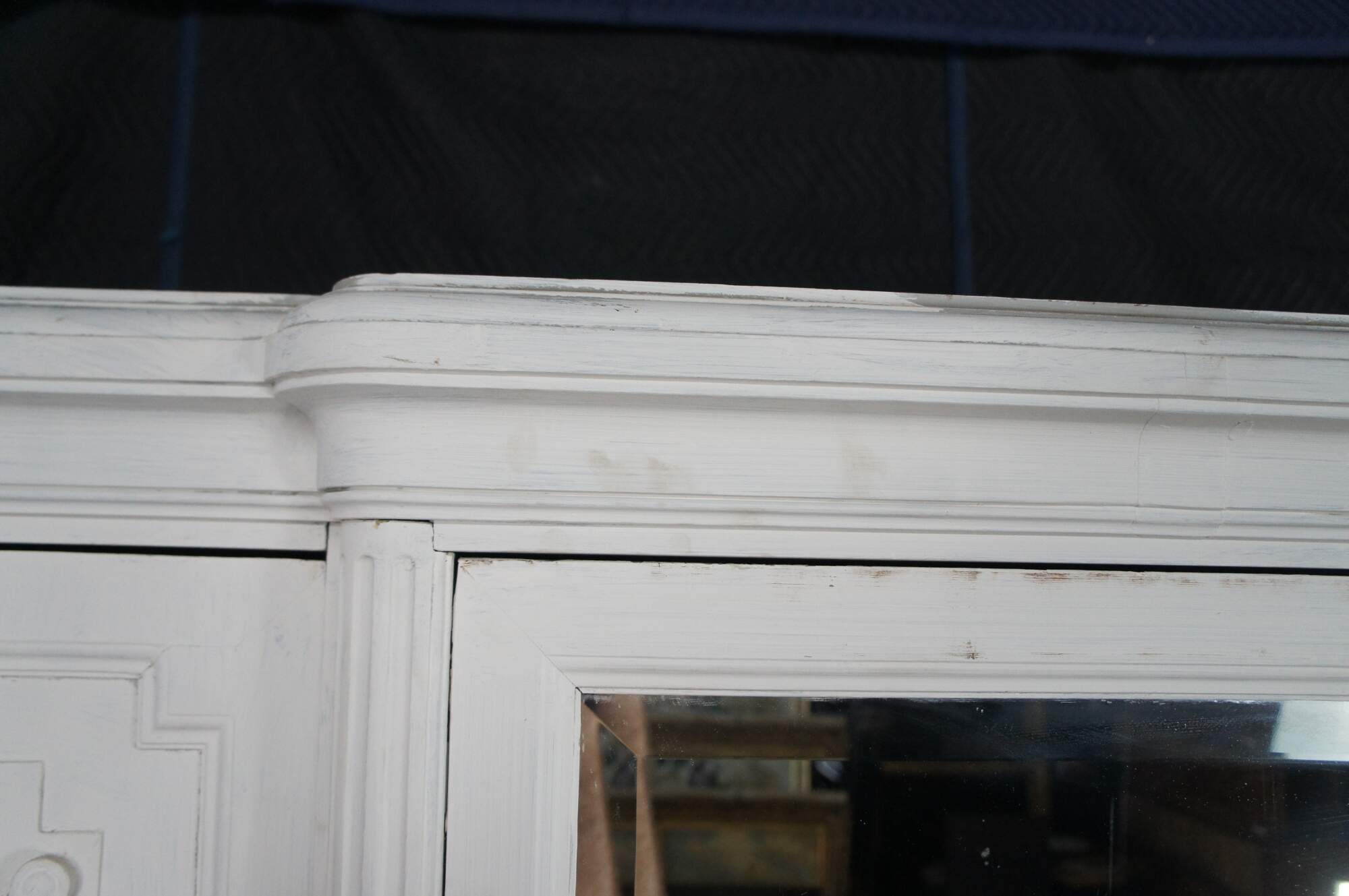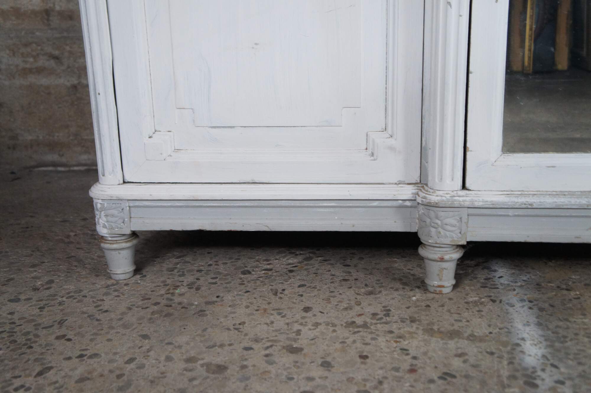 Antique French Provincial knockdown armoire / wardrobe / closet. Made of oak featuring a chic white painted finish with large central beveled vanity / dressing mirror flanked by two cabinets with Neoclassical carved accents.