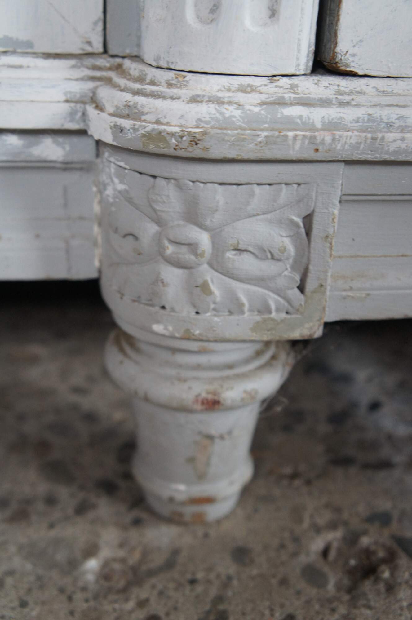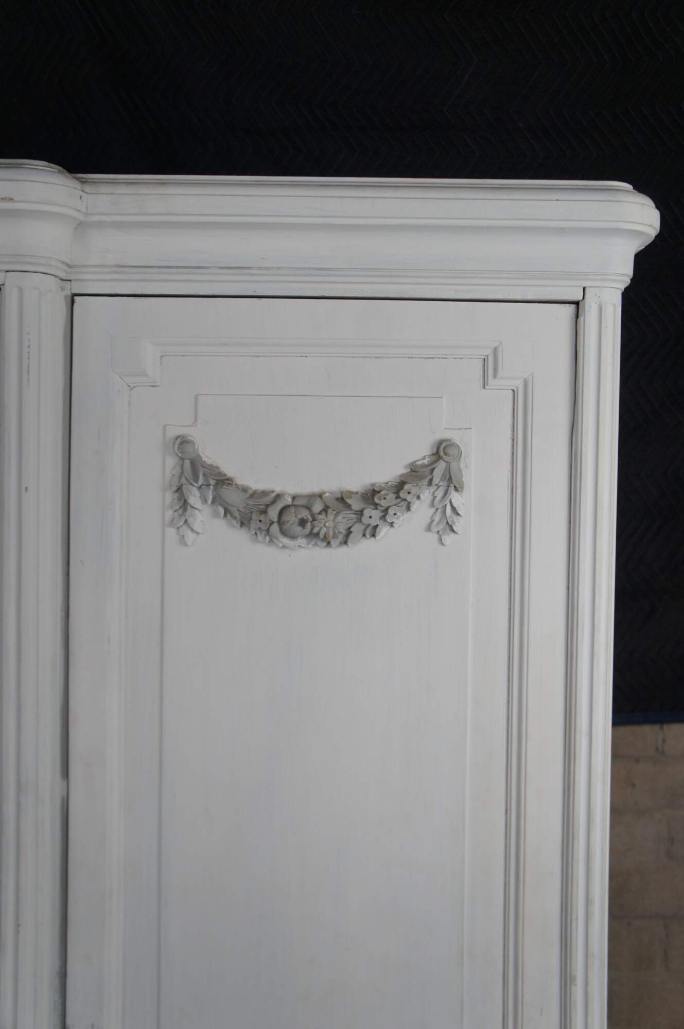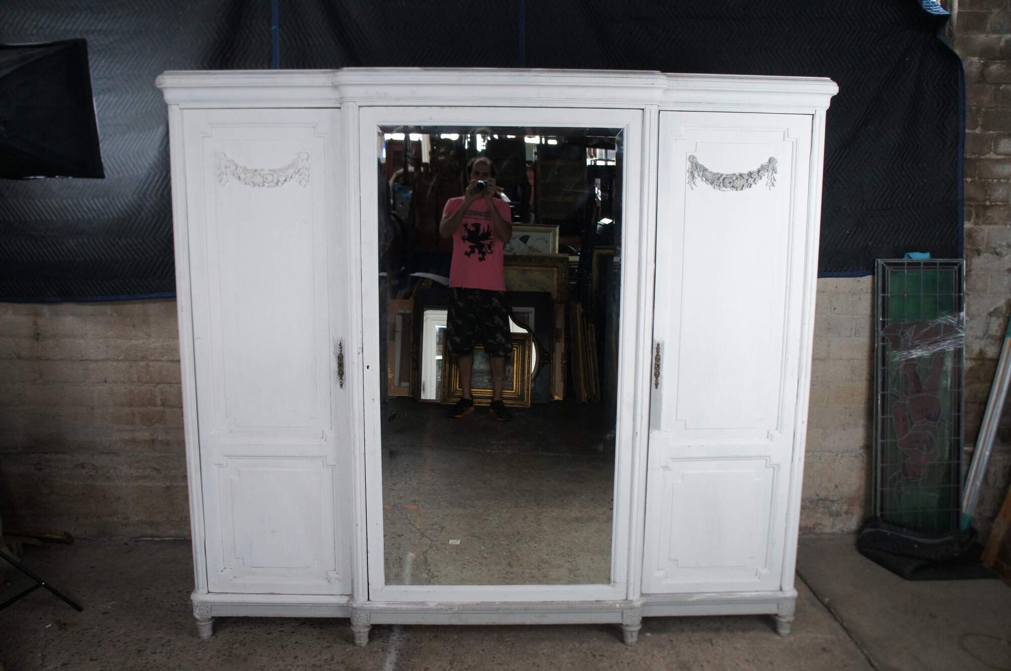 Antique French Provincial knockdown armoire / wardrobe / closet. Made of oak featuring a chic white painted finish with large central beveled vanity / dressing mirror flanked by two cabinets with Neoclassical carved accents.