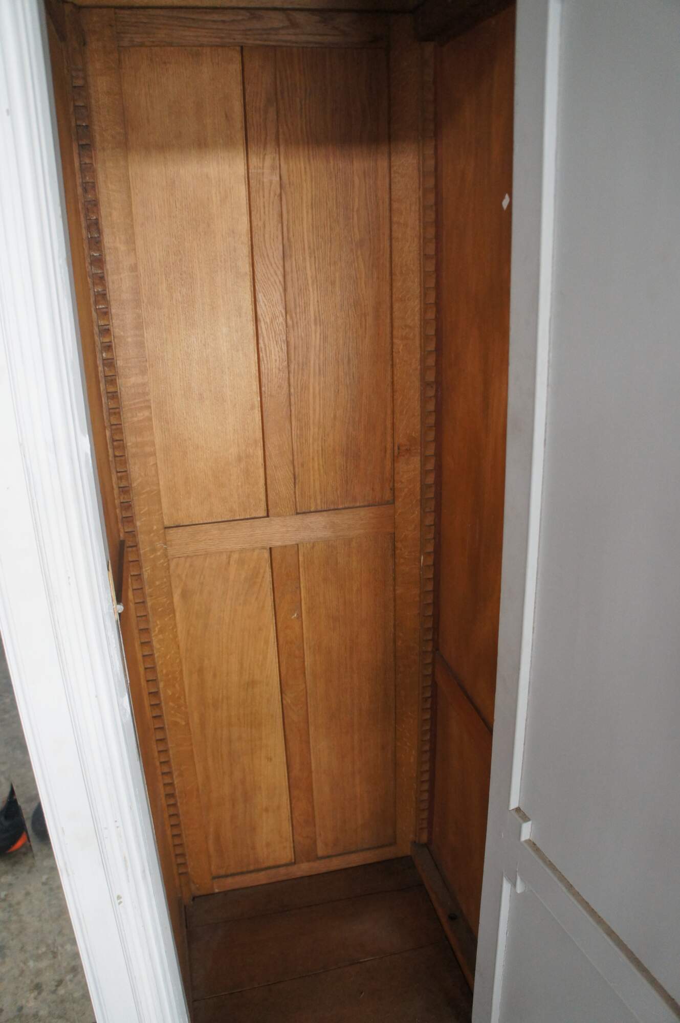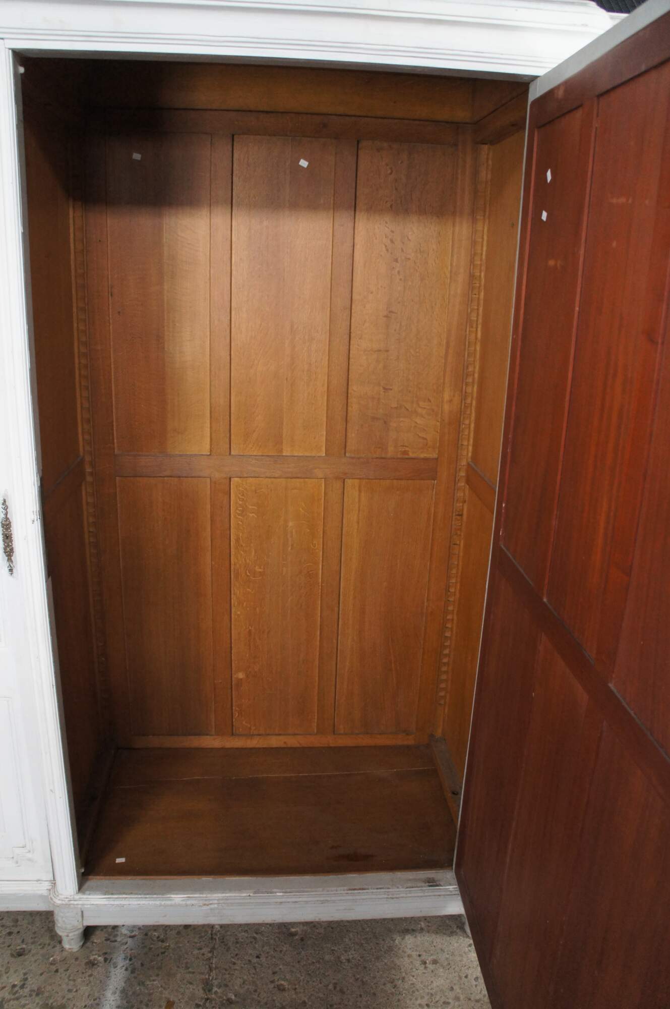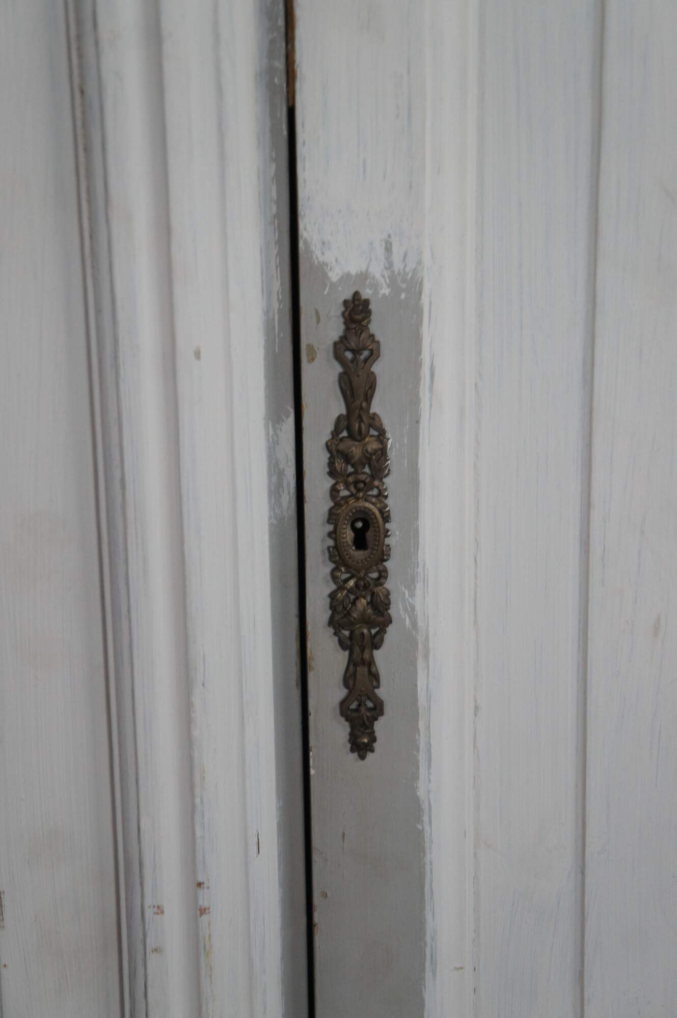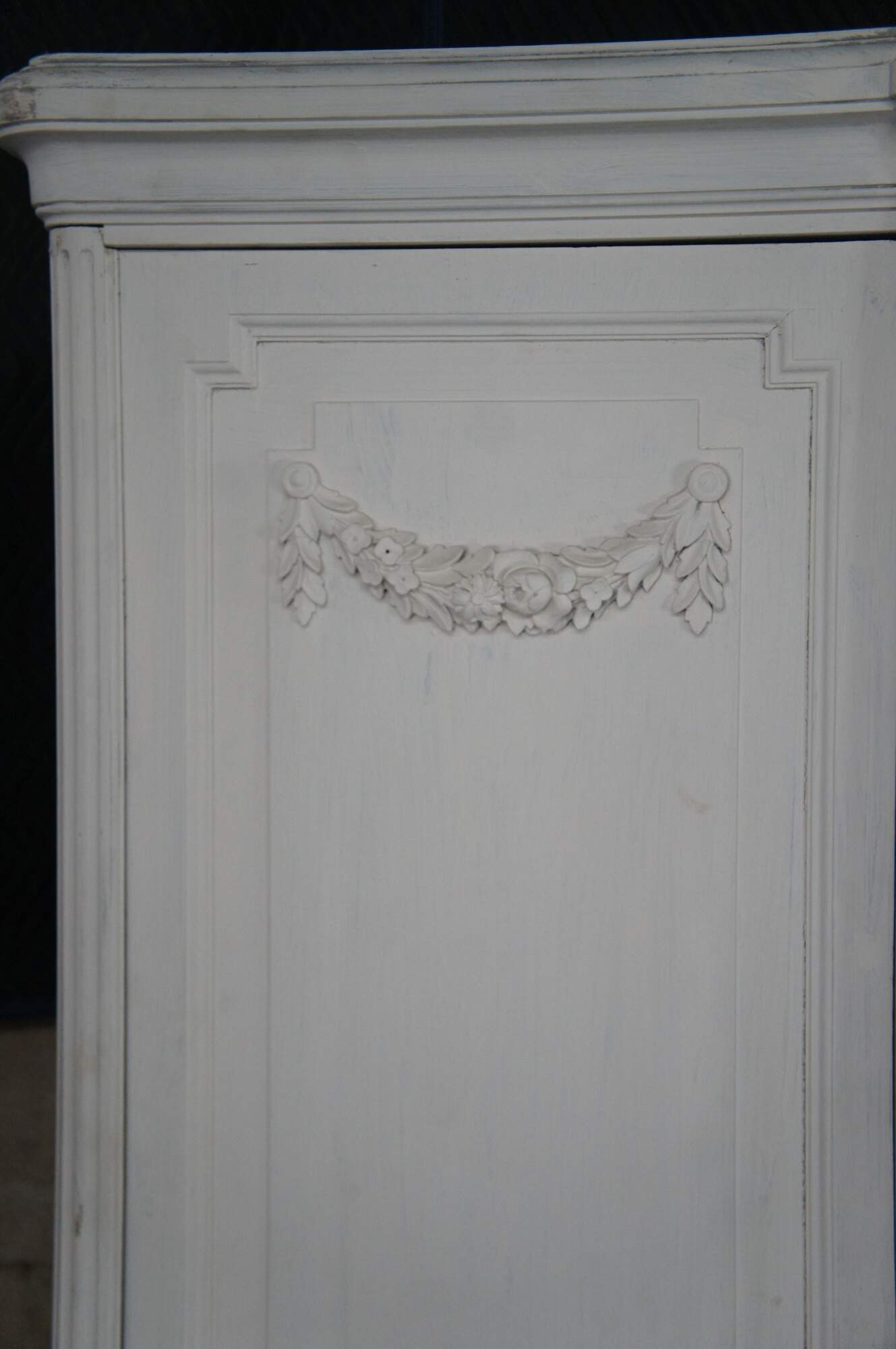 Antique French Provincial knockdown armoire / wardrobe / closet. Made of oak featuring a chic white painted finish with large central beveled vanity / dressing mirror flanked by two cabinets with Neoclassical carved accents.