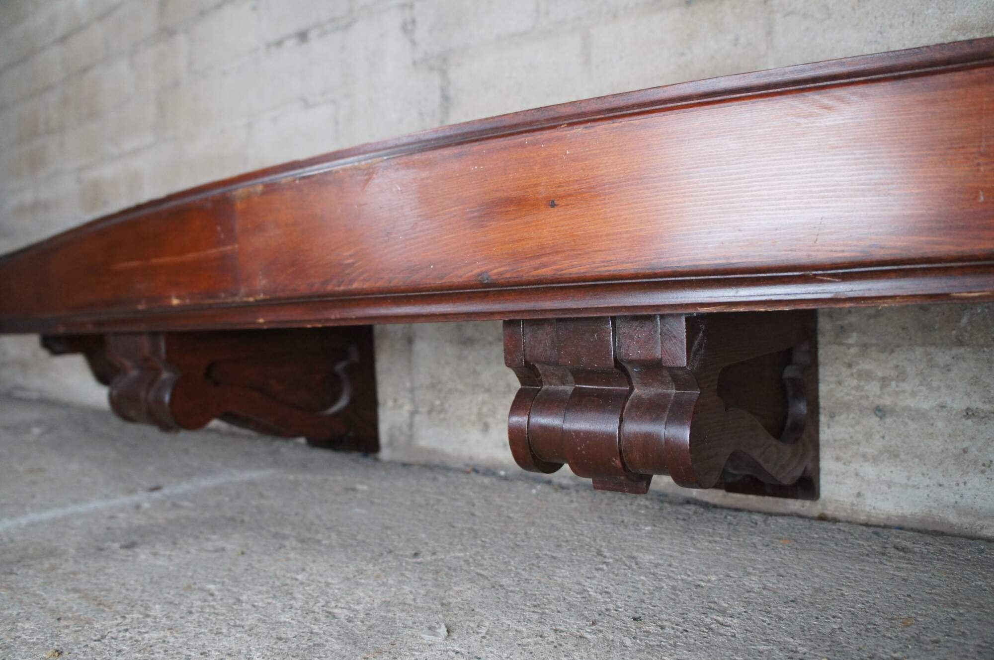 Antique early 20th century Craftsman fireplace mantel or floating wall shelf. Made of oak featuring curved demilune form with scrolled serpentine corbel supports.