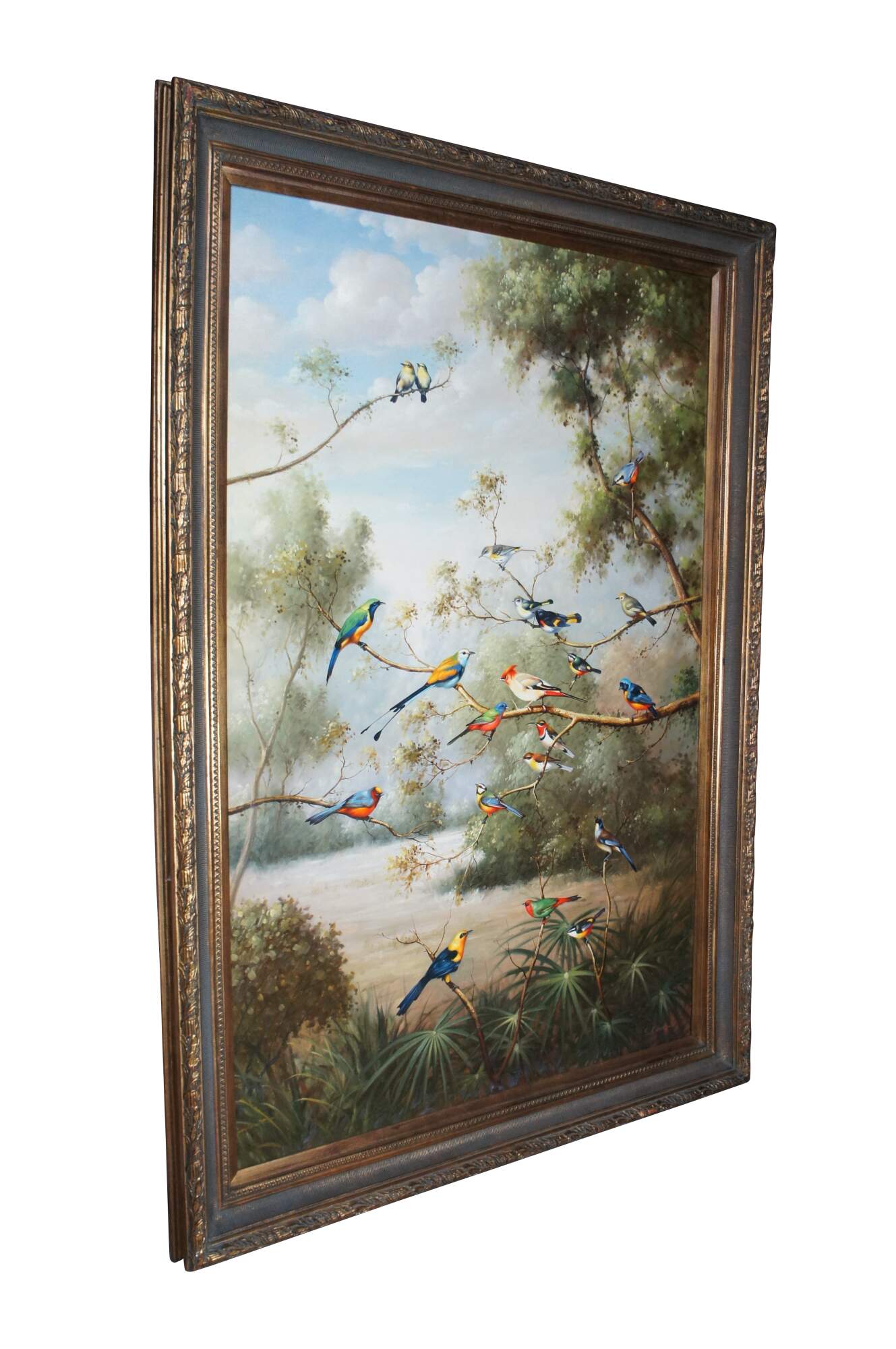 A large and impressive oil painting showcasing tropical birds perched on trees in a woodland setting lakeside. The painting is signed lower left by S. Robertson and ornately framed in gold with neoclassical designs. The beautiful painting is perfectly detailed and draws a nod to natural selection through the vibrancy of each bird.