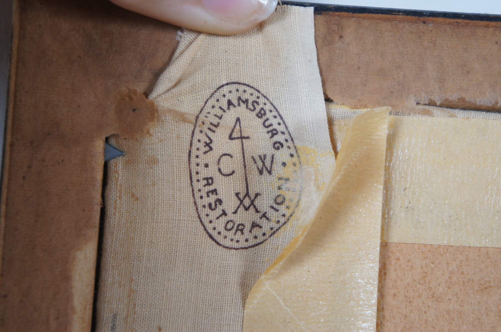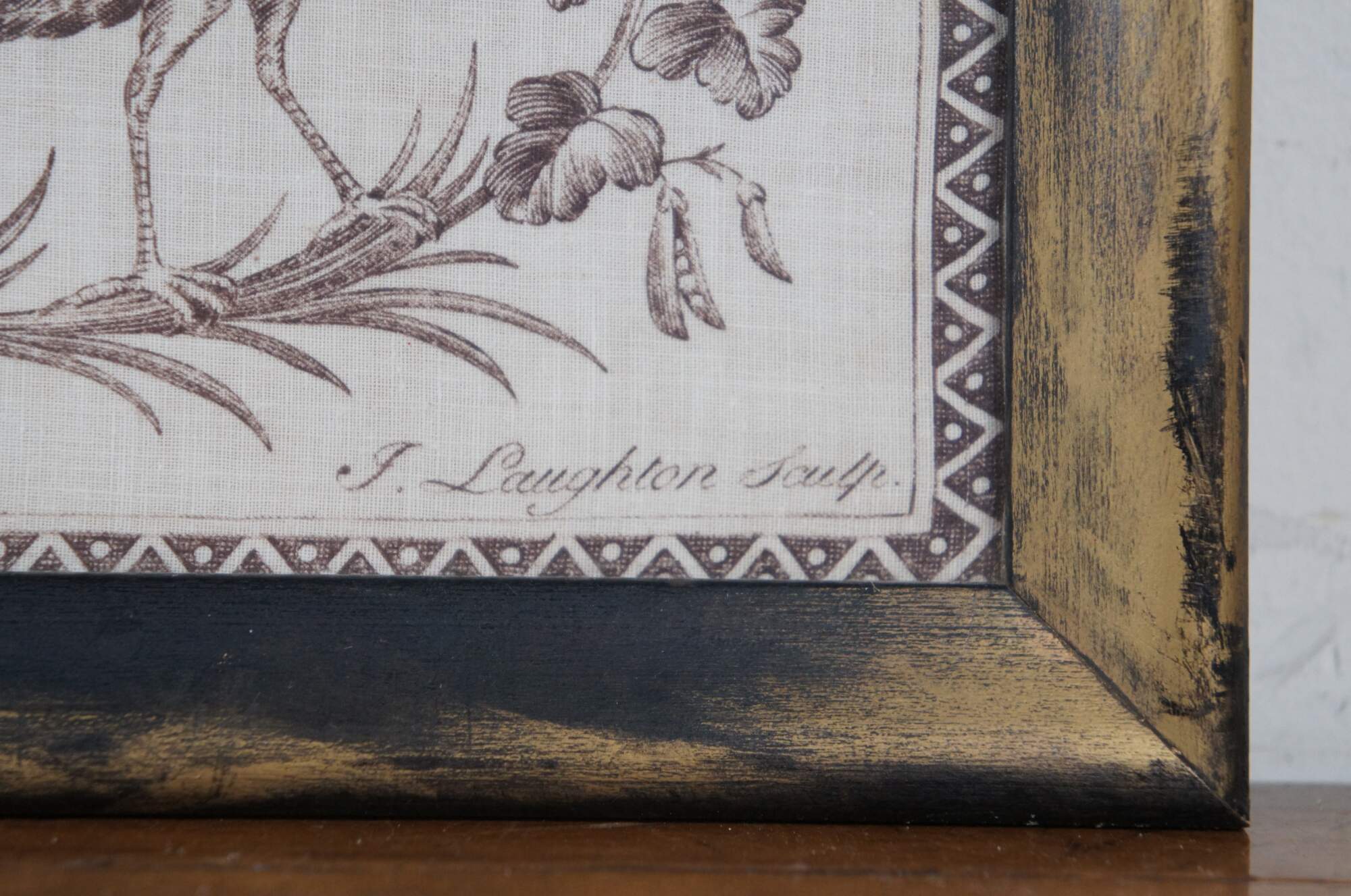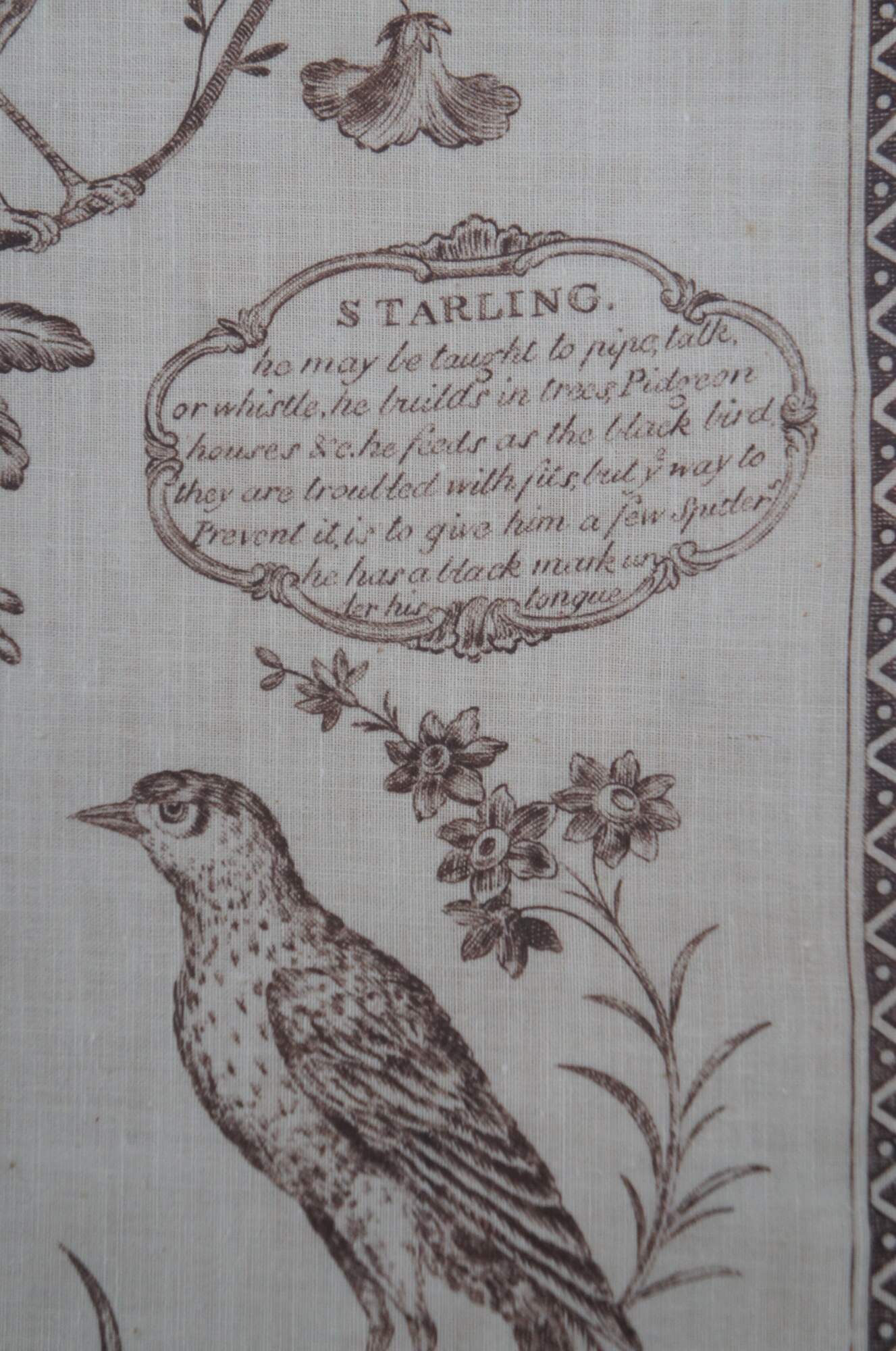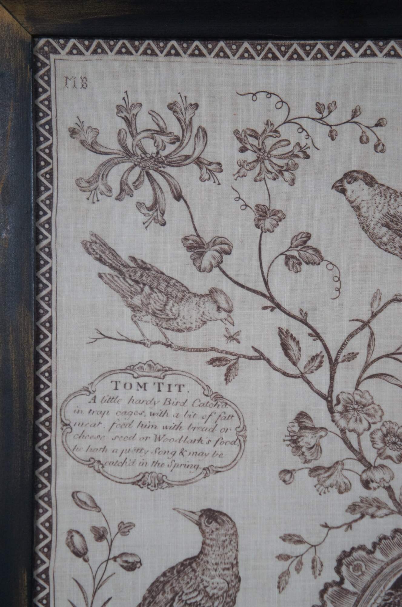 Vintage Ornithology print on linen kerchief tapestry of "The Aviary: or Bird Fancyers Recreation" from an 18th century copperplate engraving by J. Laughton. Produced by Colonial Williamsburg Restoration - marked on corner of linen, visible from back of frame. Brown ink on white linen showing a American Colonial country landscape of figures, surrounded by a variety of native birds and a short description of each. Factory distressed beveled wood frame.