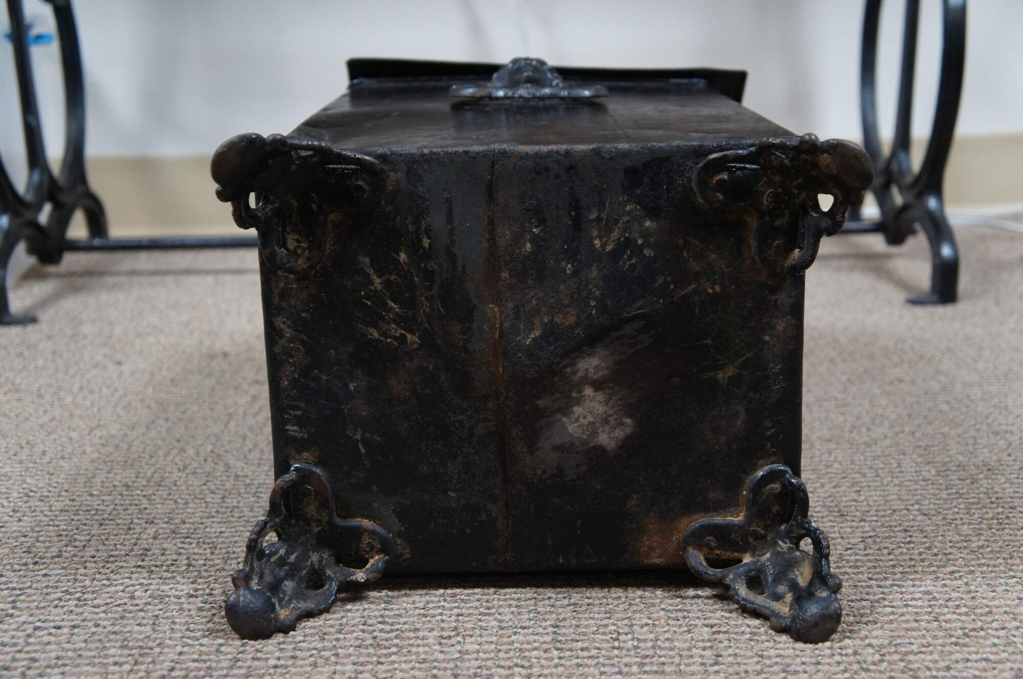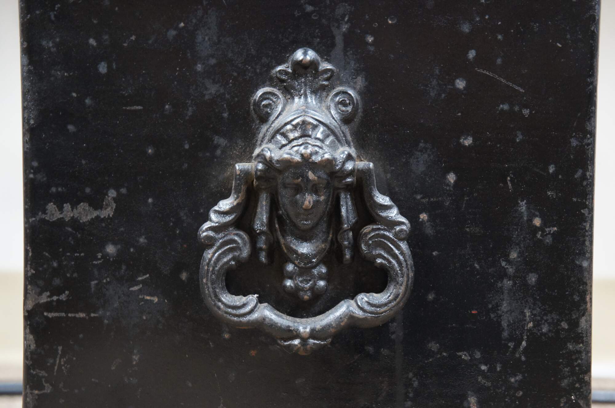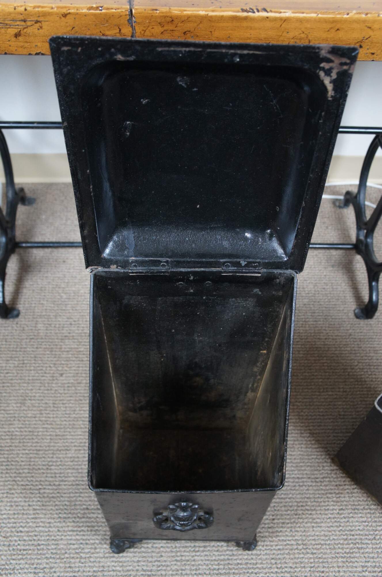 Early 20th century farmhouse black tin fireplace coal scuttle / hearthware bucket / bin. Rectangular form with slanted lid, embellished with applied orange and yellow flowers. Lions head feet; decorative ring on the front featuring an art nouveau female face. Includes black painted insert.