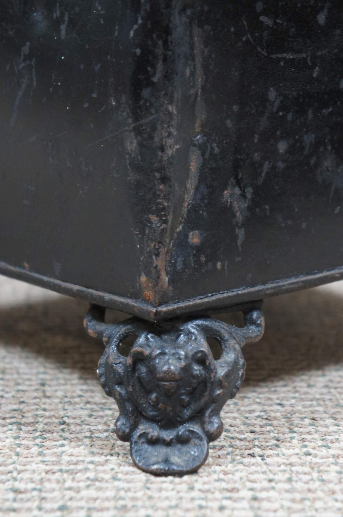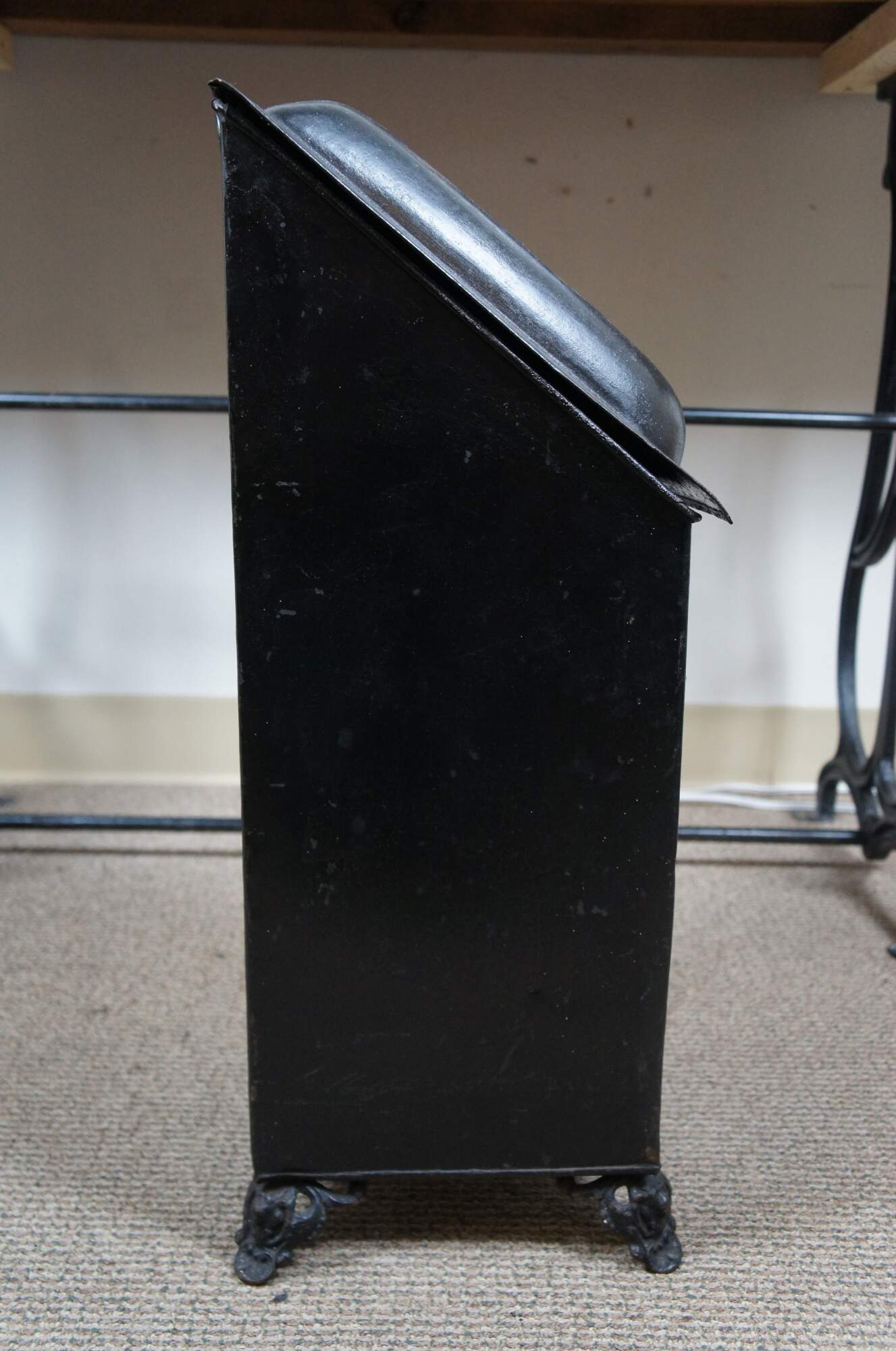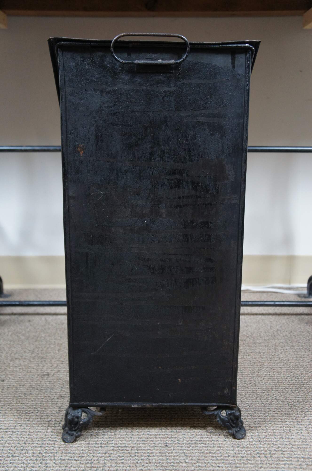 Early 20th century farmhouse black tin fireplace coal scuttle / hearthware bucket / bin. Rectangular form with slanted lid, embellished with applied orange and yellow flowers. Lions head feet; decorative ring on the front featuring an art nouveau female face. Includes black painted insert.