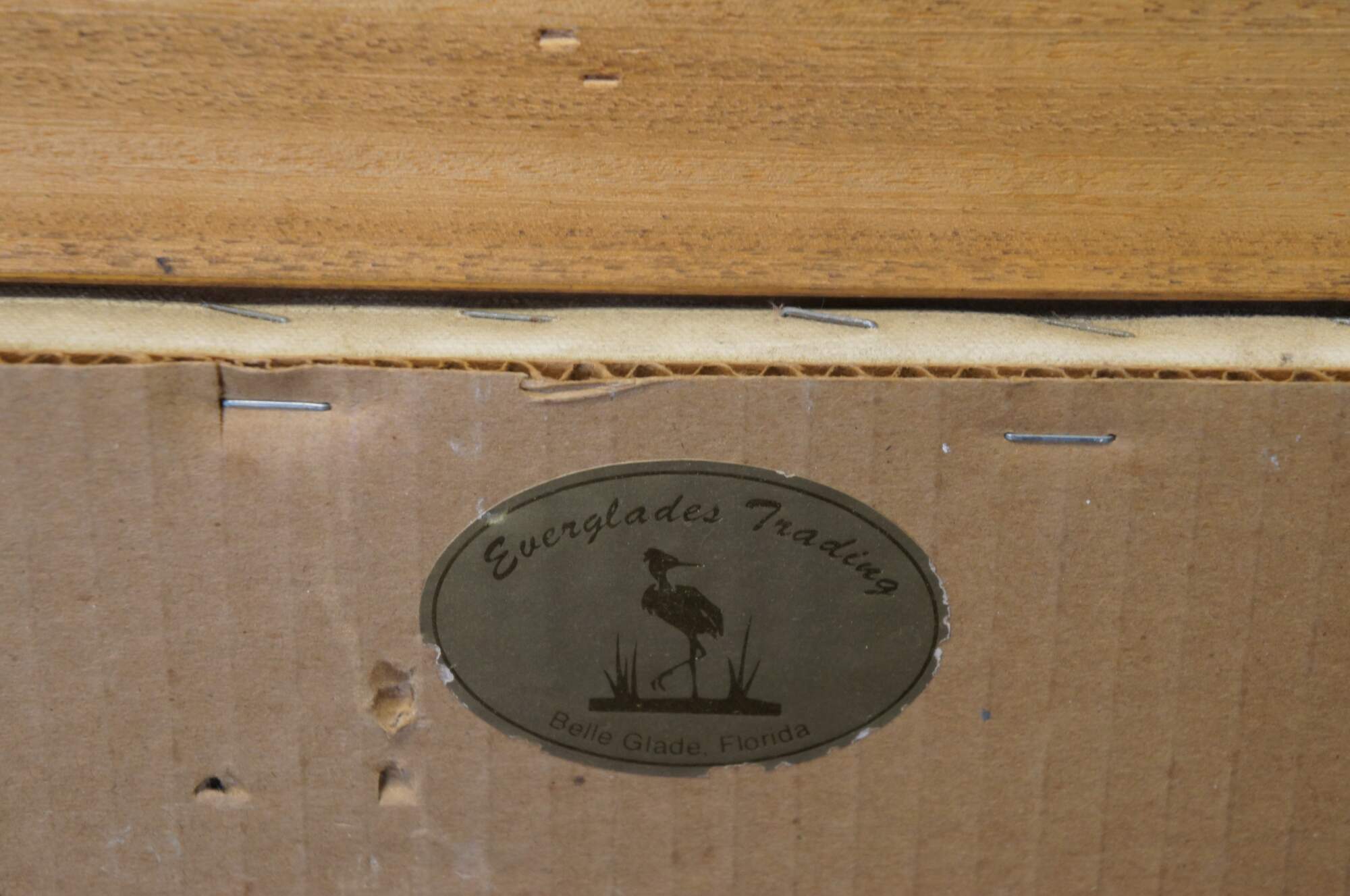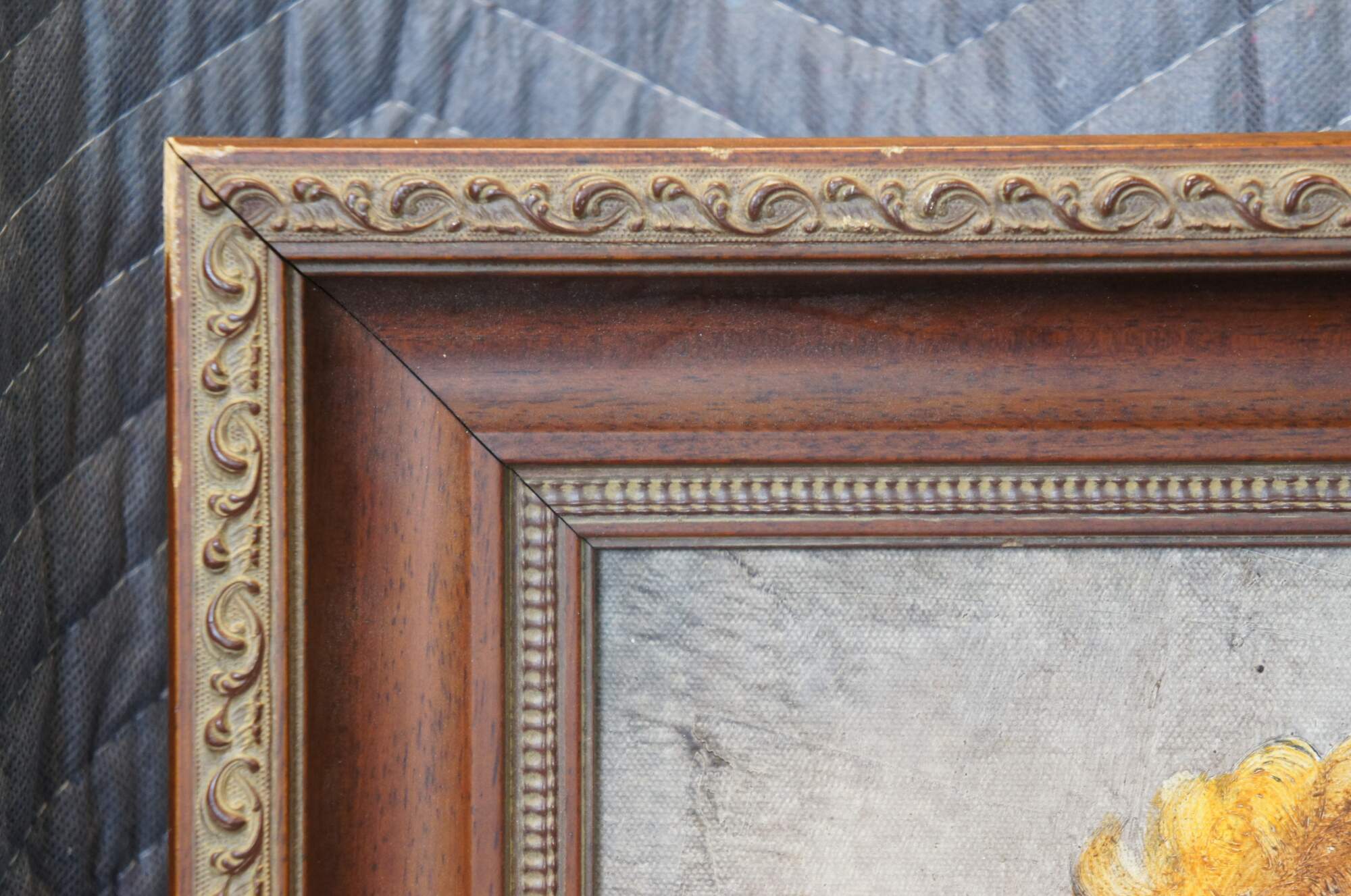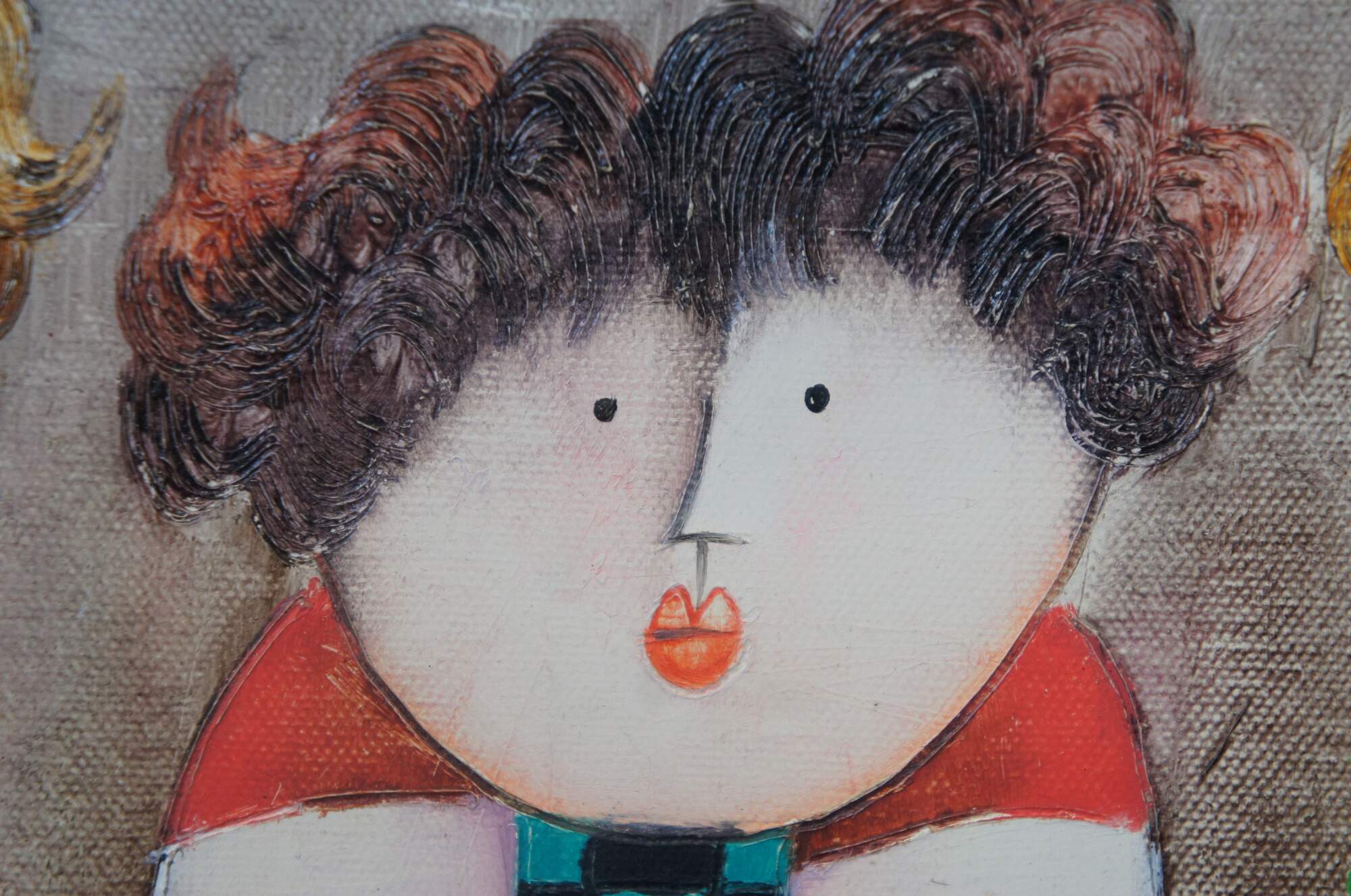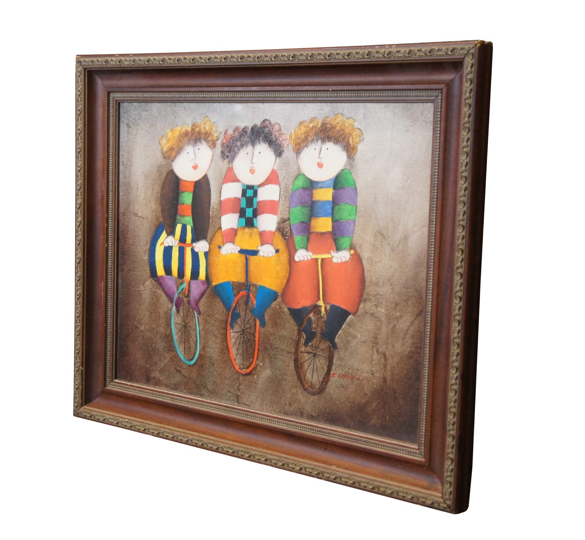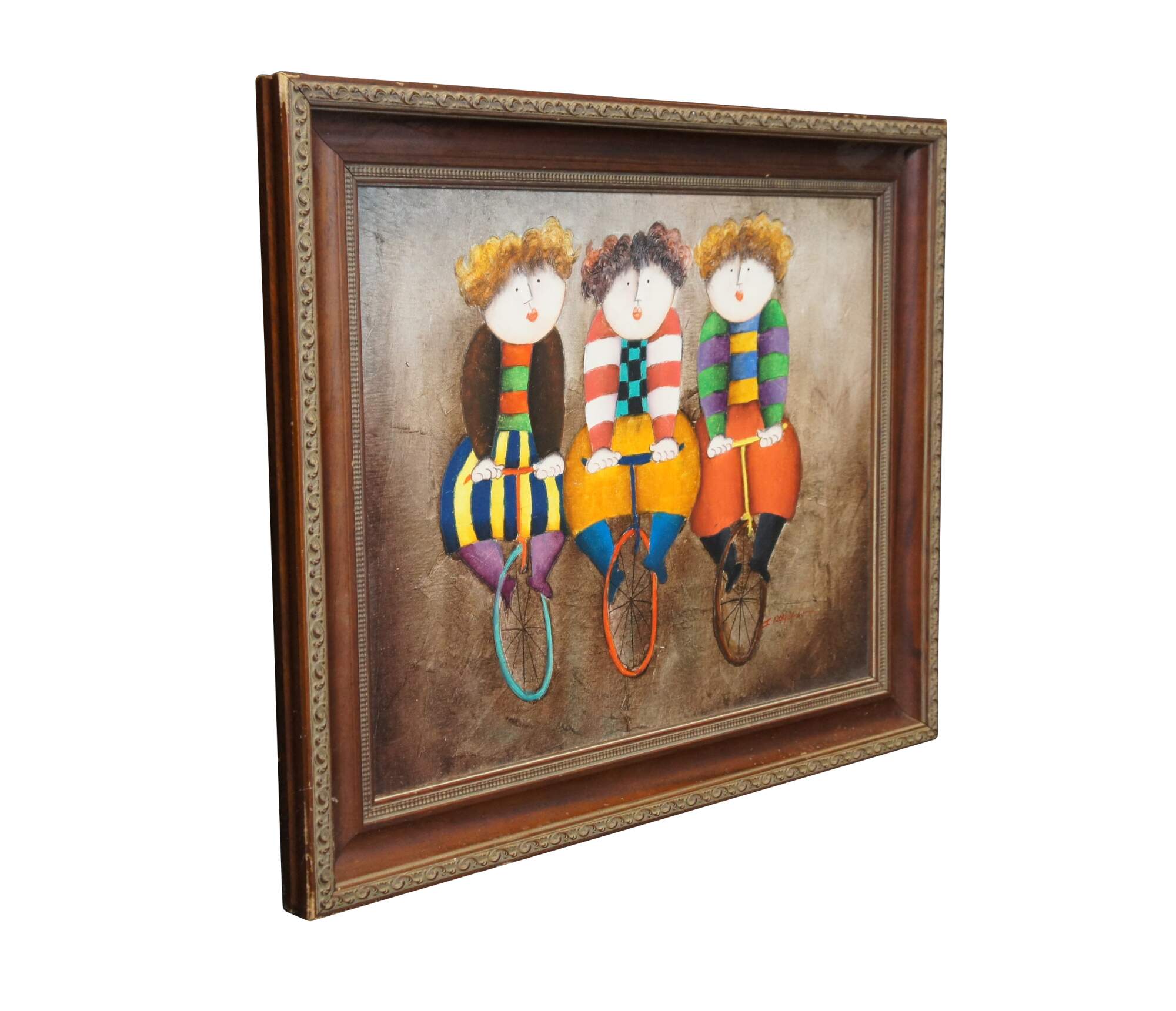 Late 20th century oil on canvas painting by Joyce Roybal depicting a trio of figures in brightly colored, multi-patterned clothing on unicycles. Beveled wood frame with foliate and thumbprint detail.
