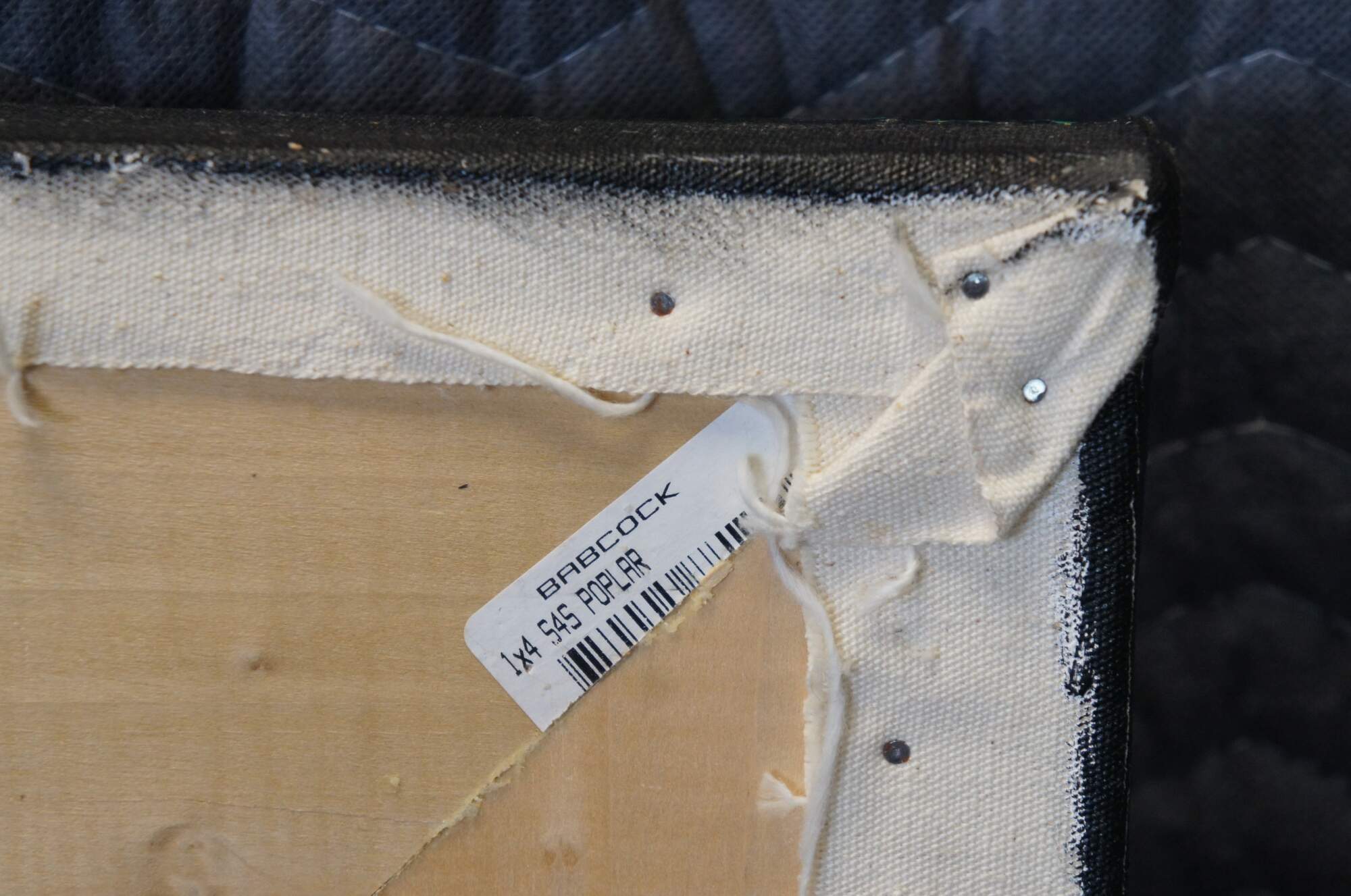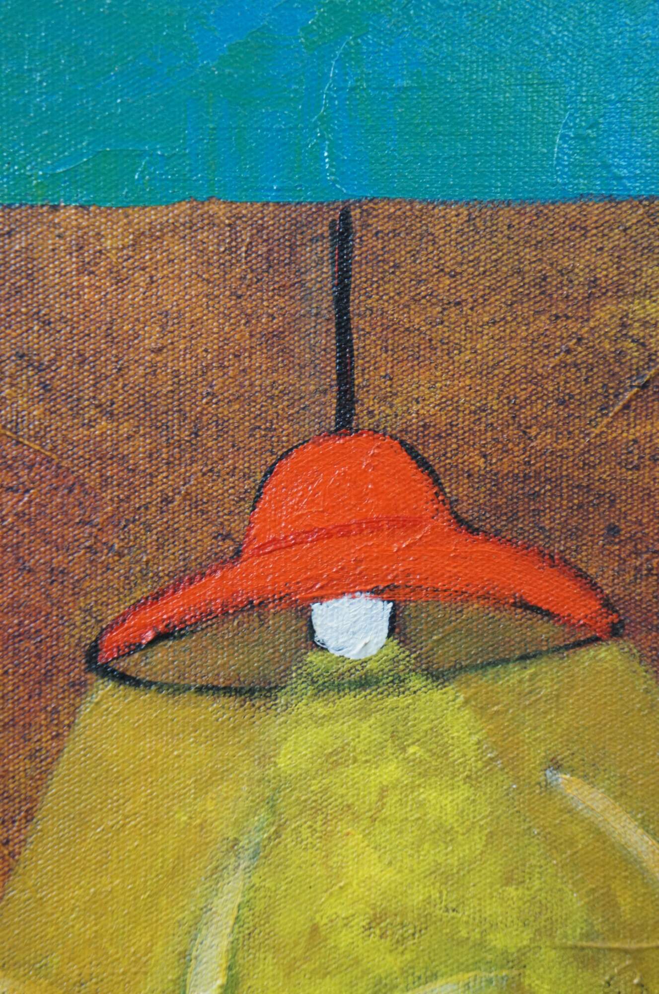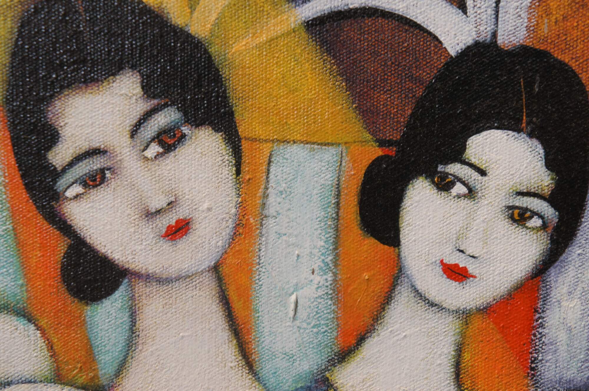 2004 oil on canvas painting by Mirta Cwirko depicting a trio of dancers with layered skirts and feathers in their hair under the light of a hanging lamp. Signed and dated along right edge. Un-framed.