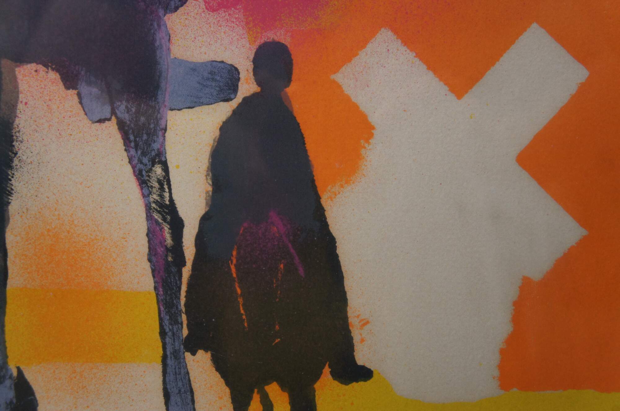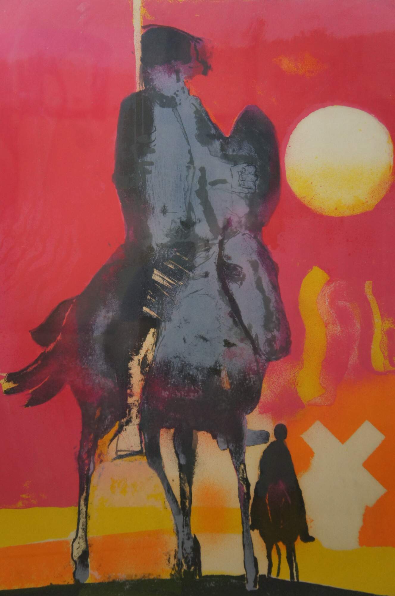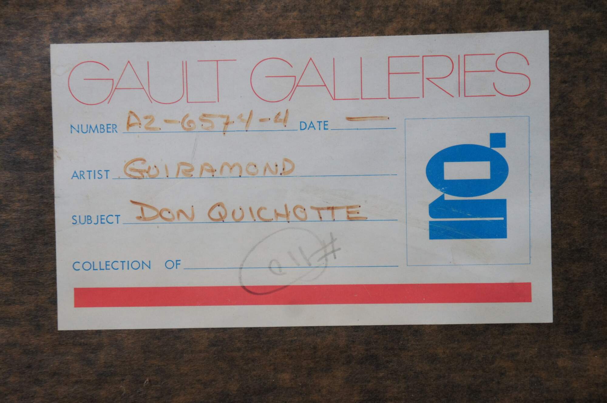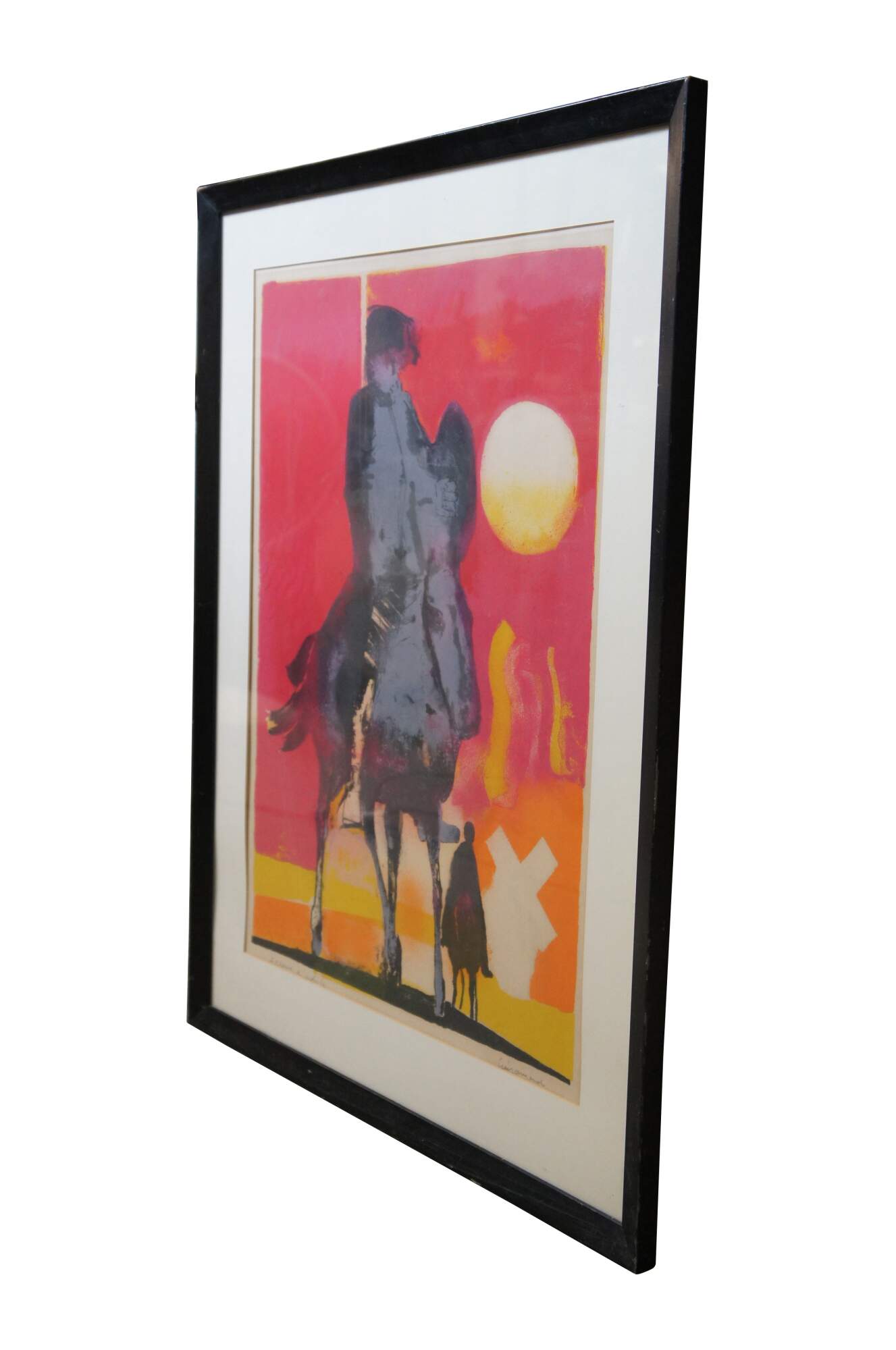 Mid to late 20th century lithograph print by Paul Guiramand, depicting Don Quixote (Quichotte) on his horse through the sunset, followed by his companion Sancho Panza and a windmill in the background. Pencil signed along bottom edge. Black beveled wood frame; white mat. Gault Galleries Arizona.