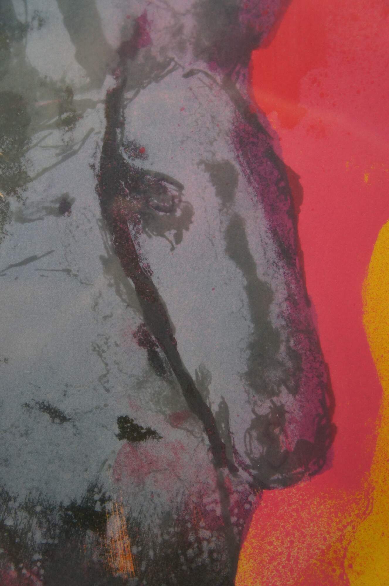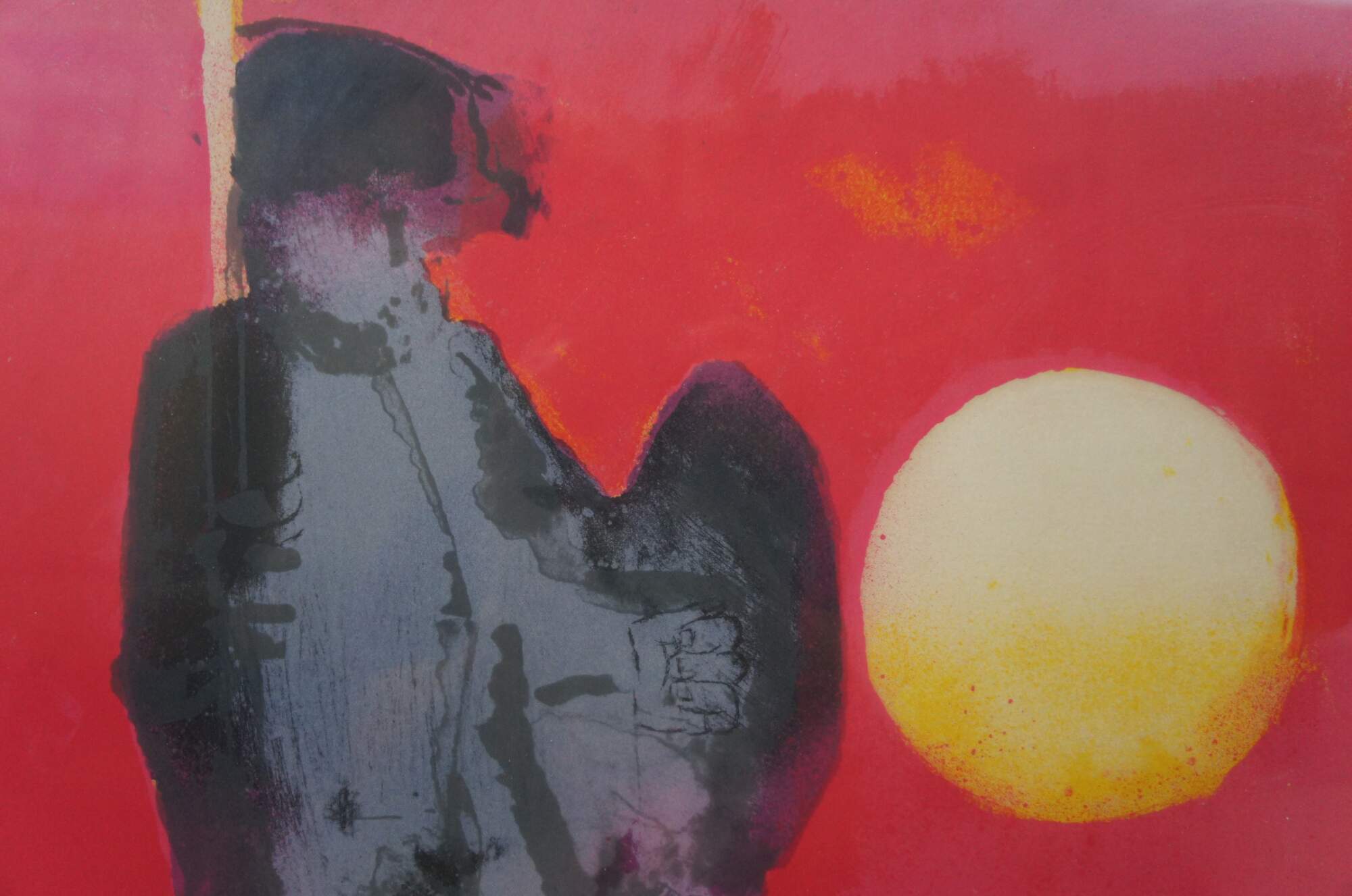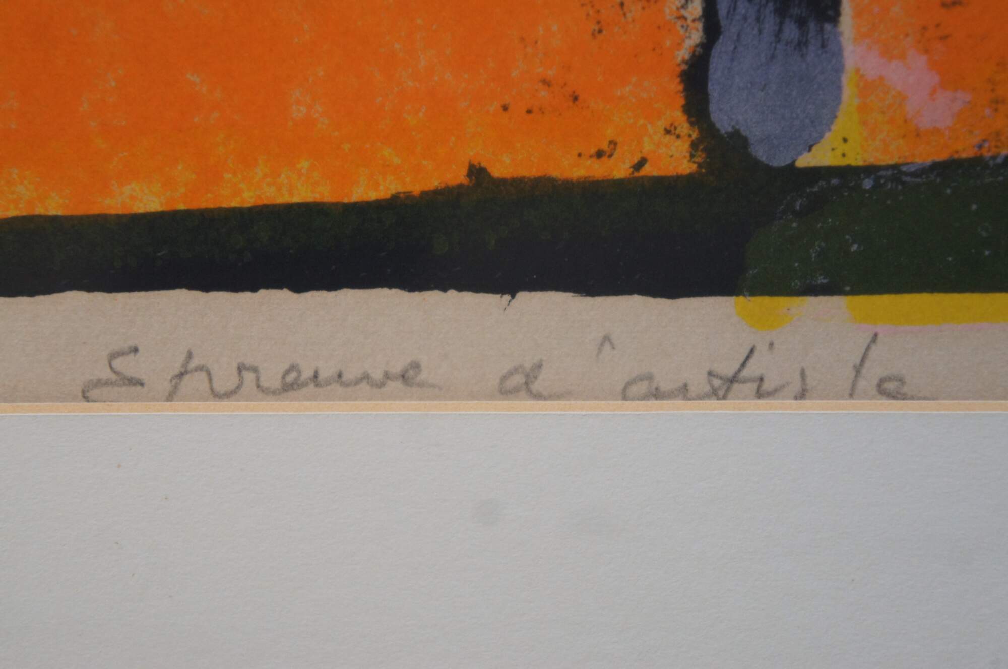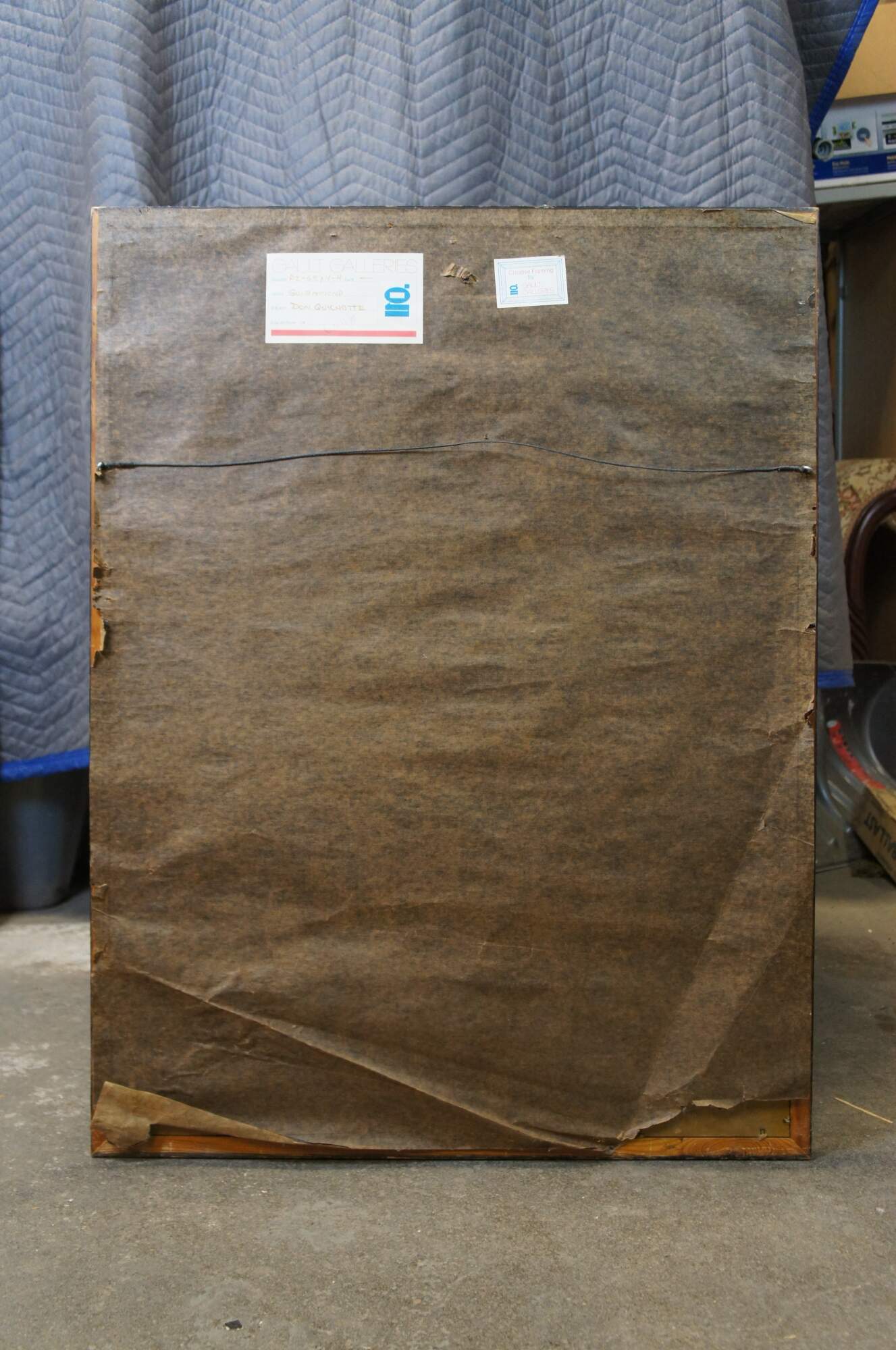 Mid to late 20th century lithograph print by Paul Guiramand, depicting Don Quixote (Quichotte) on his horse through the sunset, followed by his companion Sancho Panza and a windmill in the background. Pencil signed along bottom edge. Black beveled wood frame; white mat. Gault Galleries Arizona.