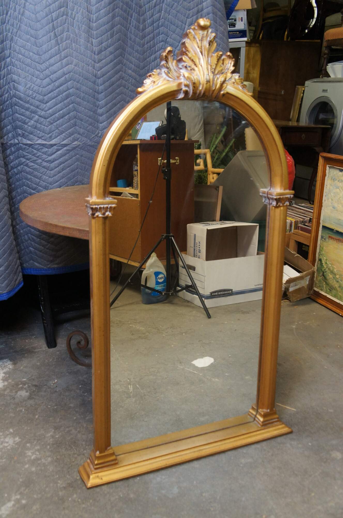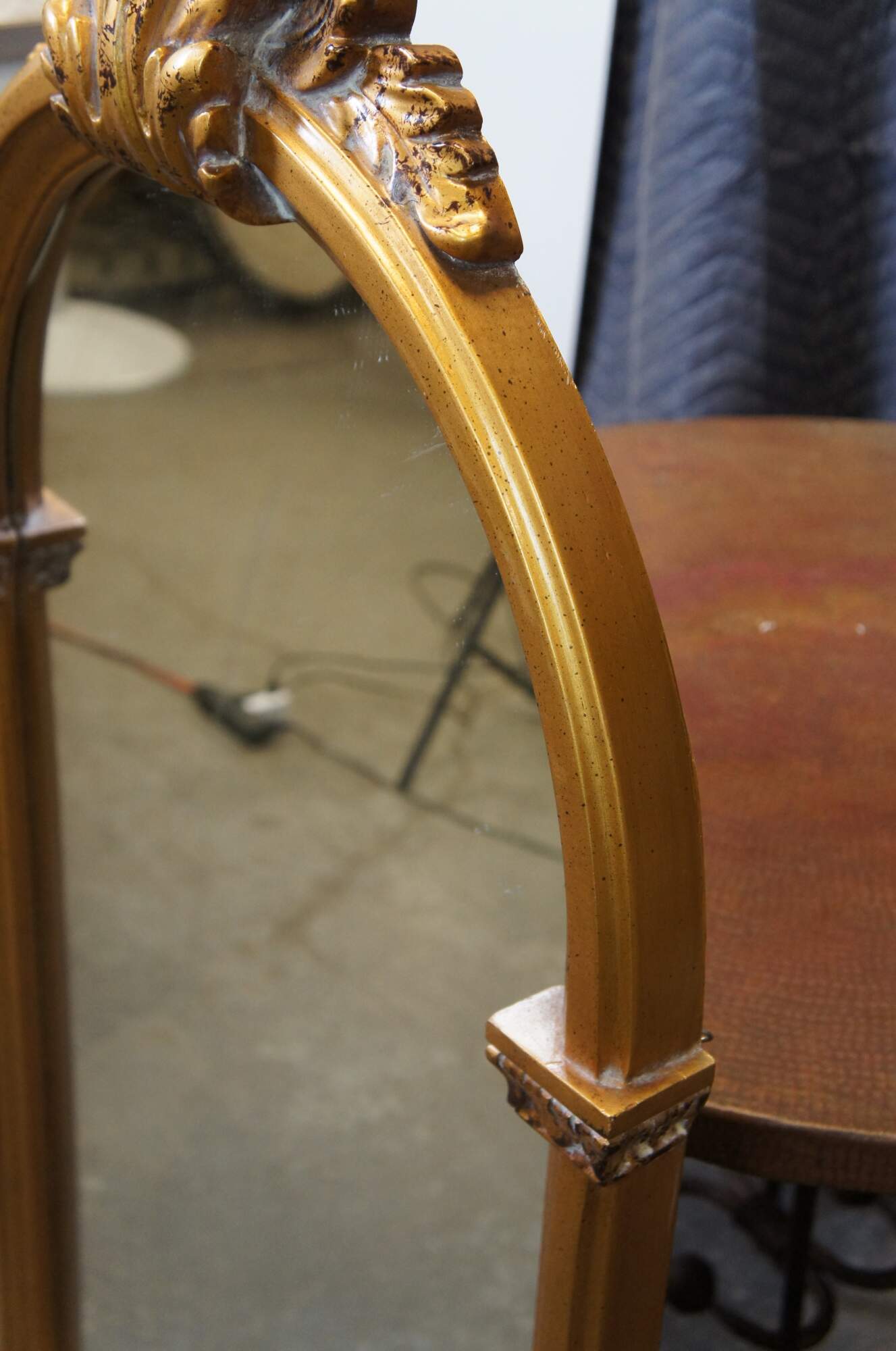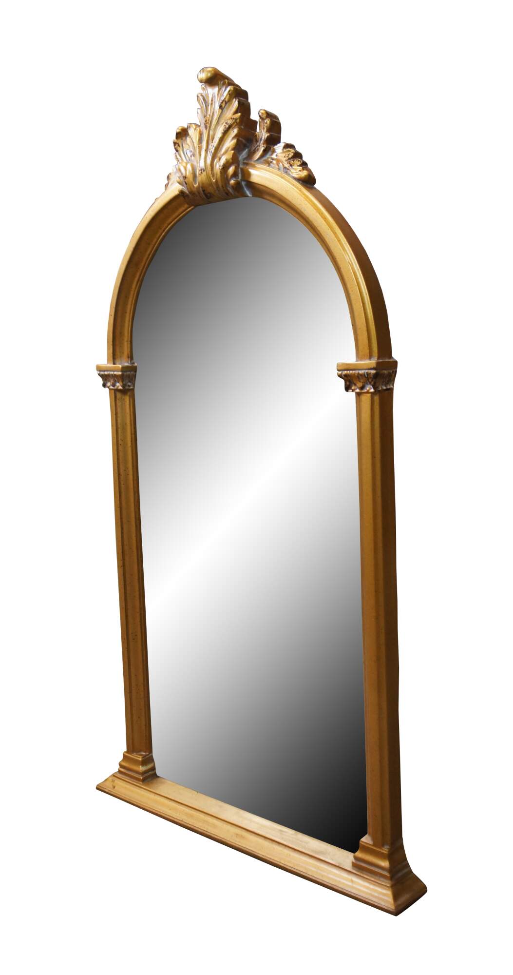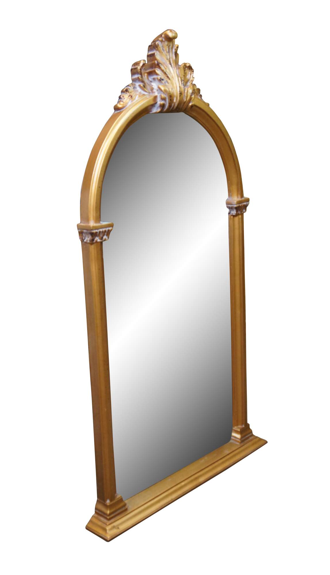 Late 20th century Hollywood Regency style wall hanging mirror featuring an arched shape flanked with a footed base, simple leaf topped columns at the sides, and a tall acanthus leaf crest at the top. Painted in bright gold, antiqued with black speckling