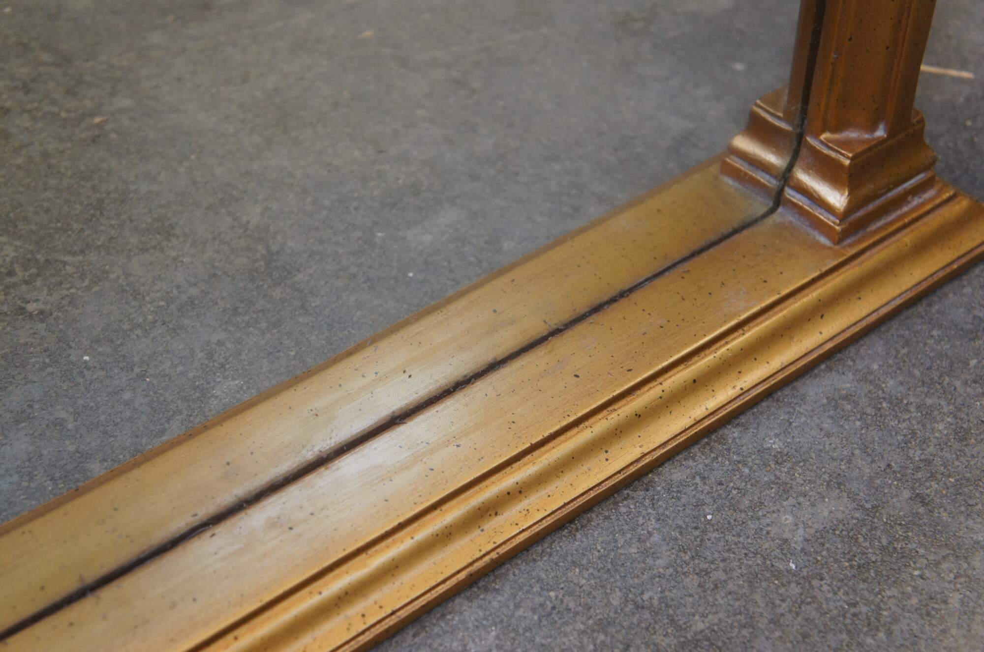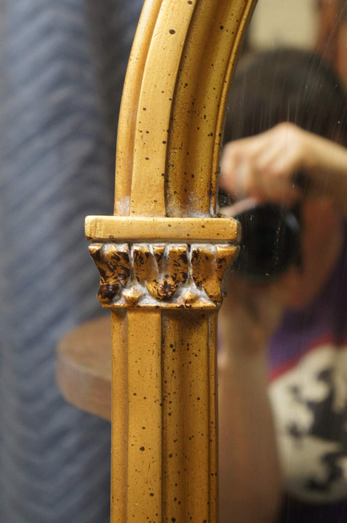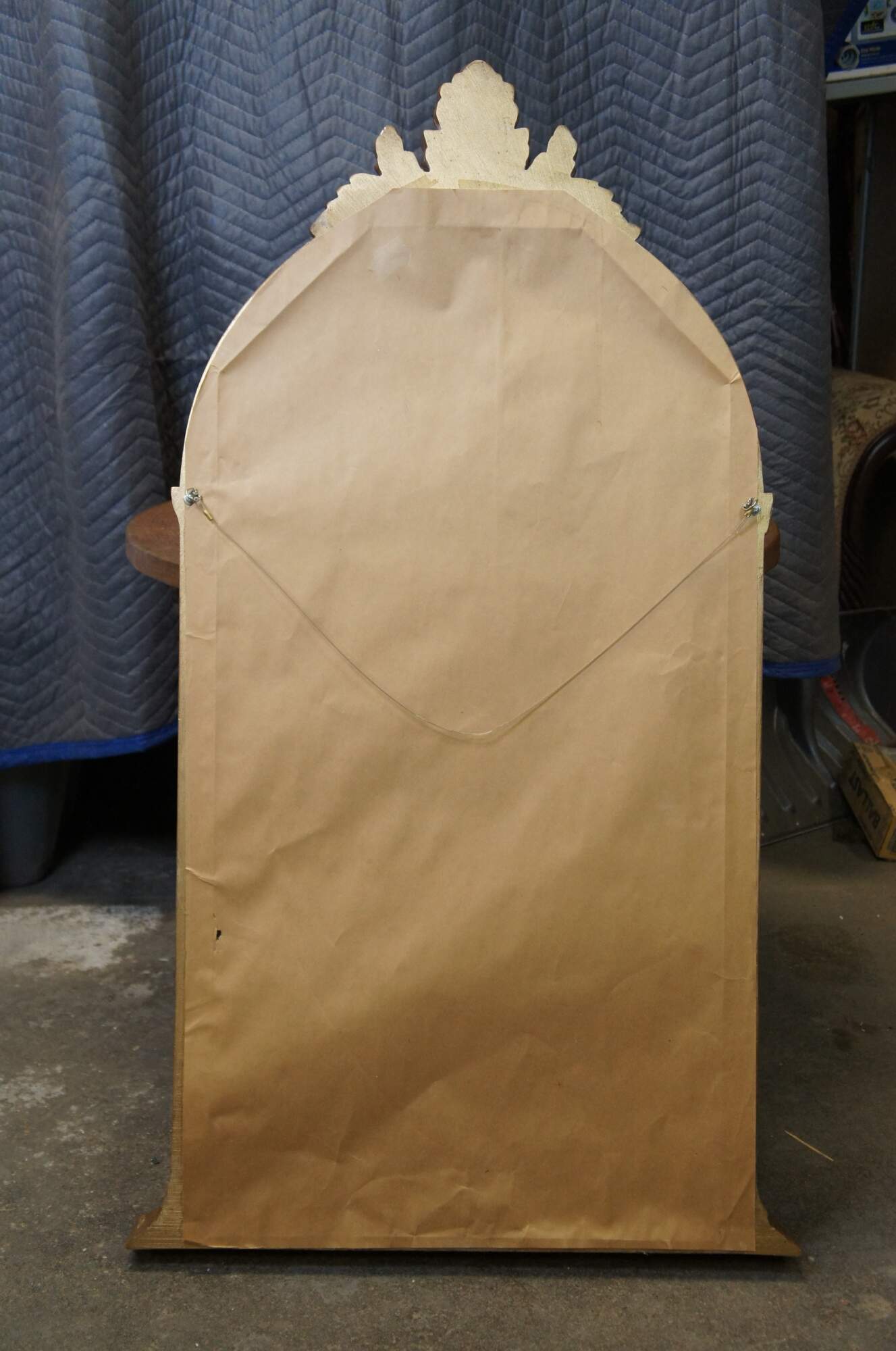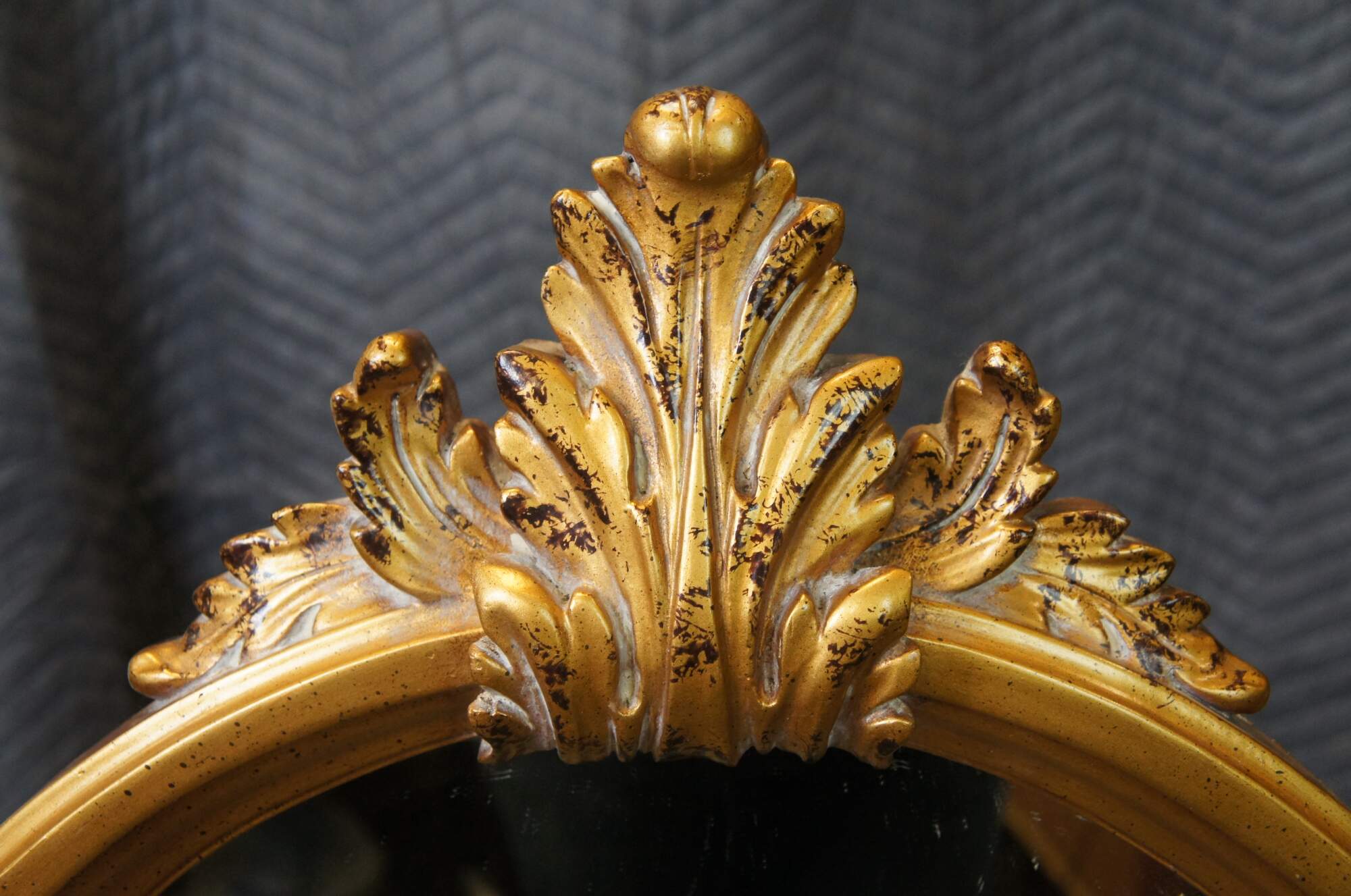 Late 20th century Hollywood Regency style wall hanging mirror featuring an arched shape flanked with a footed base, simple leaf topped columns at the sides, and a tall acanthus leaf crest at the top. Painted in bright gold, antiqued with black speckling