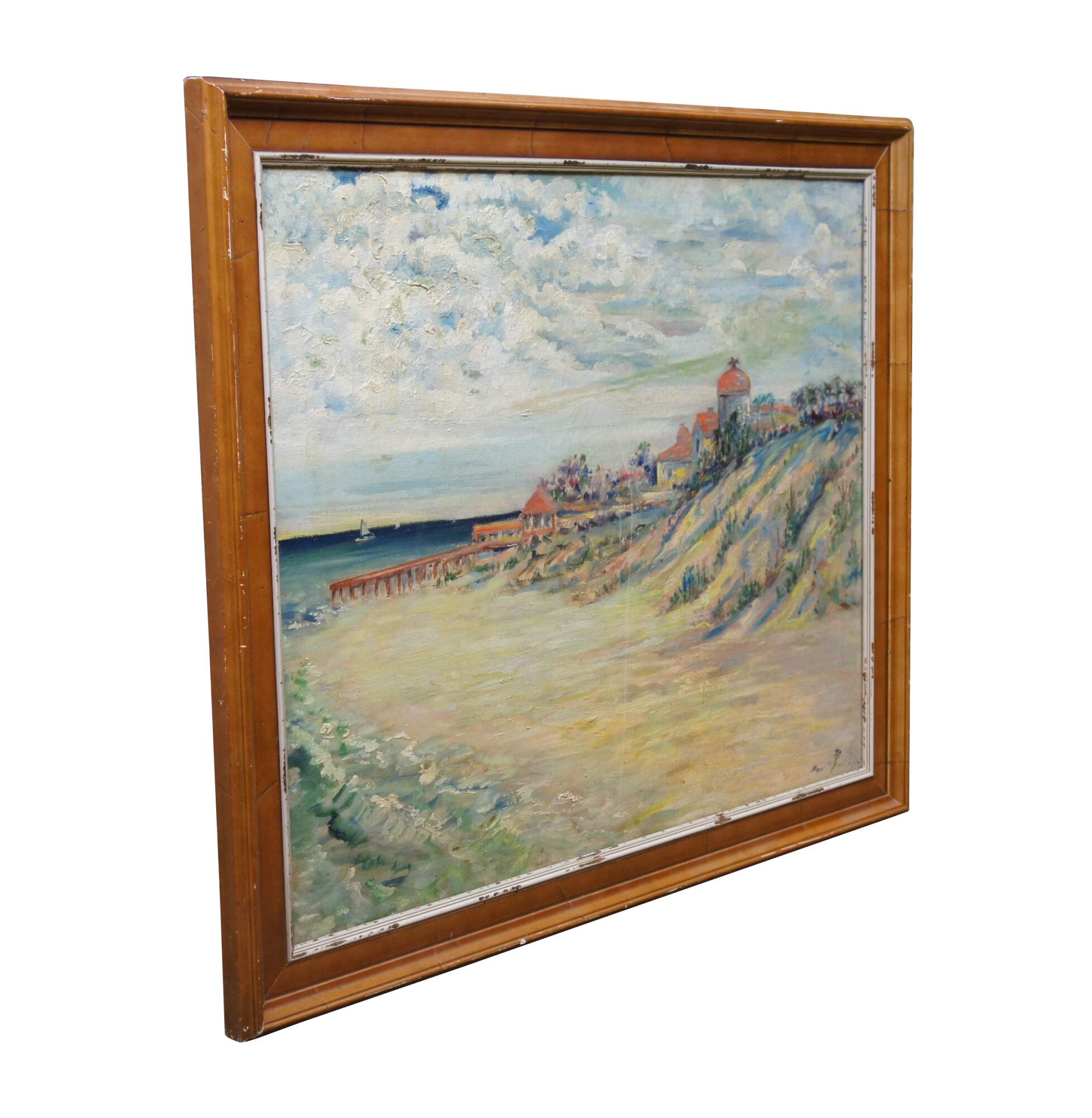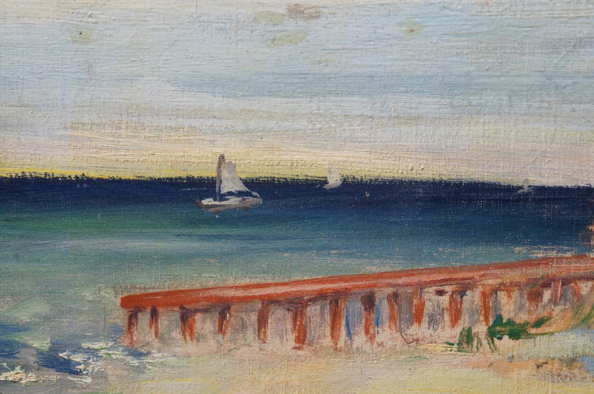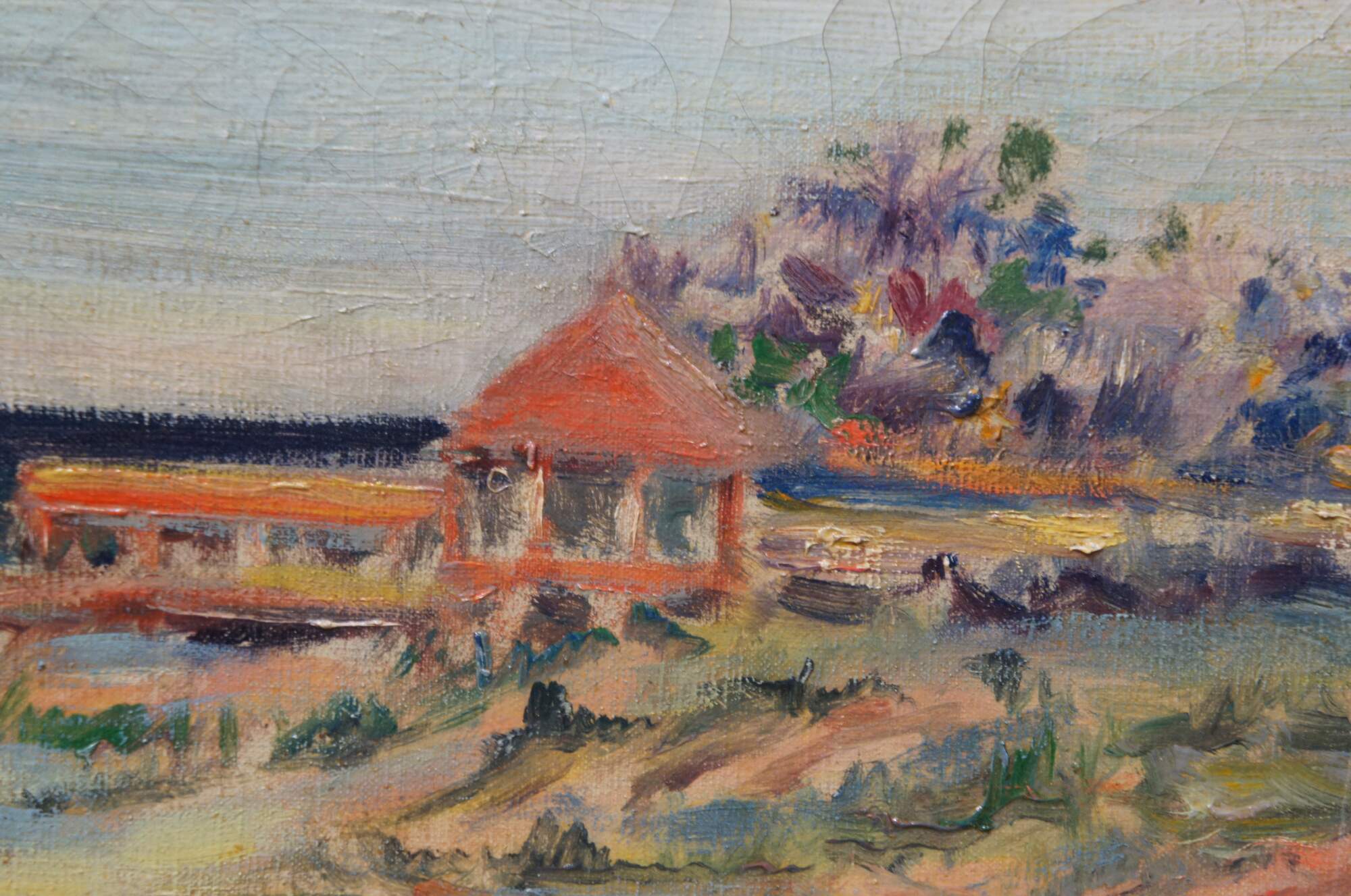 Circa early 20th century oil on canvas impressionist landscape painting showing a smooth coastline beach at the base of a sand dune topped with red roofed buildings and a dock, sailboats floating in the background under voluminous clouds. Signed in lower right corner. Beveled wood frame with gilt inner edge and artictic distressing.