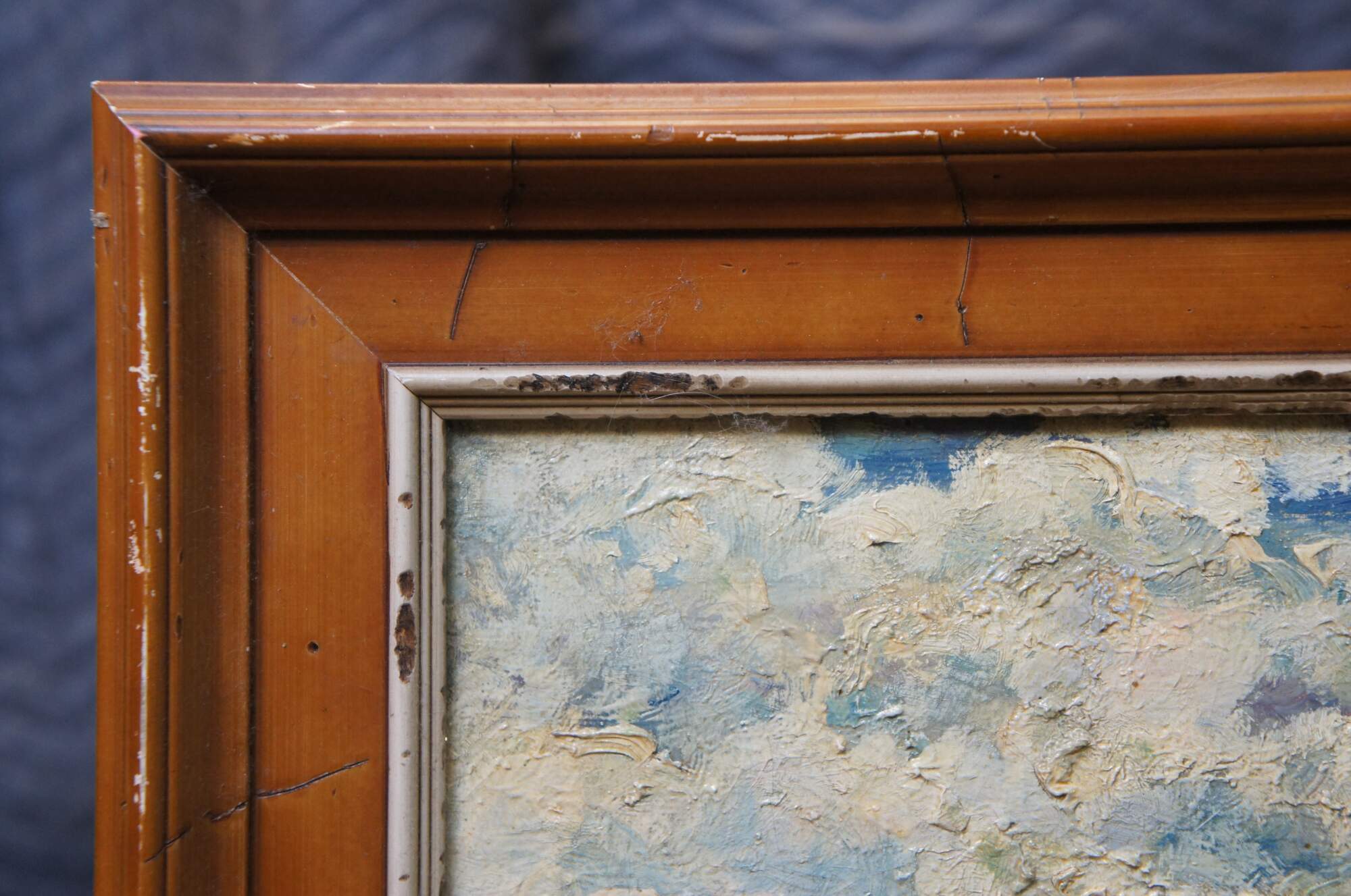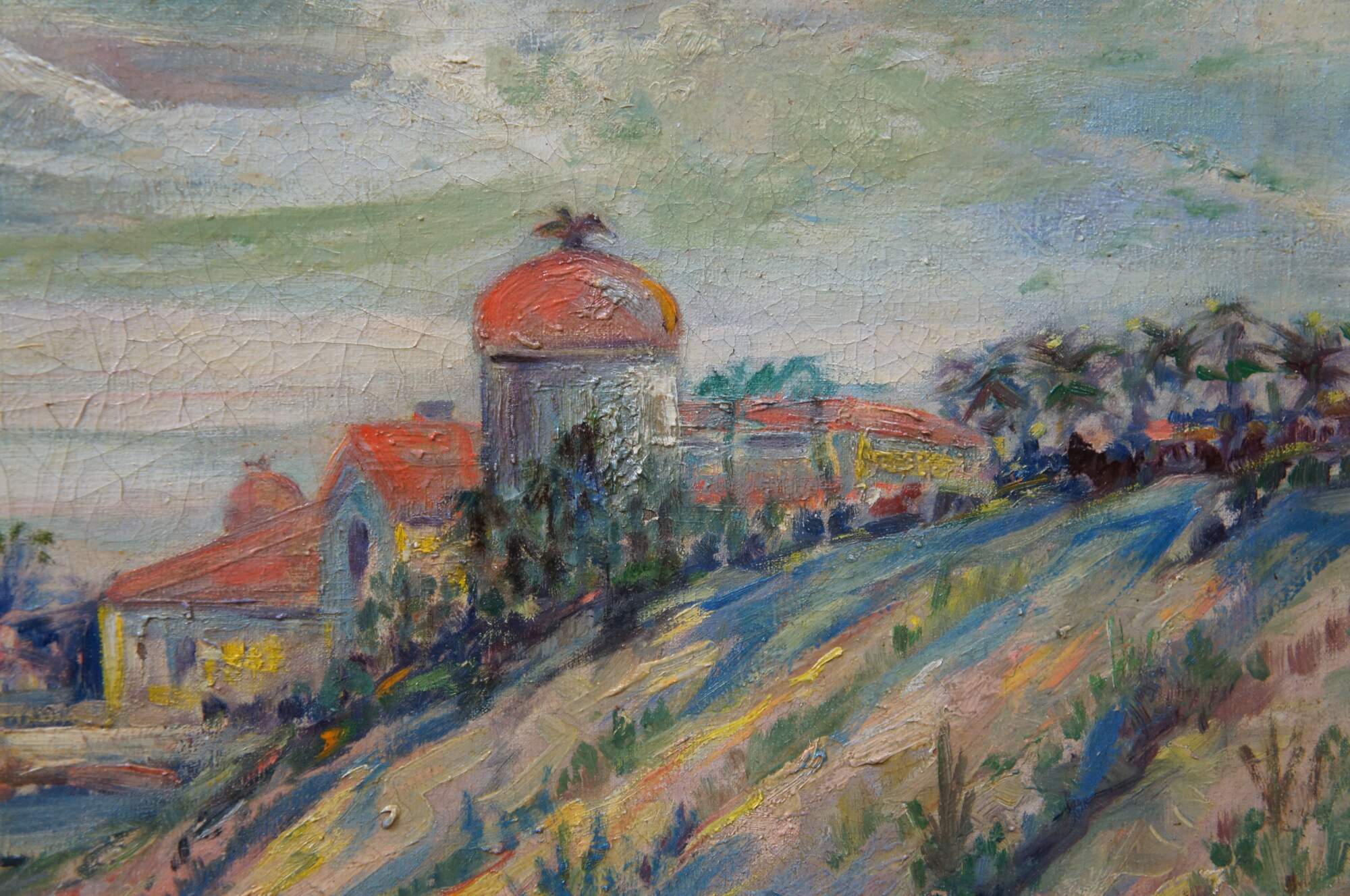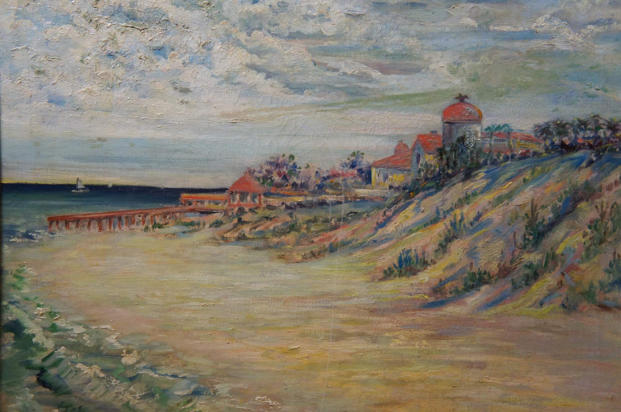 Circa early 20th century oil on canvas impressionist landscape painting showing a smooth coastline beach at the base of a sand dune topped with red roofed buildings and a dock, sailboats floating in the background under voluminous clouds. Signed in lower right corner. Beveled wood frame with gilt inner edge and artictic distressing.