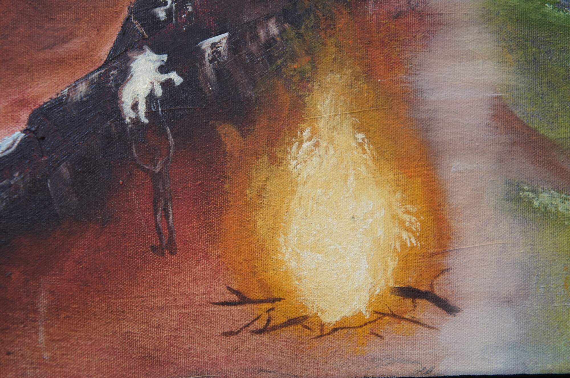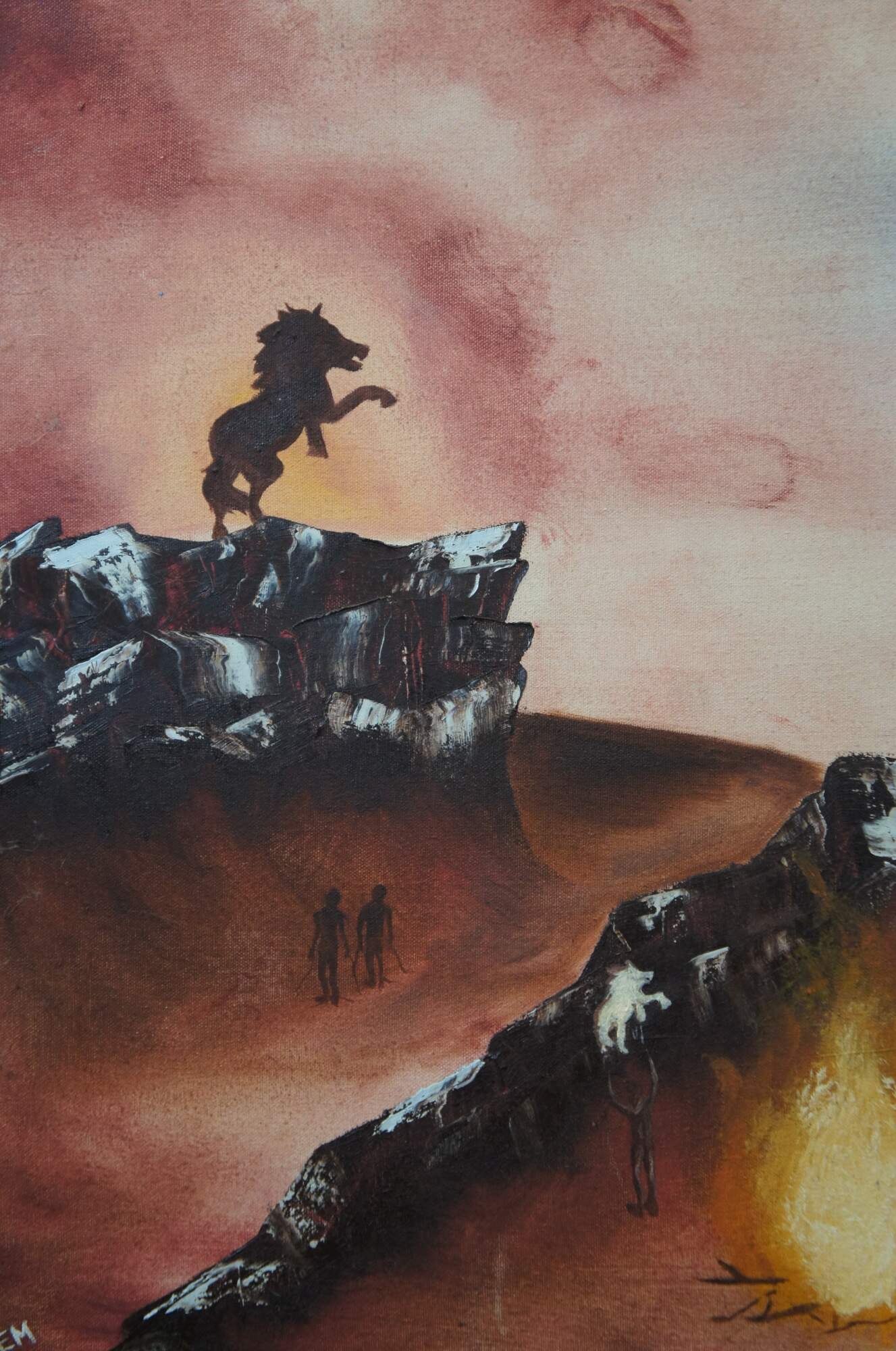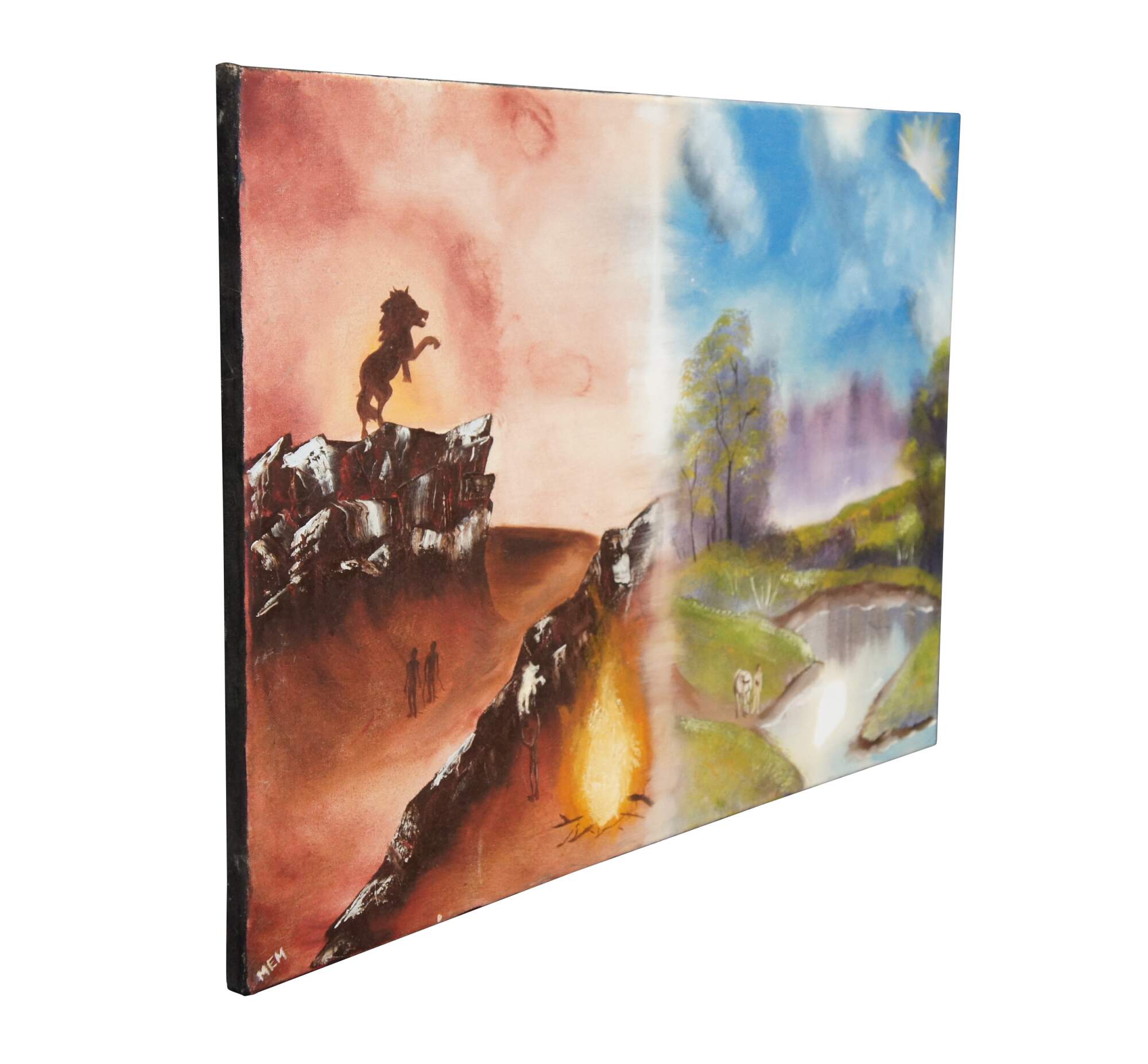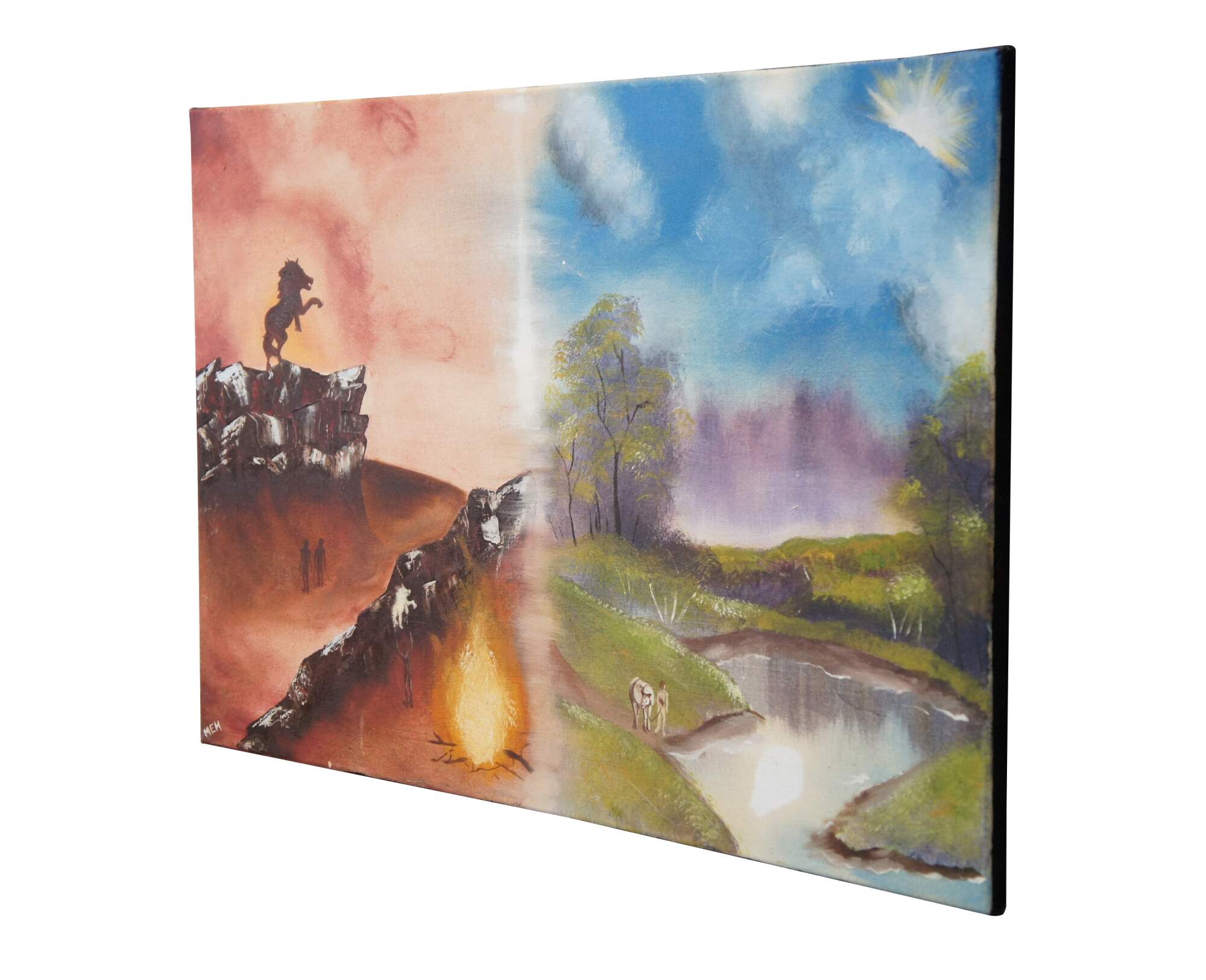 Unique late 20th century original folk art oil painting on canvas featuring a contrasting pair of night and day / heaven and hell scenes. On the left, a red, rocky, desolate shadow landscape with figures and a cliffside Stallion, and a man conjuring a wolf ghost near a bonfire. One the right, a lush, colorful, tree lined river, with a single nude figure leading a horse to the water. Signed MEM in lower left corner.