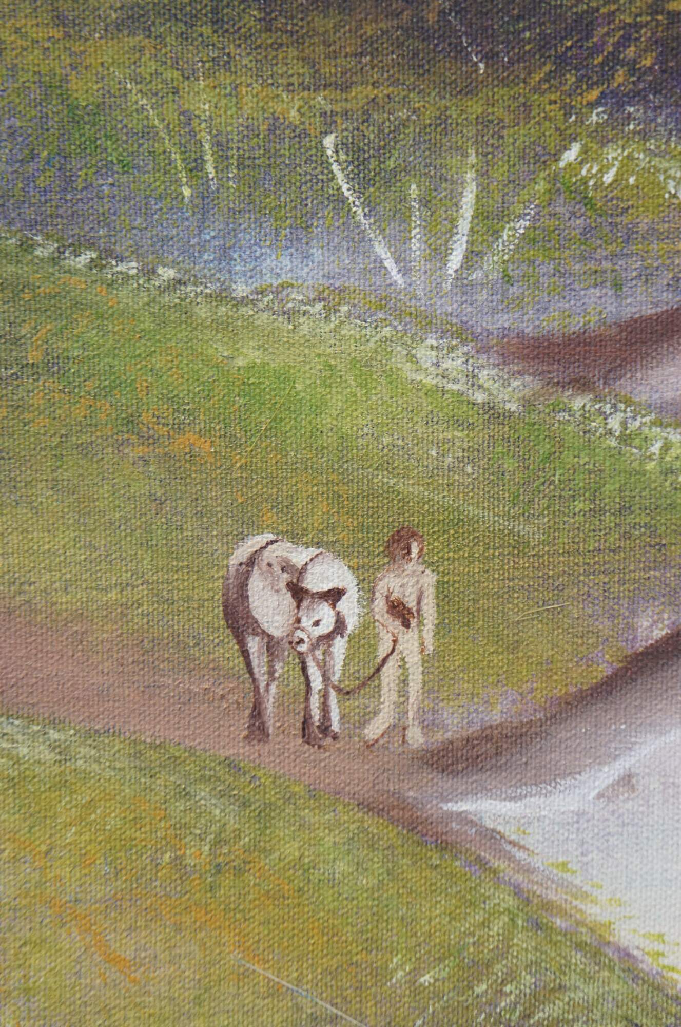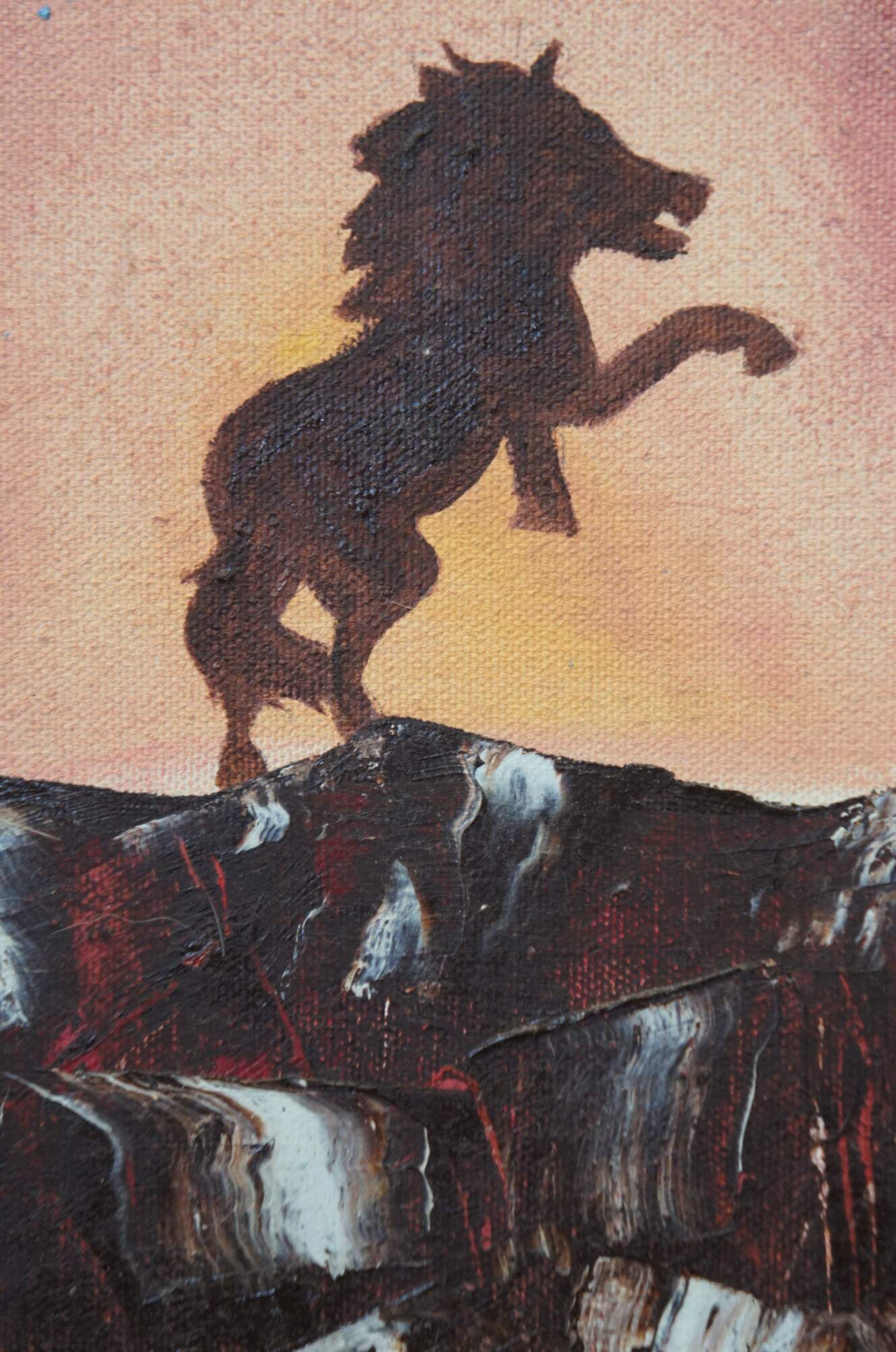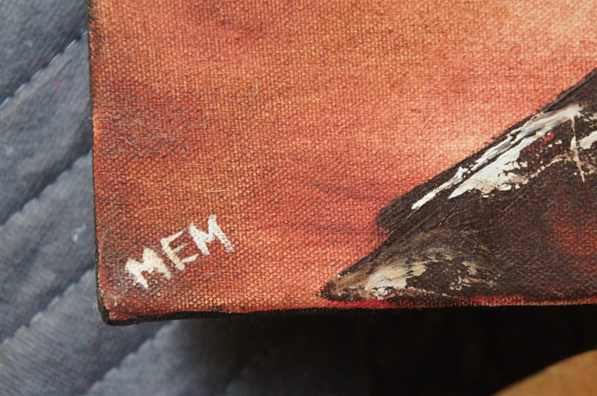 Unique late 20th century original folk art oil painting on canvas featuring a contrasting pair of night and day / heaven and hell scenes. On the left, a red, rocky, desolate shadow landscape with figures and a cliffside Stallion, and a man conjuring a wolf ghost near a bonfire. One the right, a lush, colorful, tree lined river, with a single nude figure leading a horse to the water. Signed MEM in lower left corner.