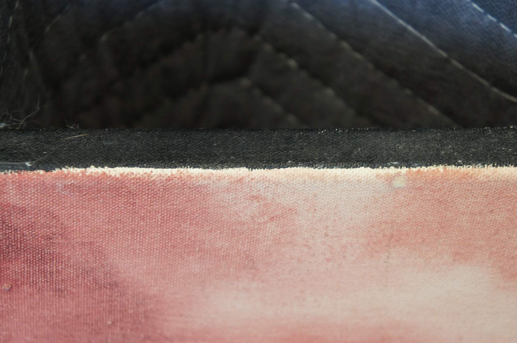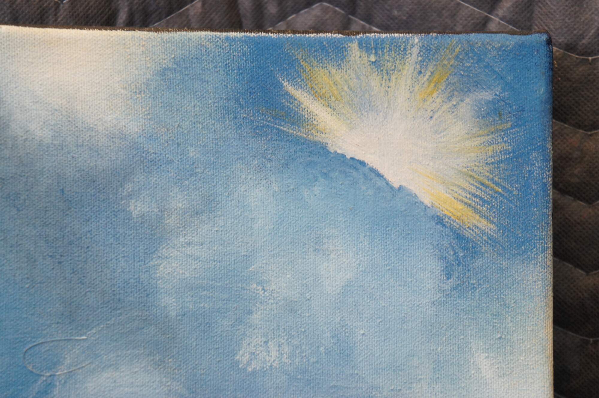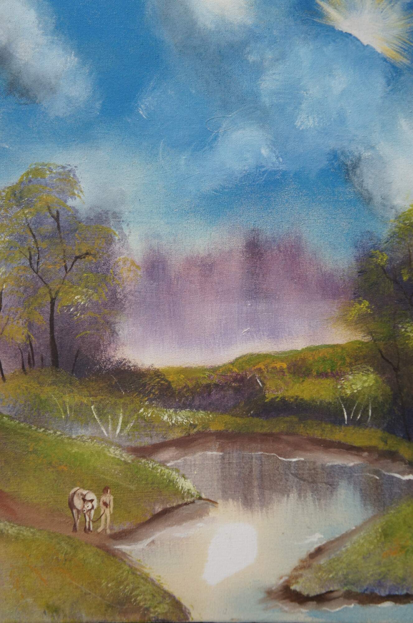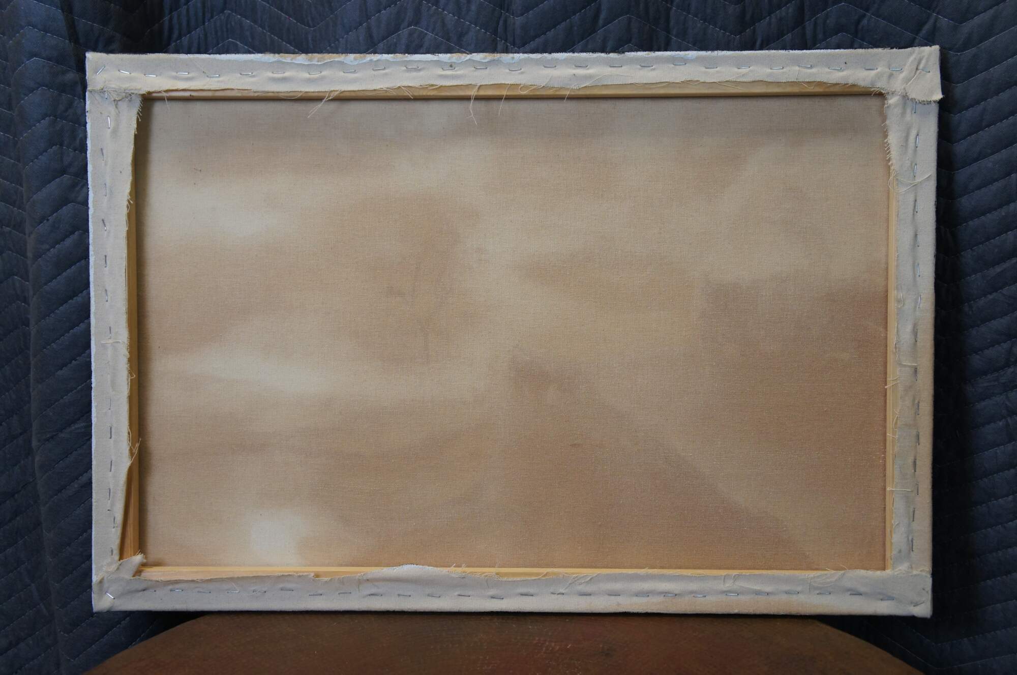 Unique late 20th century original folk art oil painting on canvas featuring a contrasting pair of night and day / heaven and hell scenes. On the left, a red, rocky, desolate shadow landscape with figures and a cliffside Stallion, and a man conjuring a wolf ghost near a bonfire. One the right, a lush, colorful, tree lined river, with a single nude figure leading a horse to the water. Signed MEM in lower left corner.