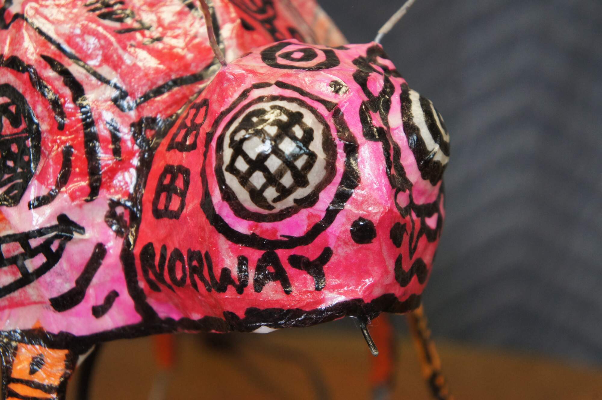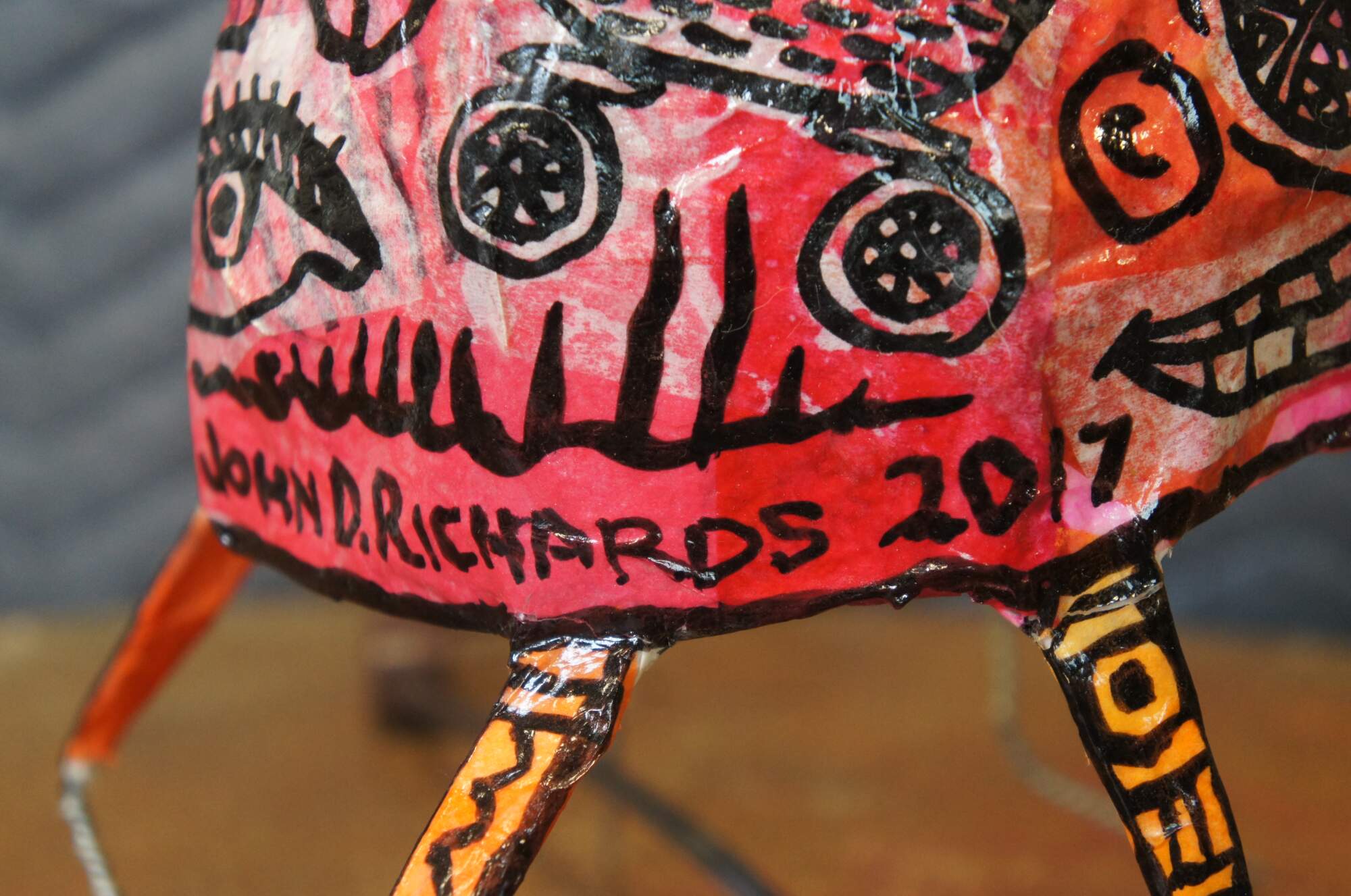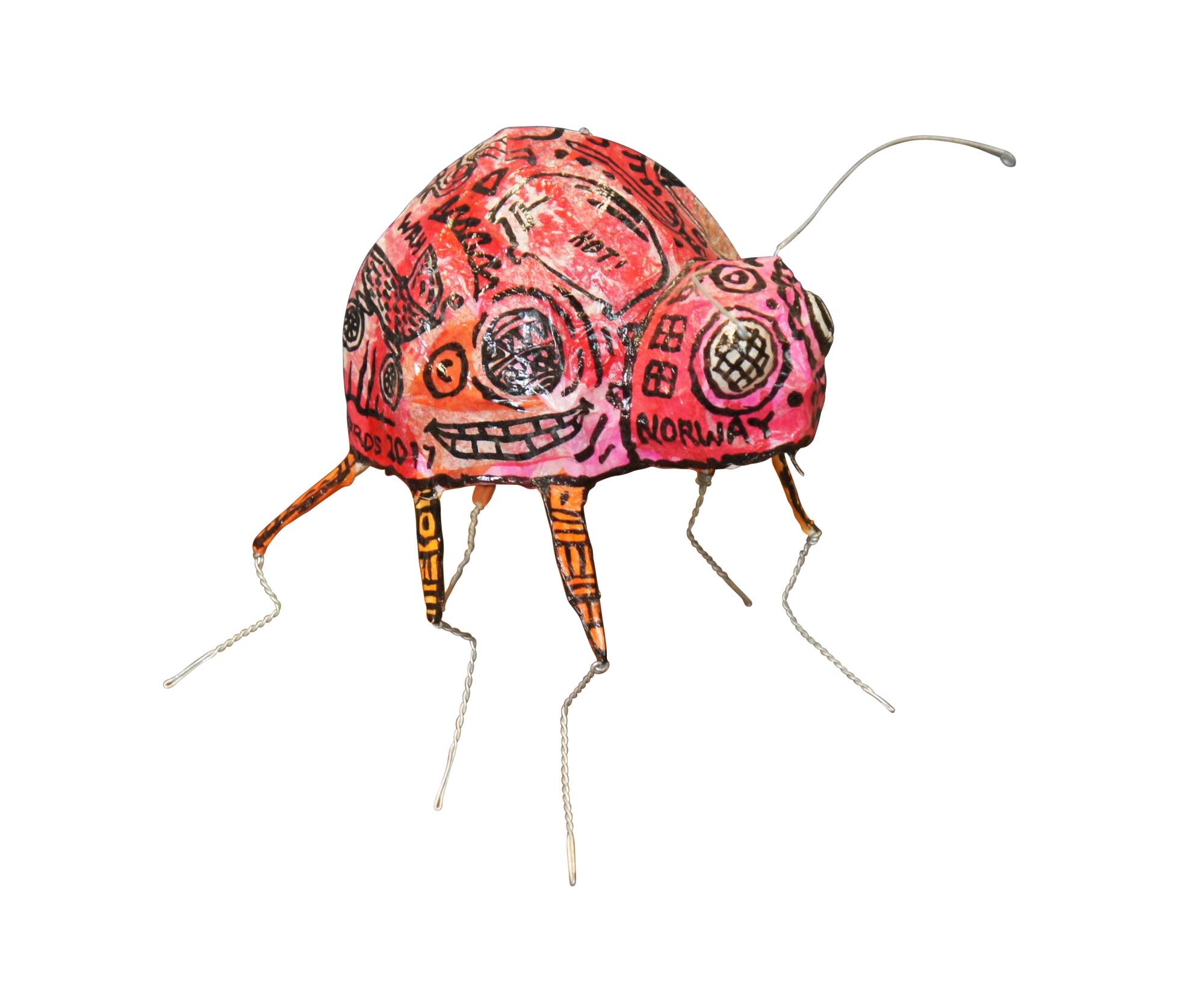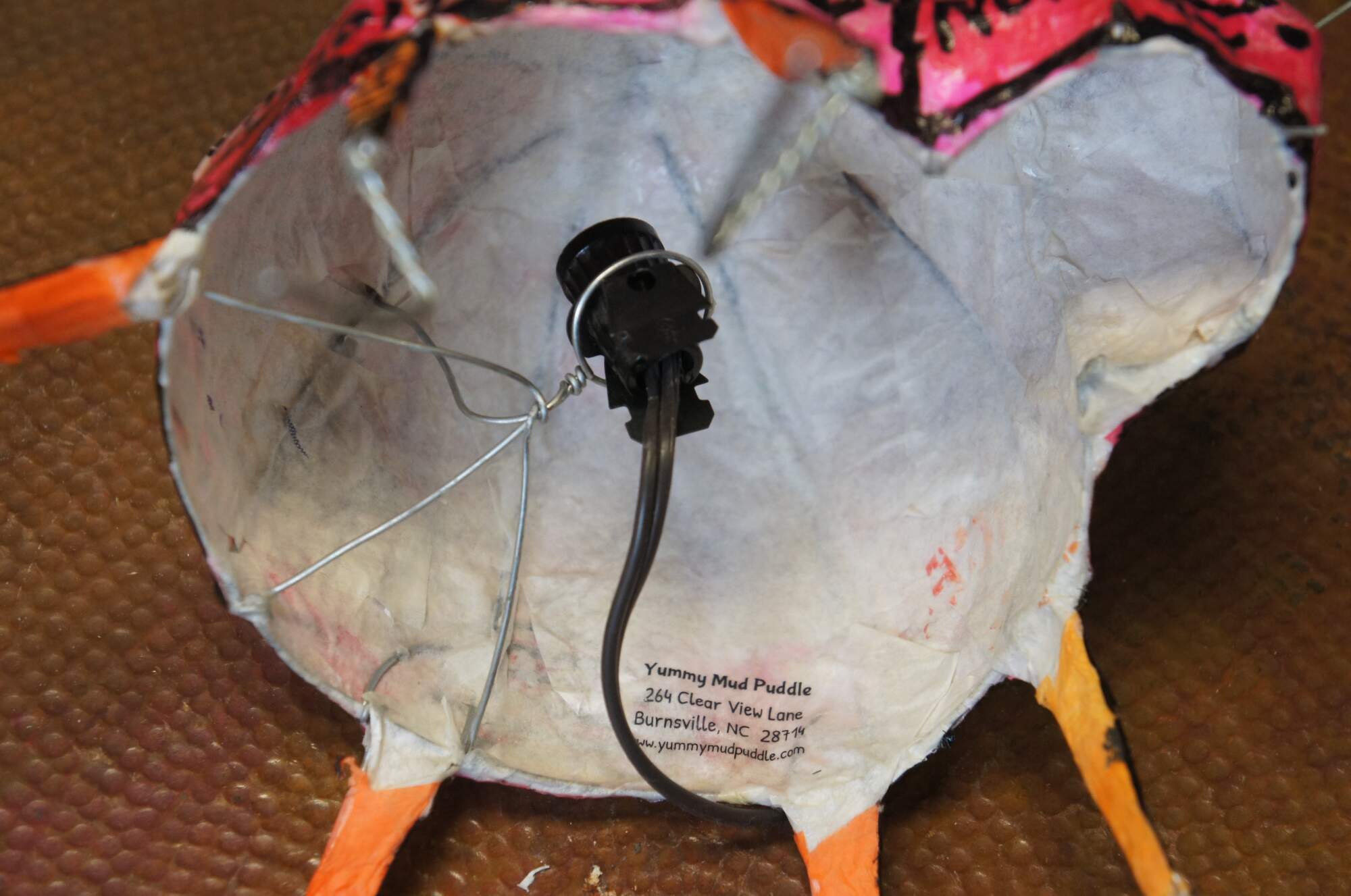 Rare vintage mixed media art nightlight in the shape of a pink and orange round backed bug covered in graffiti, crafted by John Richards of the Yummy Mud Puddle Gallery, Burnsville, North Carolina. Vinylized paper on wire frame. Signed and dated John Richards 2017 along one side of shell.