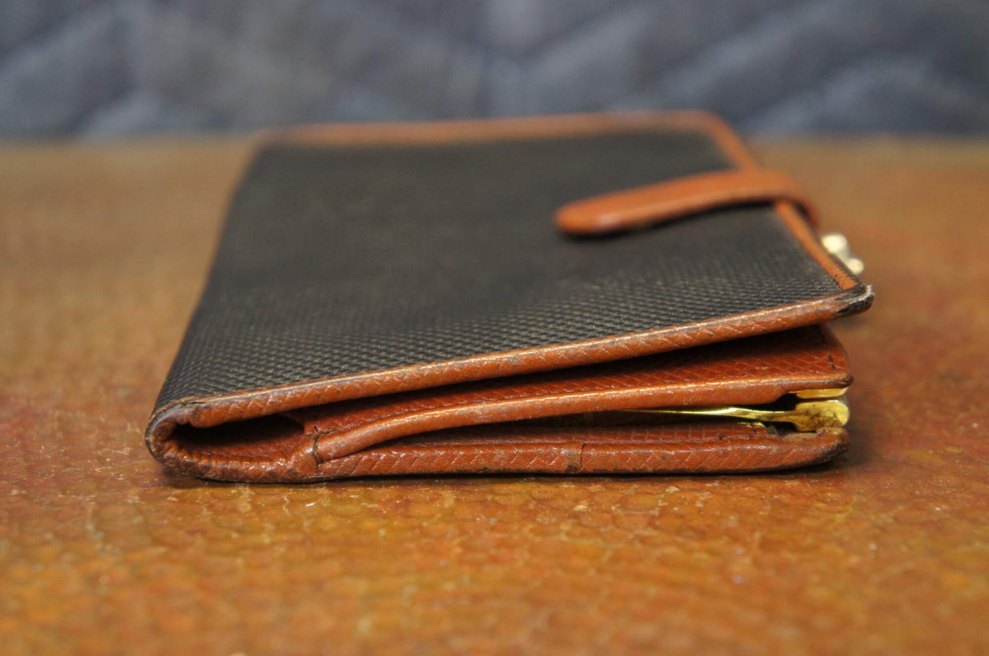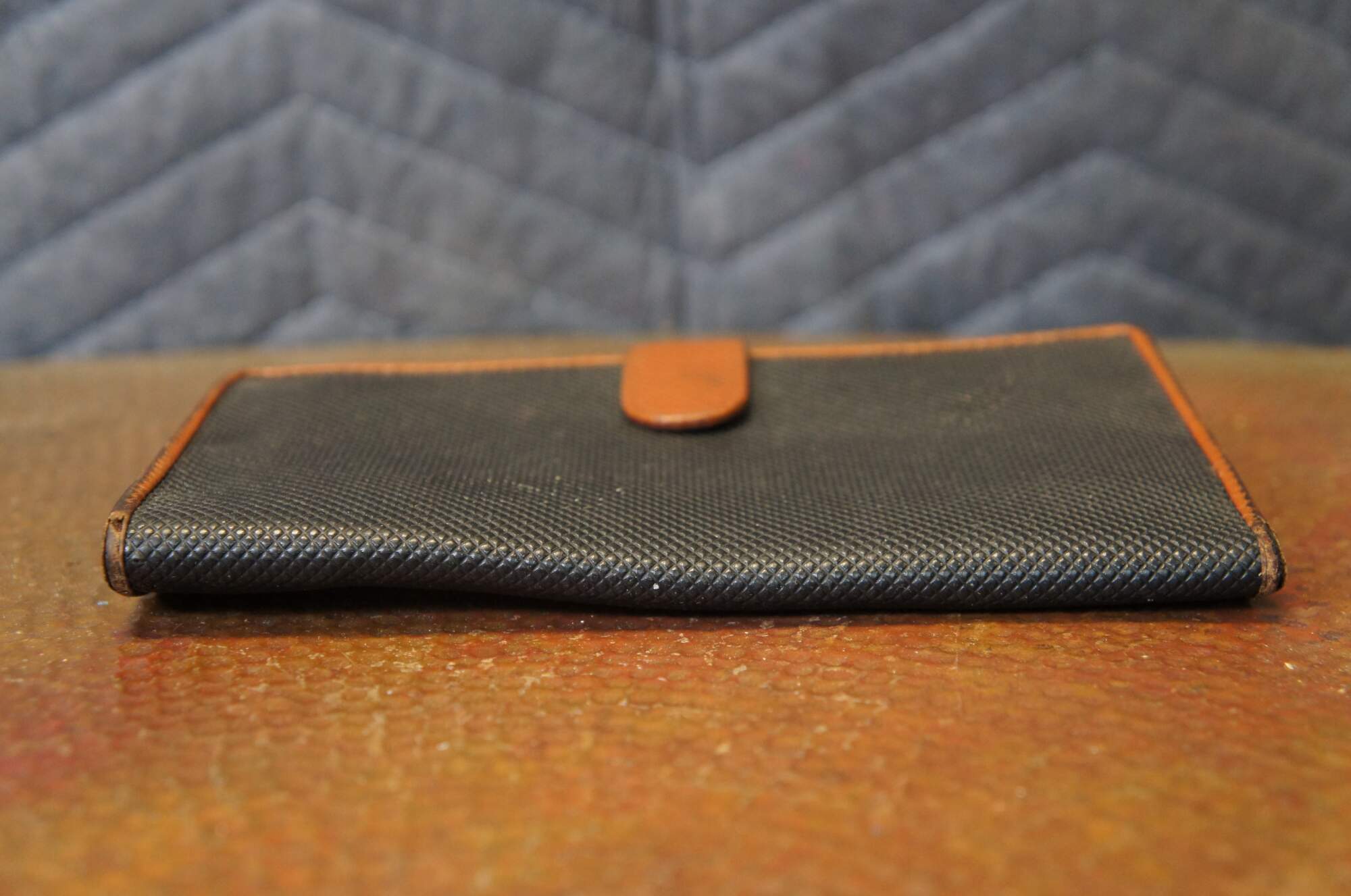 Late 20th century Bottega Veneta clutch / wallet. Black diamond textured leather with brown trim. Coin purse compartment with kiss lock clasp. Single fold main compartment with three slip pockets and eight card slots; button snap closure. Made in Italy.