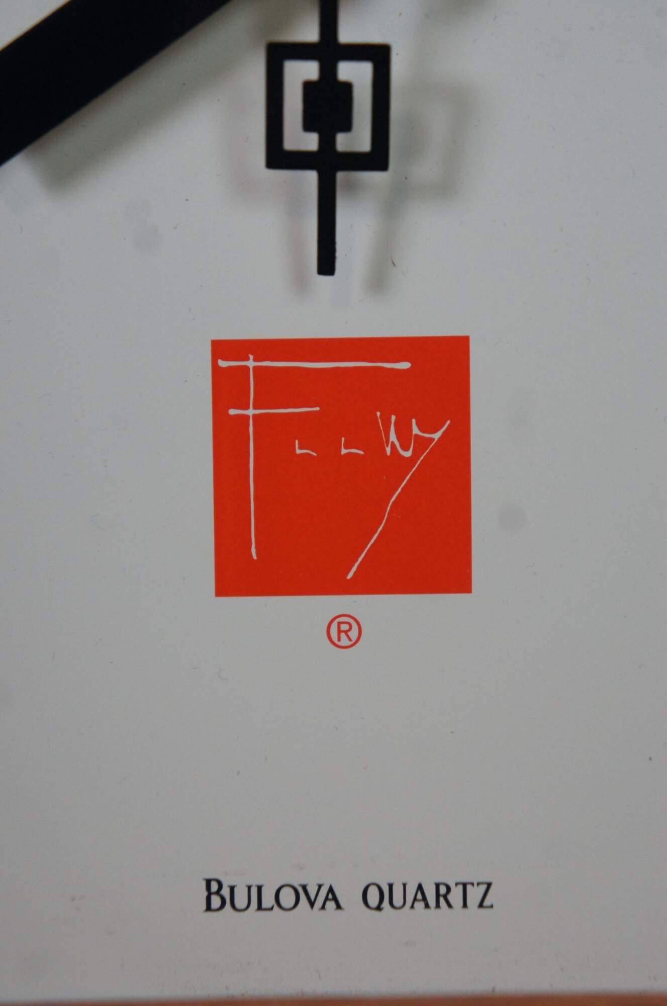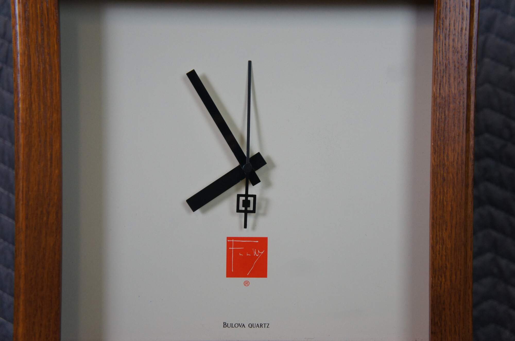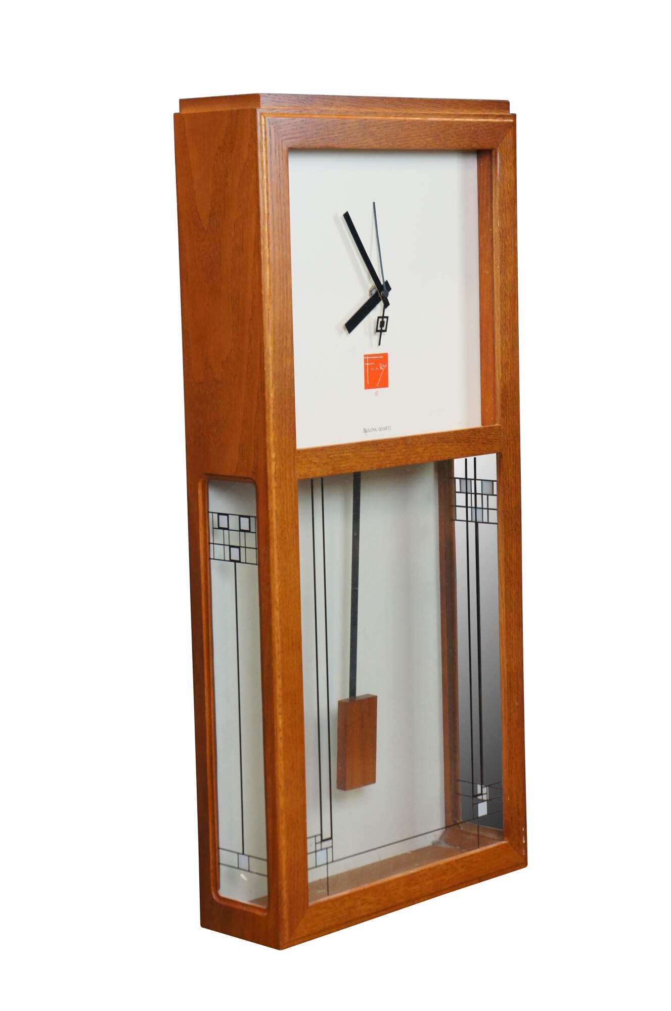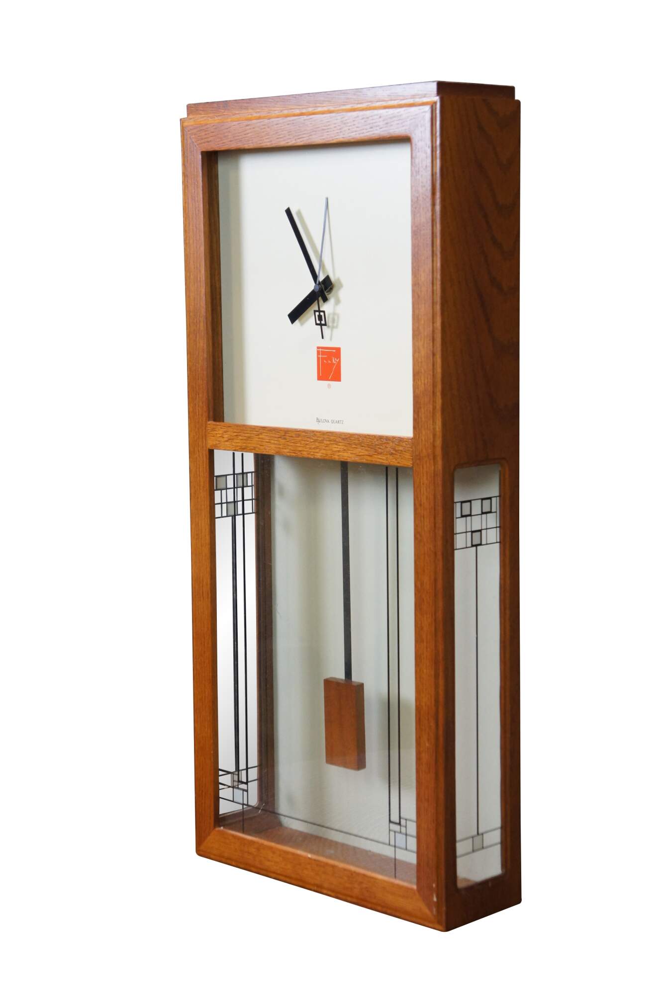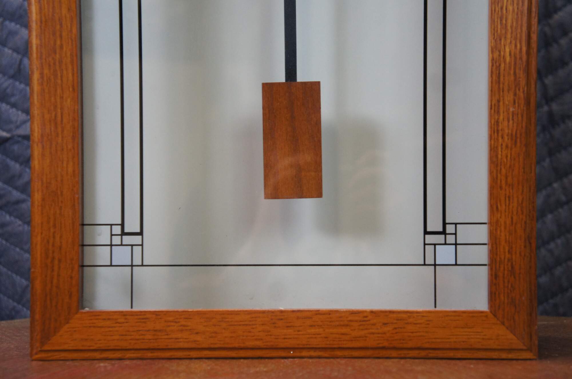 Late 20th century Bulova "Gilmore" wall clock inspired by the Prairie Style designs of American architect Frank Lloyd Wright. Rectangular wooden case with minimalist plain white face and black geometric hand, accented with a red square sporting Wright's initials. Glass front and sides painted with geometric details revealing the rectangular wood pendulum on white background. C3320 - T7 - CW112 - Movement Japan. Battery operated movement / chime.