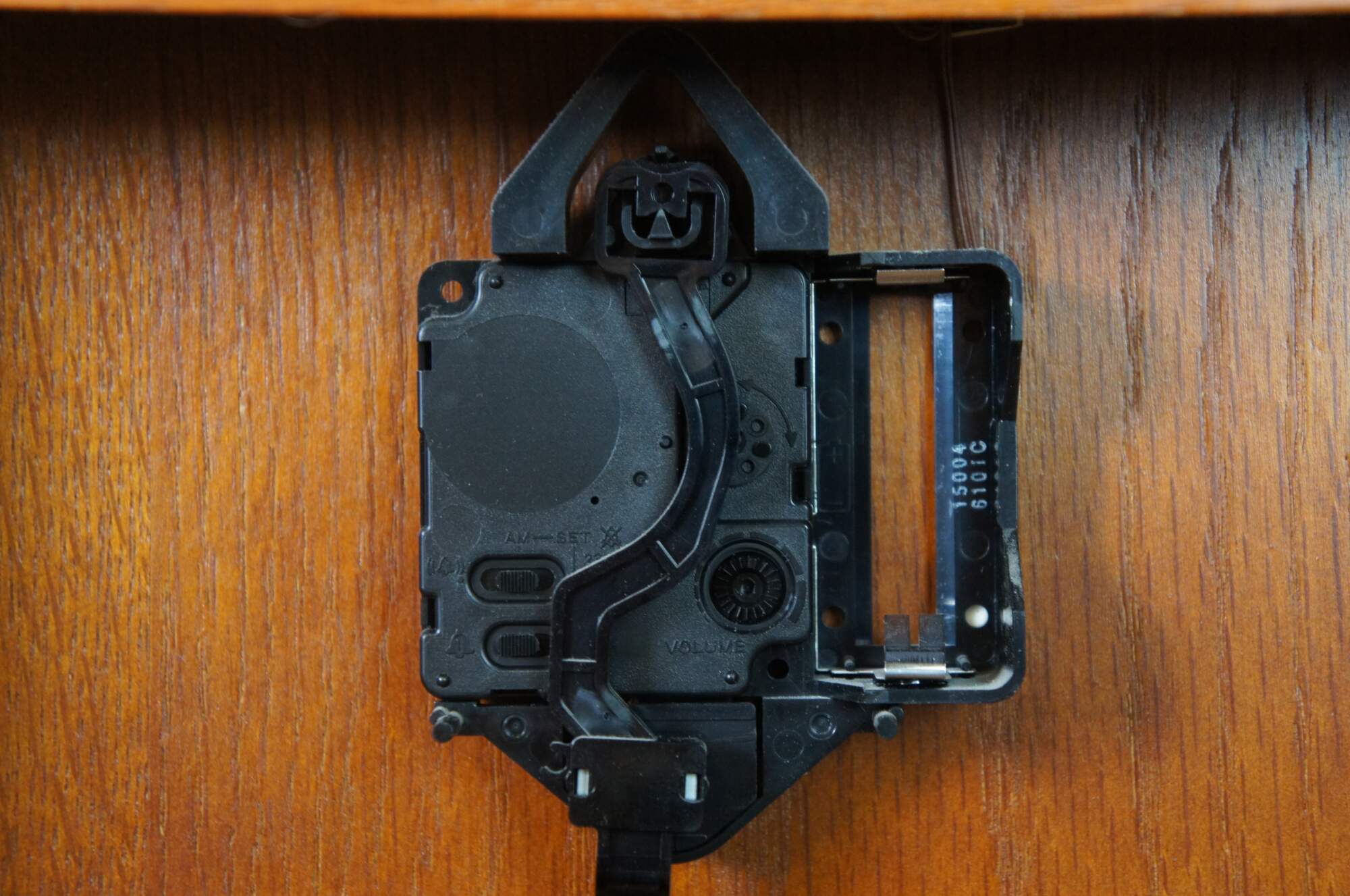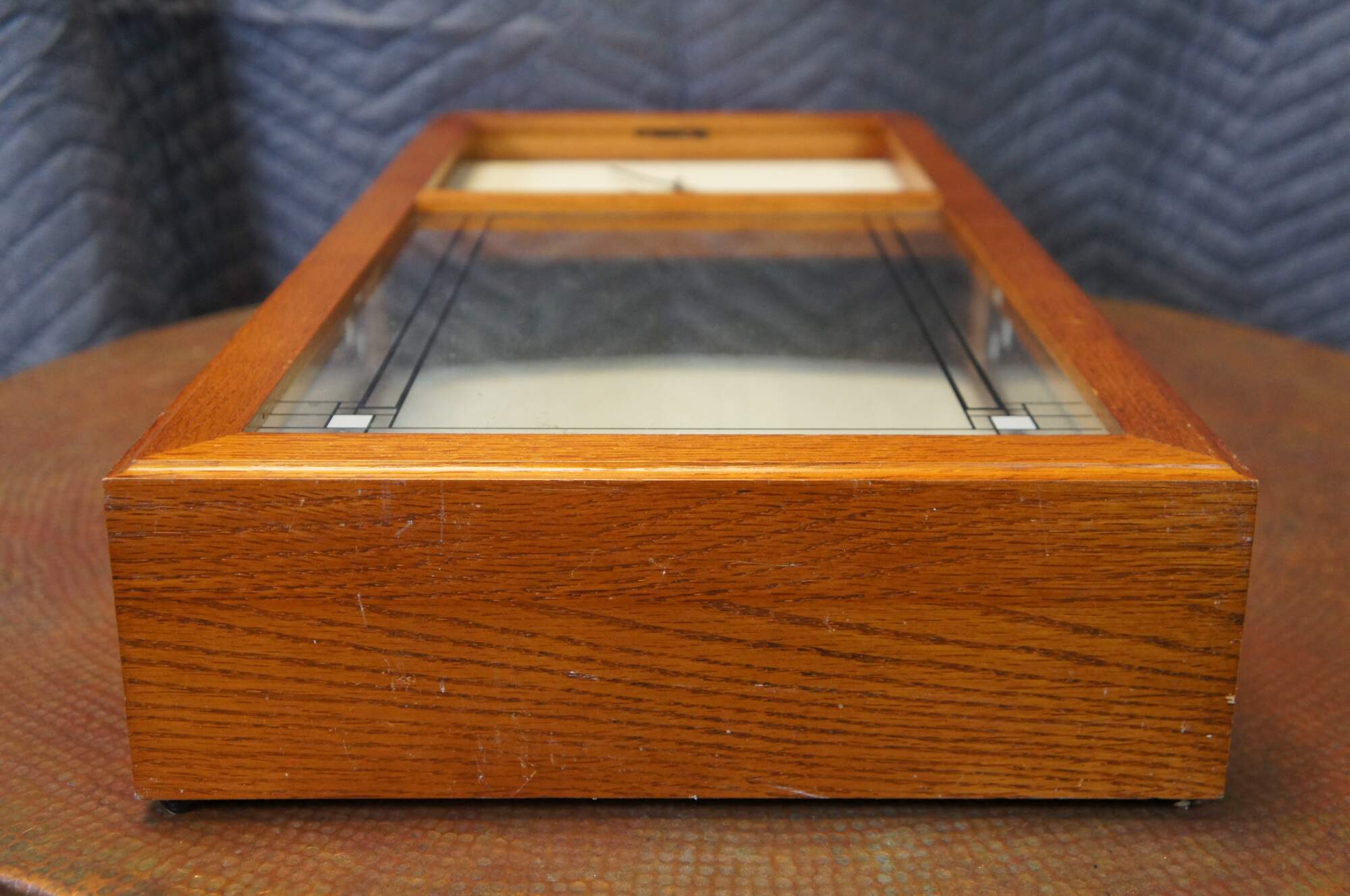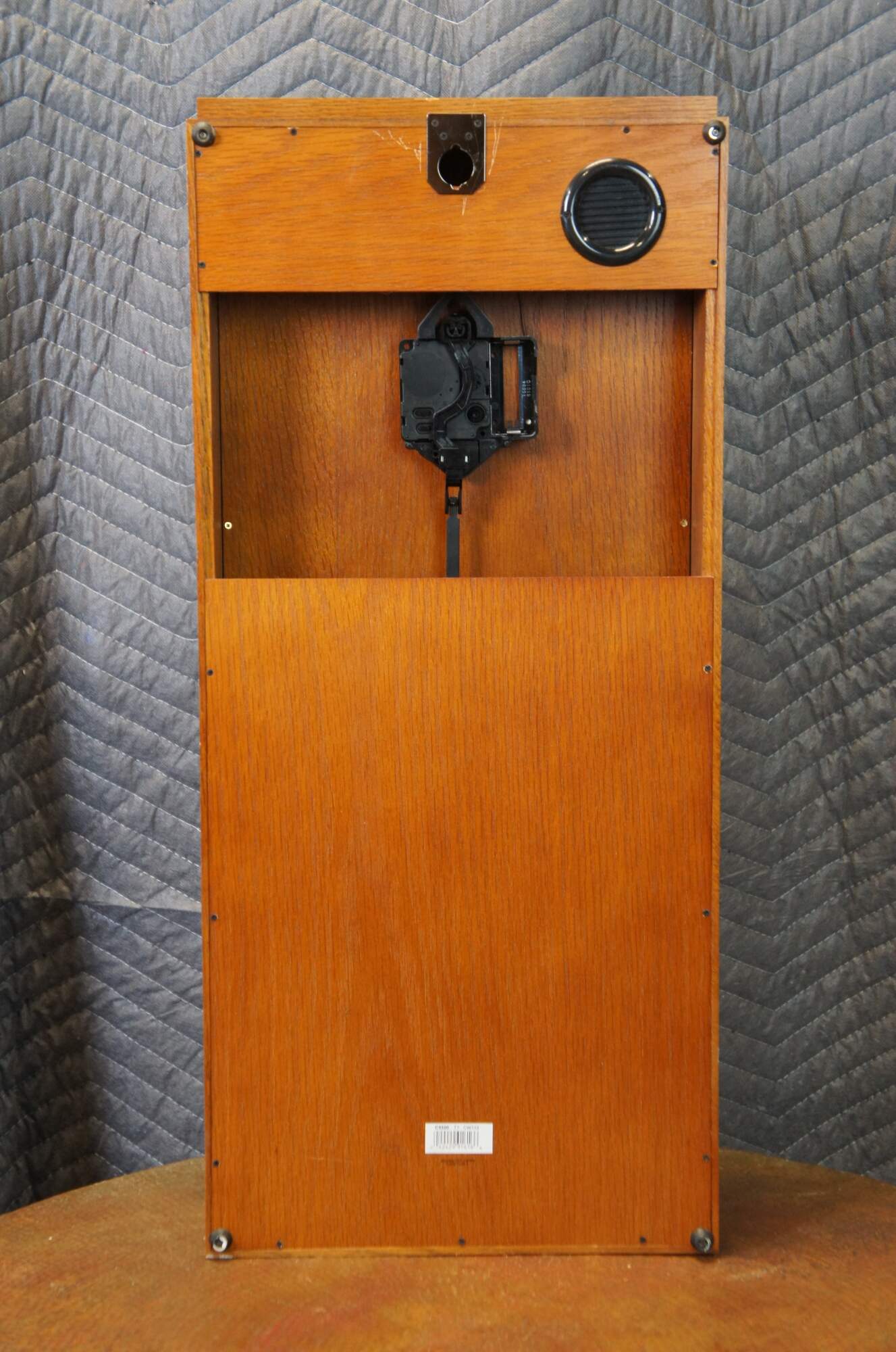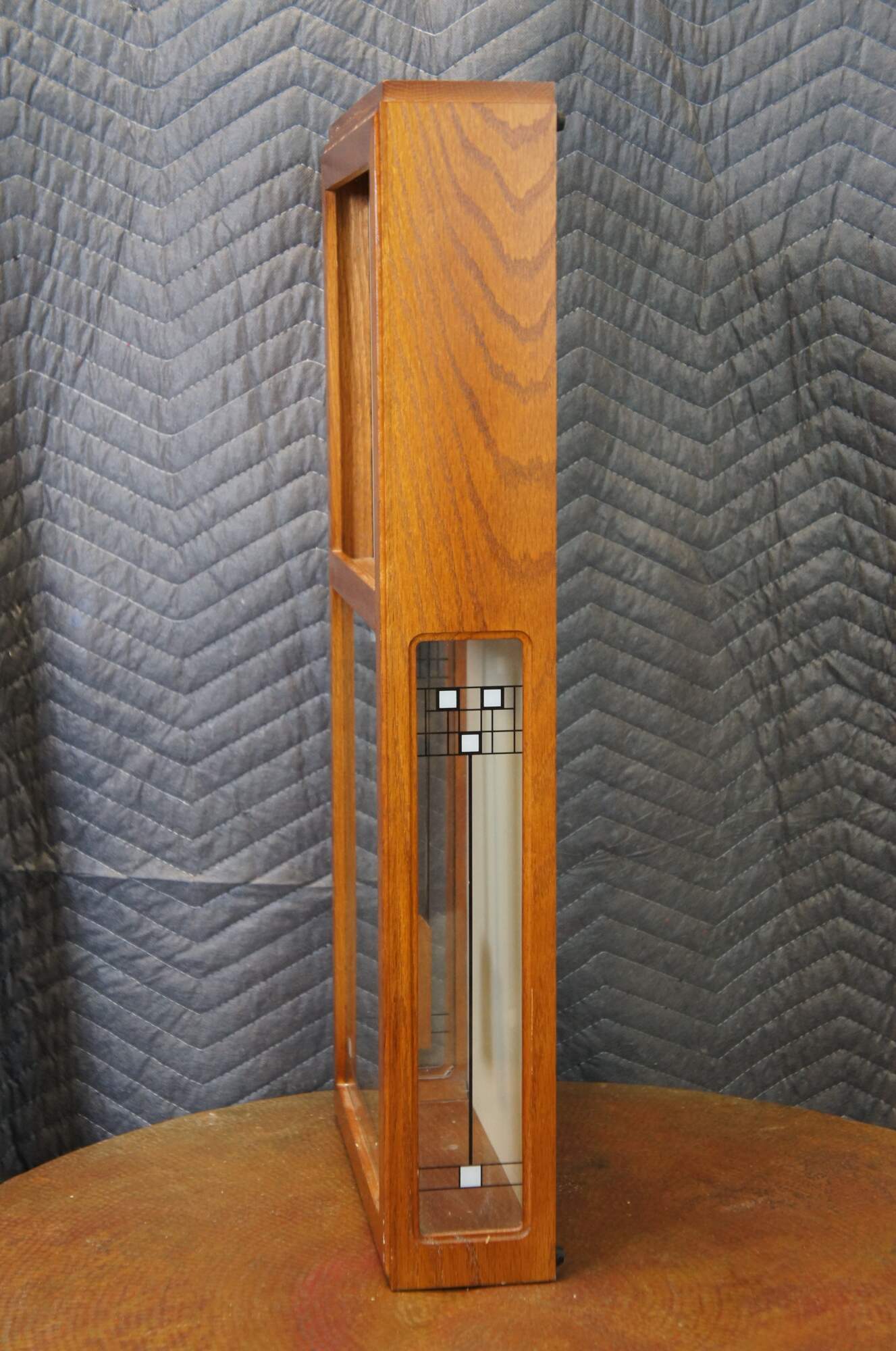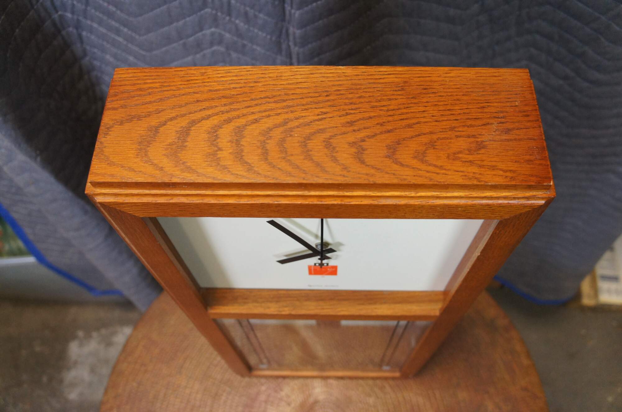 Late 20th century Bulova "Gilmore" wall clock inspired by the Prairie Style designs of American architect Frank Lloyd Wright. Rectangular wooden case with minimalist plain white face and black geometric hand, accented with a red square sporting Wright's initials. Glass front and sides painted with geometric details revealing the rectangular wood pendulum on white background. C3320 - T7 - CW112 - Movement Japan. Battery operated movement / chime.