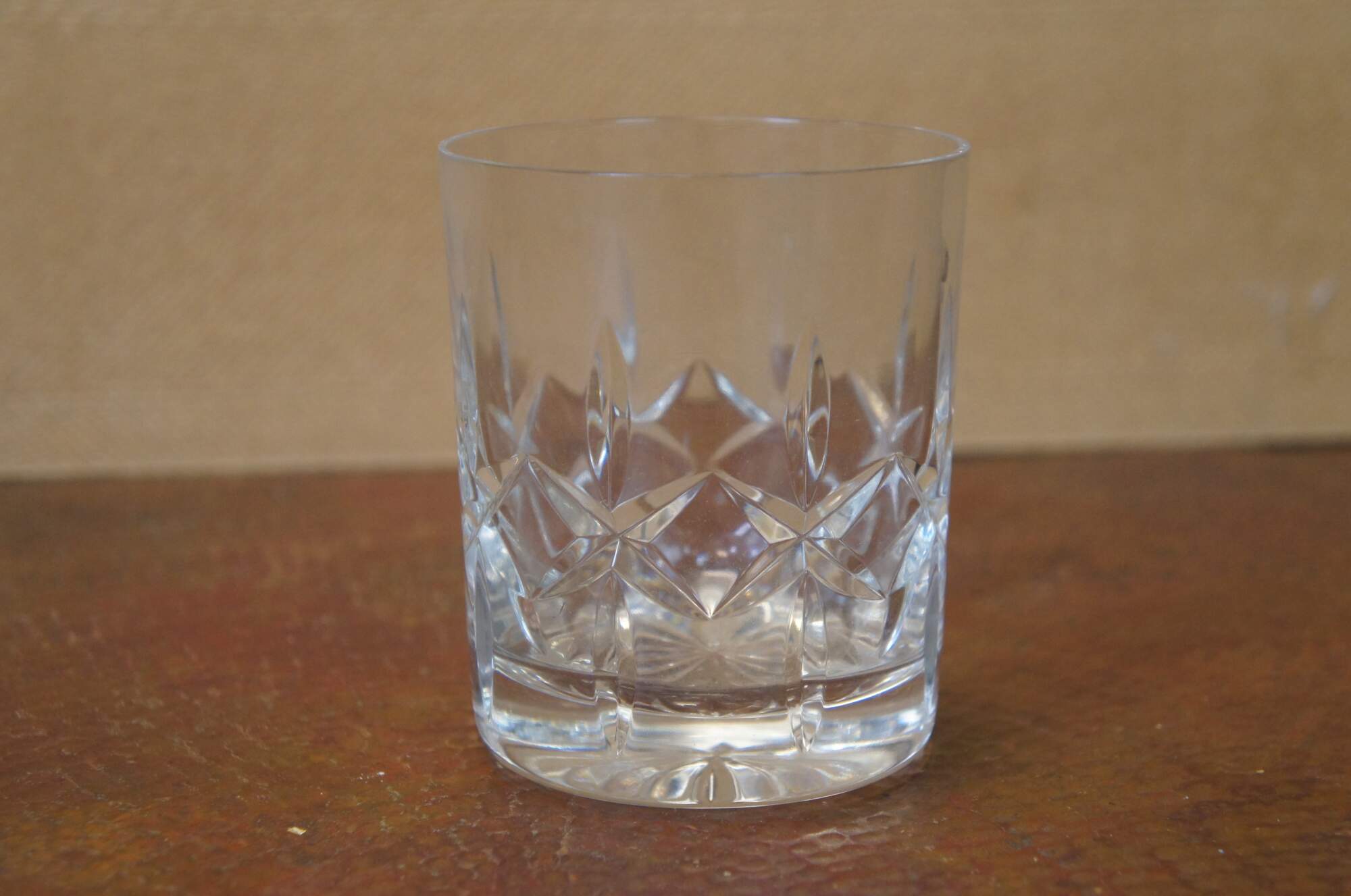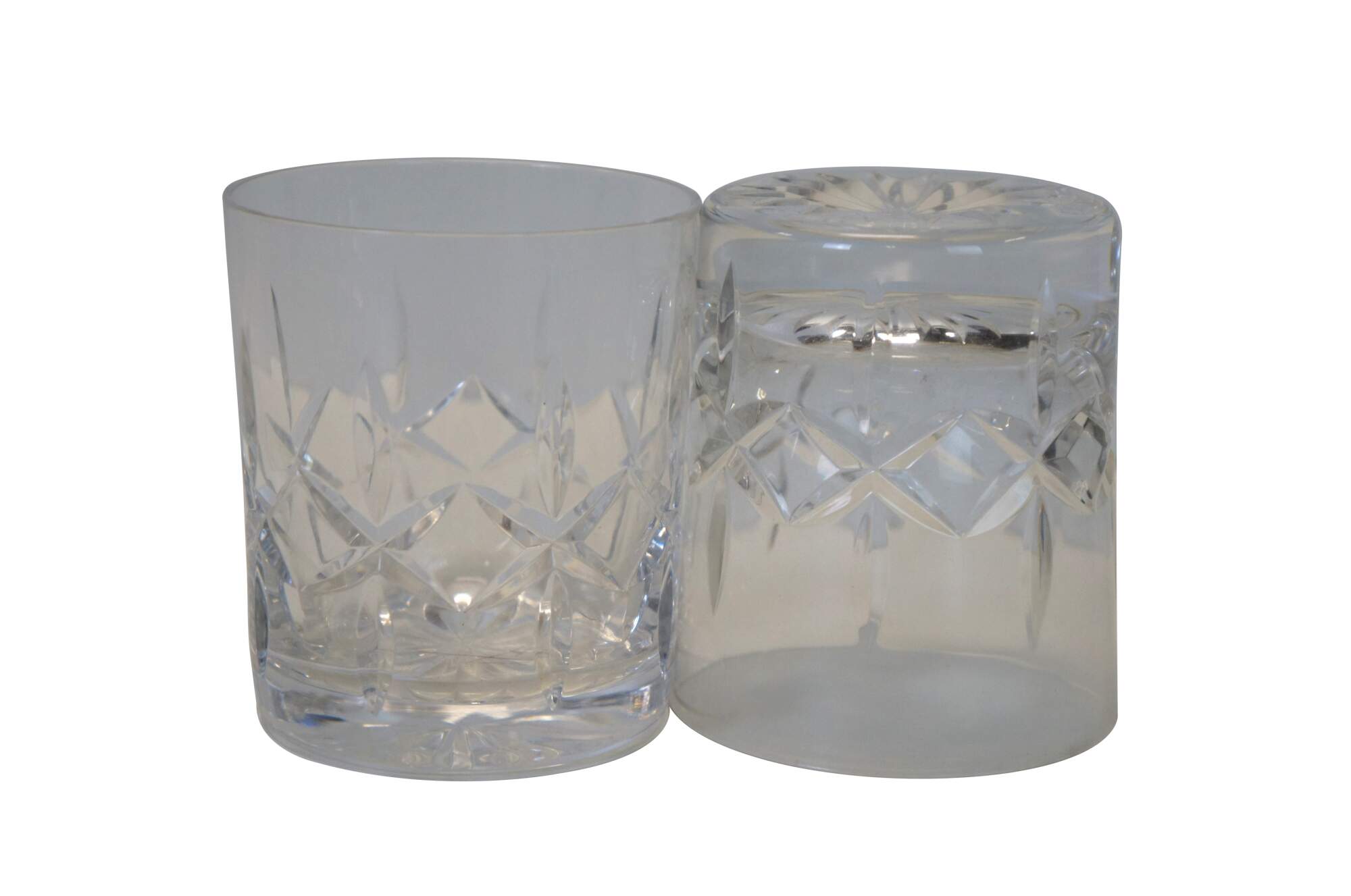 Late 20th century set of Atlantis cut crystal whiskey decanter and eight glasses. Square decanter with faceted orb stopper and eight old fashioned / lowball glasses. Marked on base.