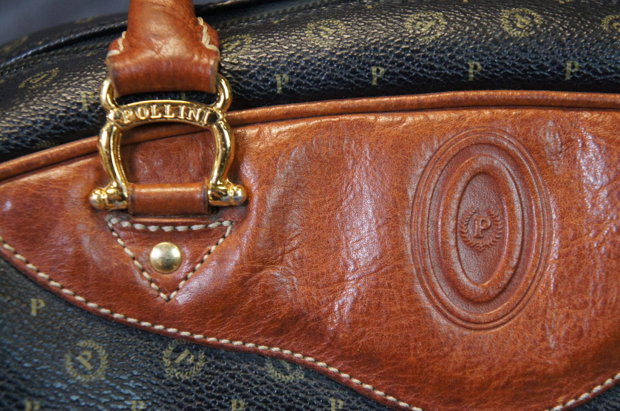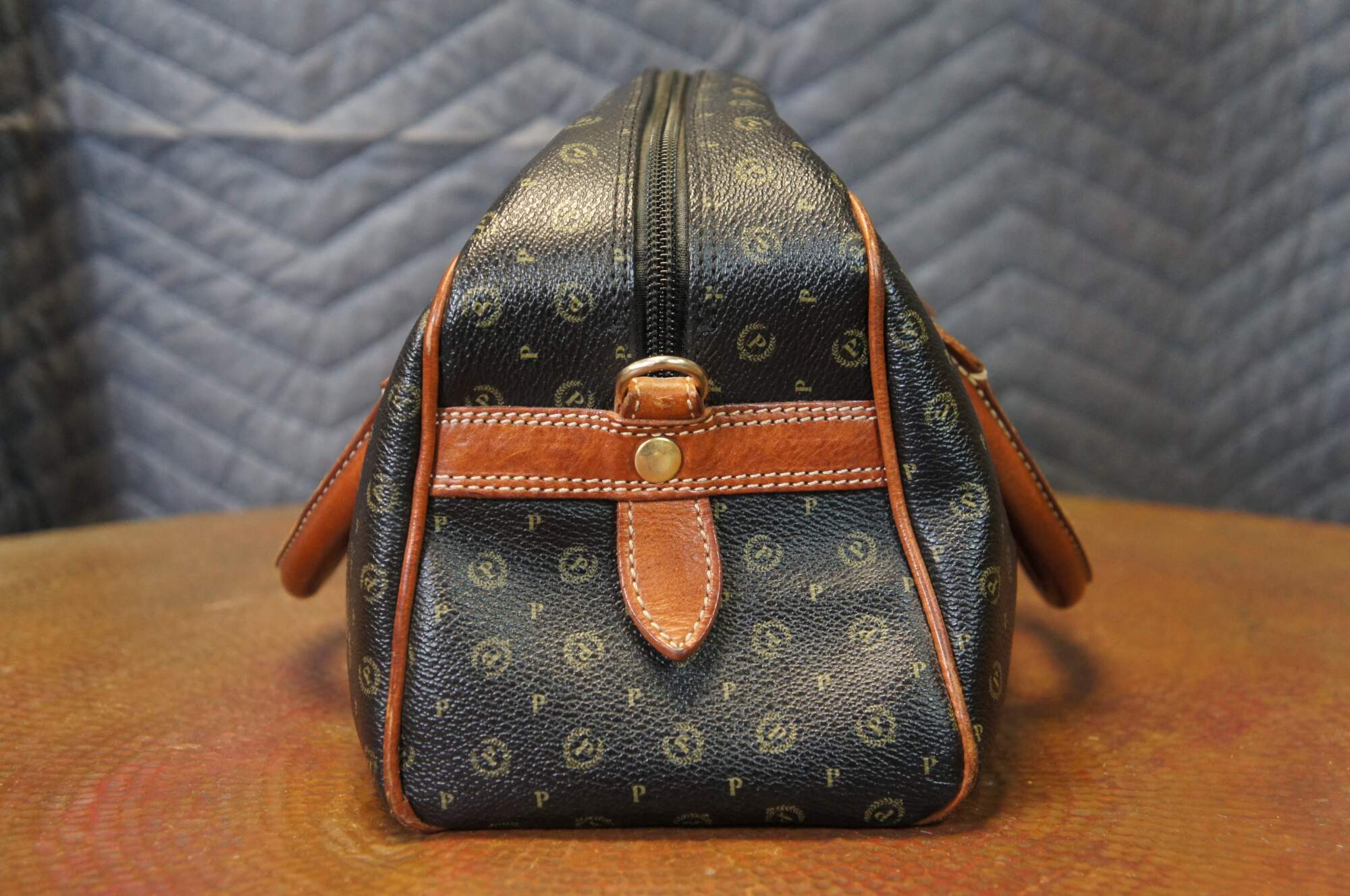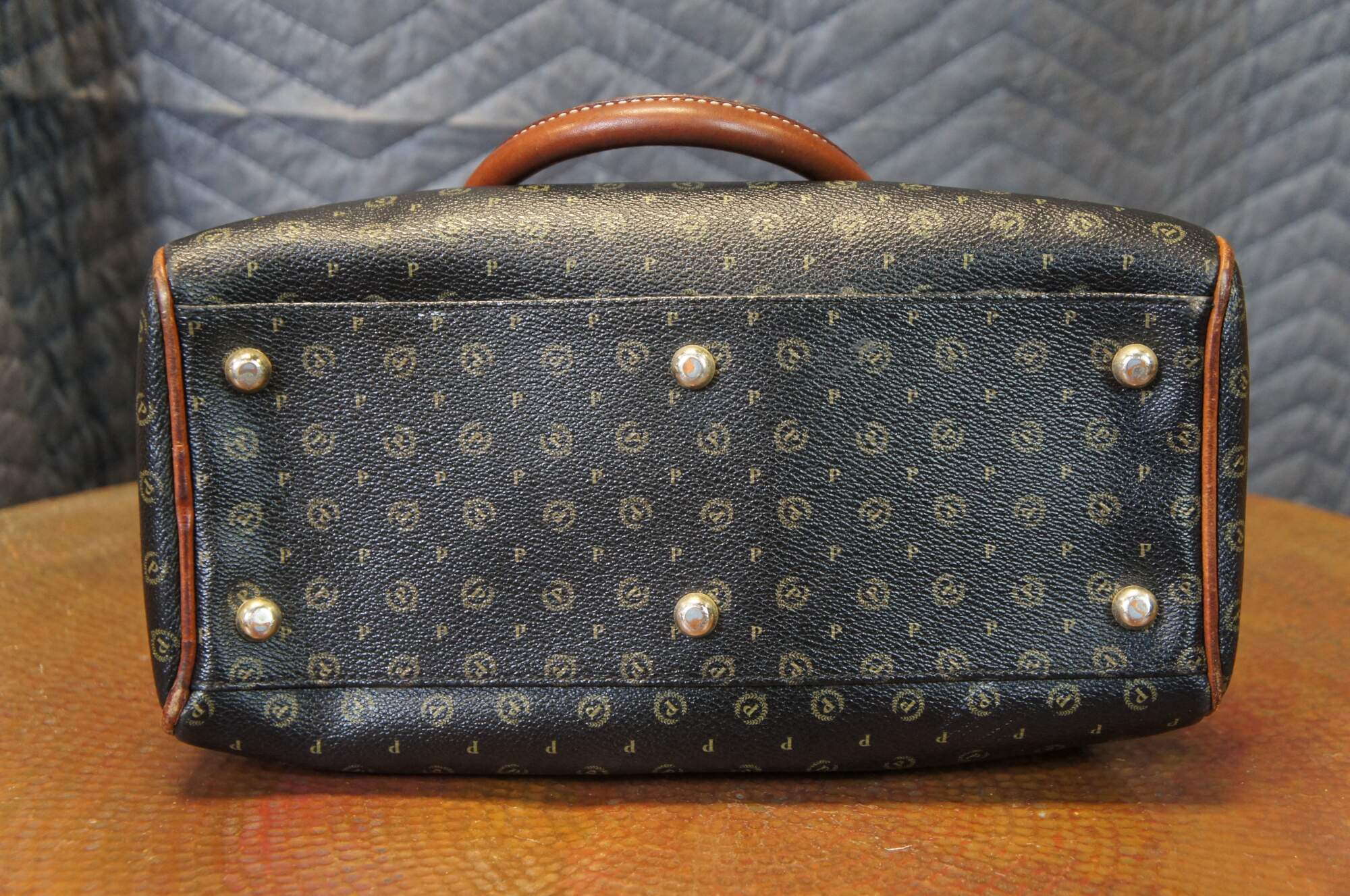 Pollini doctor's bag style handbag / purse. Black monogram leather with brown leather trim / accents. Double handles; gold tone hardware. Double pull zipper closure. Black lining. One interior zipper pocket. Number 47024957. Made in Italy.