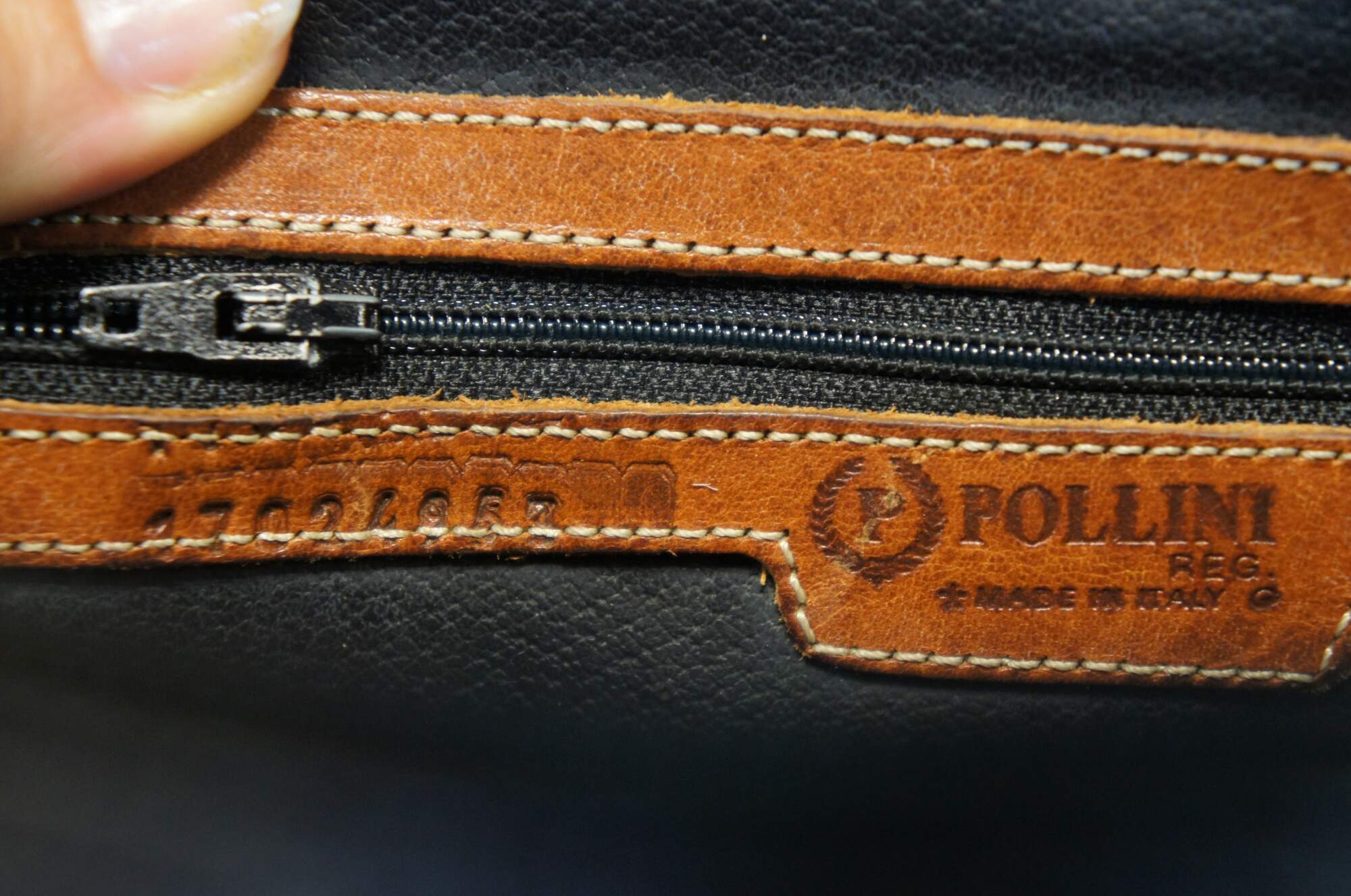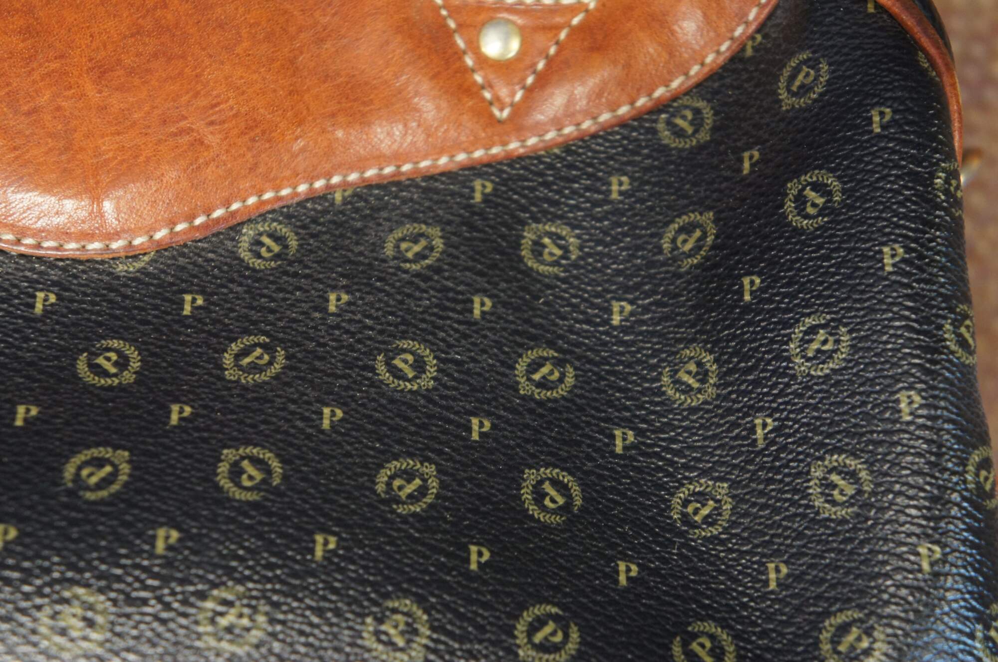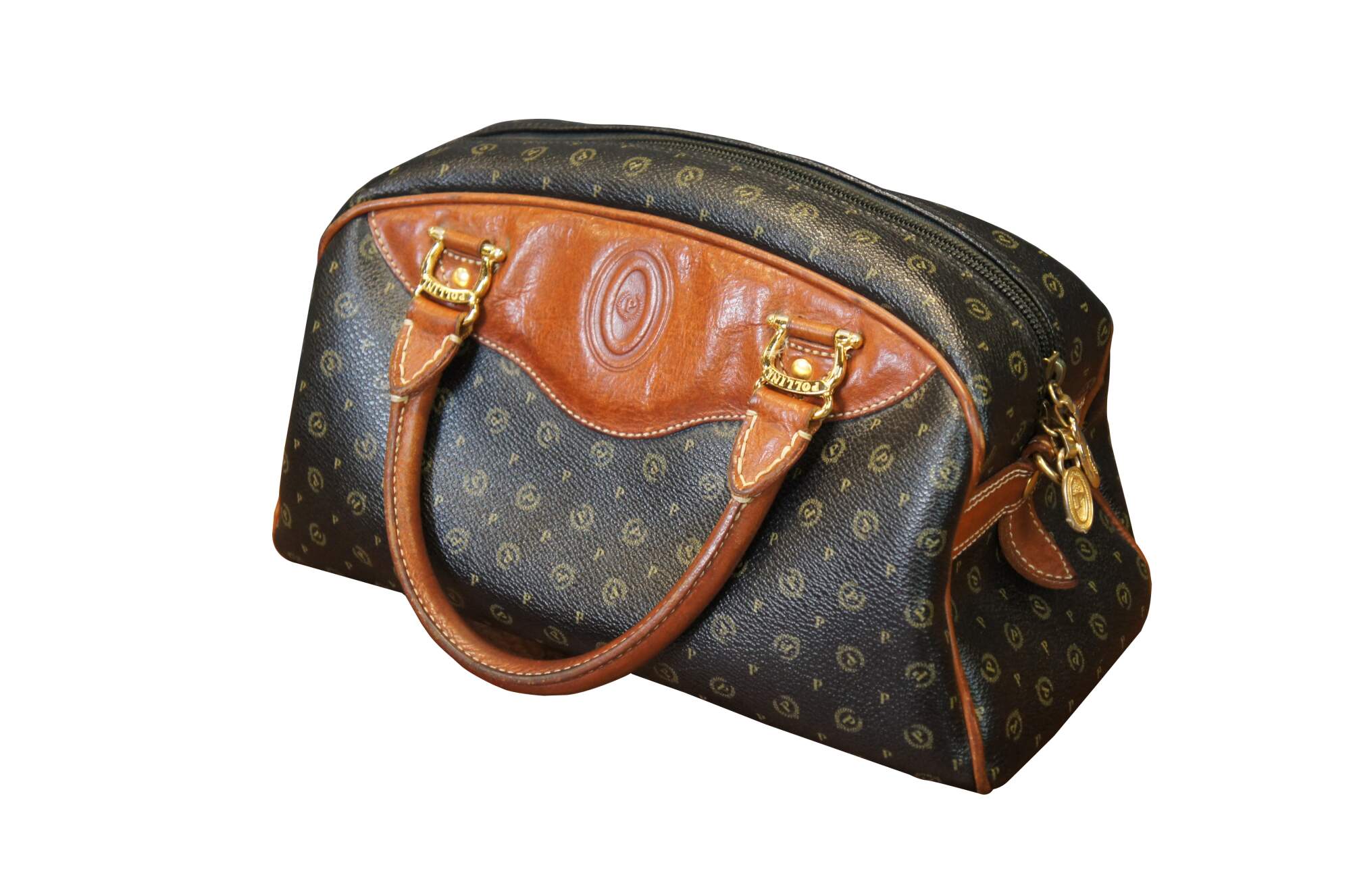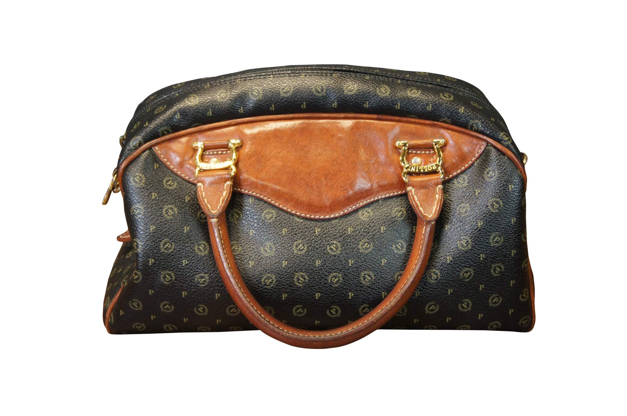 Pollini doctor's bag style handbag / purse. Black monogram leather with brown leather trim / accents. Double handles; gold tone hardware. Double pull zipper closure. Black lining. One interior zipper pocket. Number 47024957. Made in Italy.