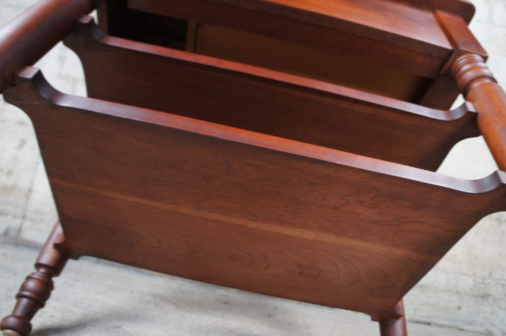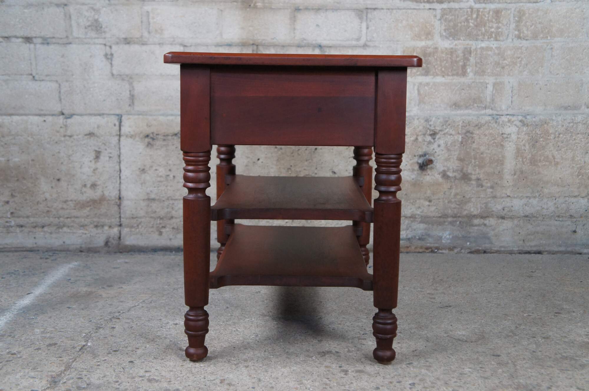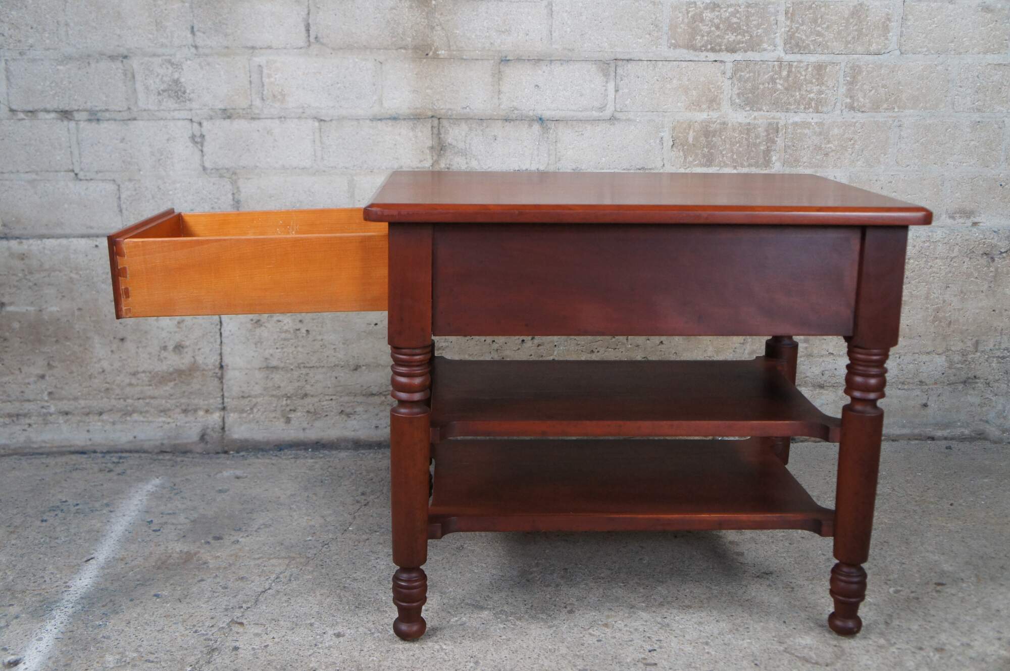 A beautiful solid cherry side table by The Sampler out of Homer, Indiana. Circa 1970s. Features a rectangular form with a dovetailed drawer within the frieze over turned and ribbed legs with two tiers. The legs taper into a turnip style foot.